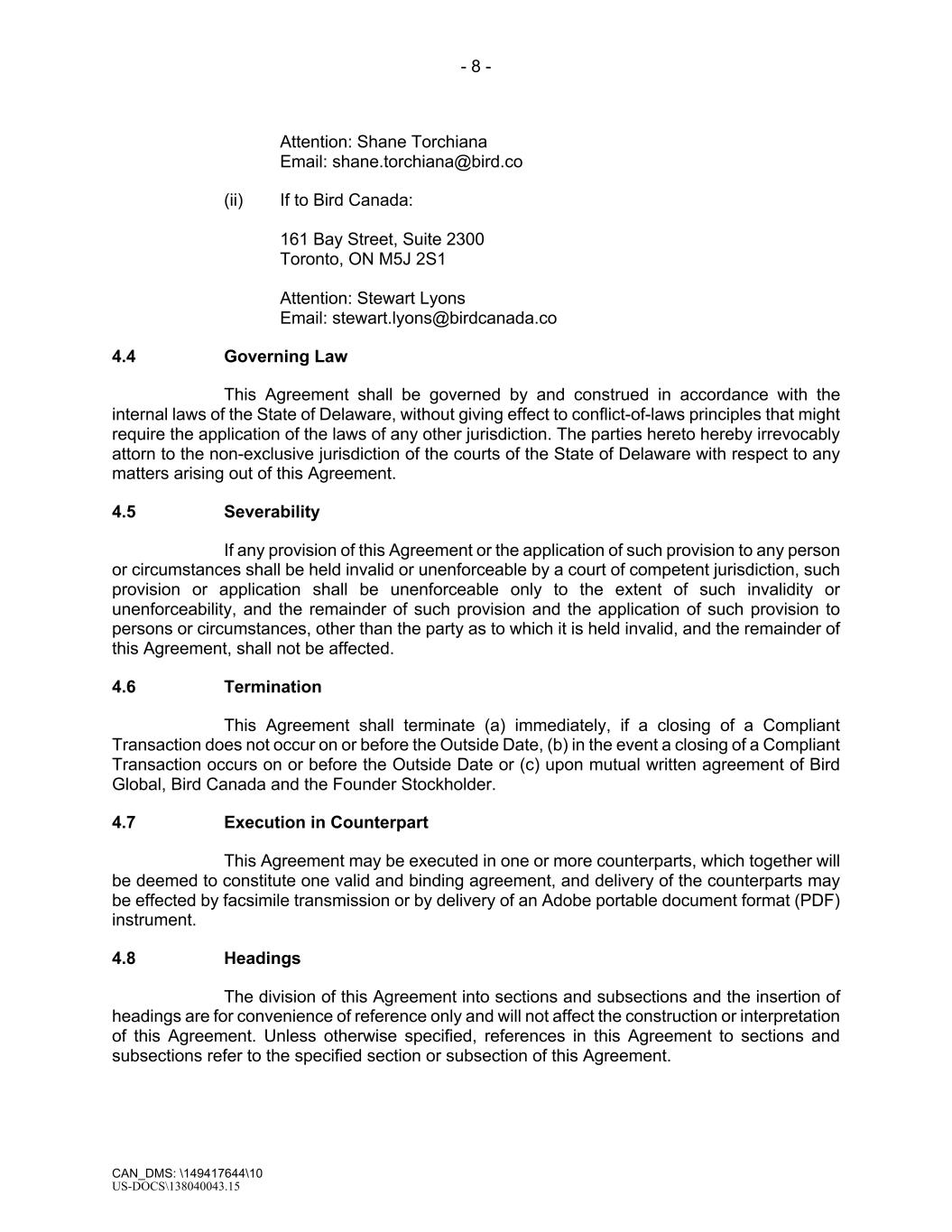 - 8 - US-DOCS\138040043.15 CAN_DMS: \149417644\10 Attention: Shane Torchiana Email: shane.torchiana@bird.co (ii) If to Bird Canada: 161 Bay Street, Suite 2300 Toronto, ON M5J 2S1 Attention: Stewart Lyons Email: stewart.lyons@birdcanada.co 4.4 Governing Law This Agreement shall be governed by and construed in accordance with the internal laws of the State of Delaware, without giving effect to conflict-of-laws principles that might require the application of the laws of any other jurisdiction. The parties hereto hereby irrevocably attorn to the non-exclusive jurisdiction of the courts of the State of Delaware with respect to any matters arising out of this Agreement. 4.5 Severability If any provision of this Agreement or the application of such provision to any person or circumstances shall be held invalid or unenforceable by a court of competent jurisdiction, such provision or application shall be unenforceable only to the extent of such invalidity or unenforceability, and the remainder of such provision and the application of such provision to persons or circumstances, other than the party as to which it is held invalid, and the remainder of this Agreement, shall not be affected. 4.6 Termination This Agreement shall terminate (a) immediately, if a closing of a Compliant Transaction does not occur on or before the Outside Date, (b) in the event a closing of a Compliant Transaction occurs on or before the Outside Date or (c) upon mutual written agreement of Bird Global, Bird Canada and the Founder Stockholder. 4.7 Execution in Counterpart This Agreement may be executed in one or more counterparts, which together will be deemed to constitute one valid and binding agreement, and delivery of the counterparts may be effected by facsimile transmission or by delivery of an Adobe portable document format (PDF) instrument. 4.8 Headings The division of this Agreement into sections and subsections and the insertion of headings are for convenience of reference only and will not affect the construction or interpretation of this Agreement. Unless otherwise specified, references in this Agreement to sections and subsections refer to the specified section or subsection of this Agreement.