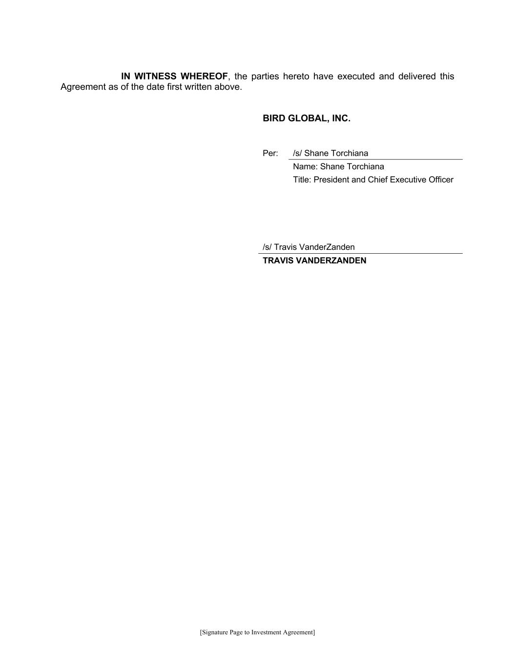 [Signature Page to Investment Agreement] IN WITNESS WHEREOF, the parties hereto have executed and delivered this Agreement as of the date first written above. BIRD GLOBAL, INC. Per: /s/ Shane Torchiana Name: Shane Torchiana Title: President and Chief Executive Officer /s/ Travis VanderZanden TRAVIS VANDERZANDEN