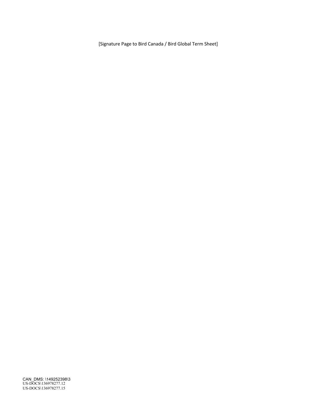 US-DOCS\136978277.12 US-DOCS\136978277.15 CAN_DMS: \149252398\3 IN WITNESS WHEREOF, the parties have executed this non-binding term sheet as of the last date set forth below. BIRD CANADA, INC. By: /s/ John Bitove Name: John Bitove Title: Chairman Date: December 19, 2022 BIRD GLOBAL, INC. By: /s/ Shane Torchiana Name: Shane Torchiana Title: Chief Executive Officer Date: December 19, 2022