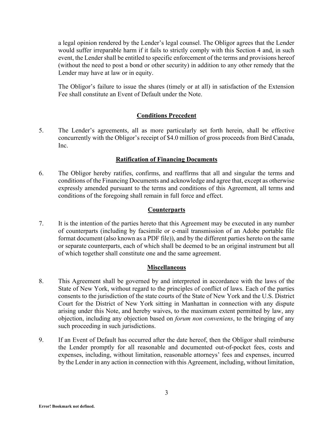 3 Error! Bookmark not defined. a legal opinion rendered by the Lender’s legal counsel. The Obligor agrees that the Lender would suffer irreparable harm if it fails to strictly comply with this Section 4 and, in such event, the Lender shall be entitled to specific enforcement of the terms and provisions hereof (without the need to post a bond or other security) in addition to any other remedy that the Lender may have at law or in equity. The Obligor’s failure to issue the shares (timely or at all) in satisfaction of the Extension Fee shall constitute an Event of Default under the Note. Conditions Precedent 5. The Lender’s agreements, all as more particularly set forth herein, shall be effective concurrently with the Obligor’s receipt of $4.0 million of gross proceeds from Bird Canada, Inc. Ratification of Financing Documents 6. The Obligor hereby ratifies, confirms, and reaffirms that all and singular the terms and conditions of the Financing Documents and acknowledge and agree that, except as otherwise expressly amended pursuant to the terms and conditions of this Agreement, all terms and conditions of the foregoing shall remain in full force and effect. Counterparts 7. It is the intention of the parties hereto that this Agreement may be executed in any number of counterparts (including by facsimile or e-mail transmission of an Adobe portable file format document (also known as a PDF file)), and by the different parties hereto on the same or separate counterparts, each of which shall be deemed to be an original instrument but all of which together shall constitute one and the same agreement. Miscellaneous 8. This Agreement shall be governed by and interpreted in accordance with the laws of the State of New York, without regard to the principles of conflict of laws. Each of the parties consents to the jurisdiction of the state courts of the State of New York and the U.S. District Court for the District of New York sitting in Manhattan in connection with any dispute arising under this Note, and hereby waives, to the maximum extent permitted by law, any objection, including any objection based on forum non conveniens, to the bringing of any such proceeding in such jurisdictions. 9. If an Event of Default has occurred after the date hereof, then the Obligor shall reimburse the Lender promptly for all reasonable and documented out-of-pocket fees, costs and expenses, including, without limitation, reasonable attorneys’ fees and expenses, incurred by the Lender in any action in connection with this Agreement, including, without limitation,