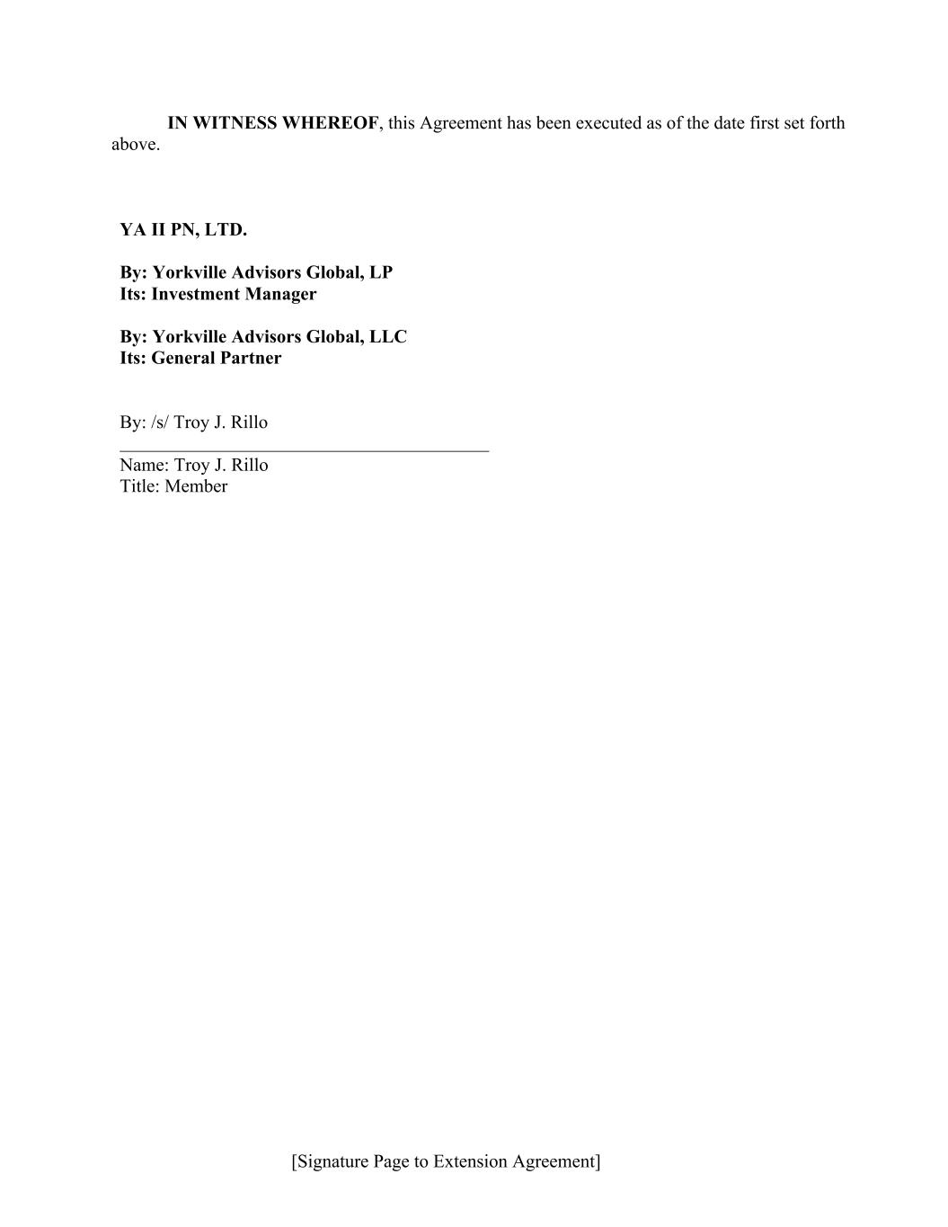 [Signature Page to Extension Agreement] IN WITNESS WHEREOF, this Agreement has been executed as of the date first set forth above. YA II PN, LTD. By: Yorkville Advisors Global, LP Its: Investment Manager By: Yorkville Advisors Global, LLC Its: General Partner By: /s/ Troy J. Rillo Name: Troy J. Rillo Title: Member