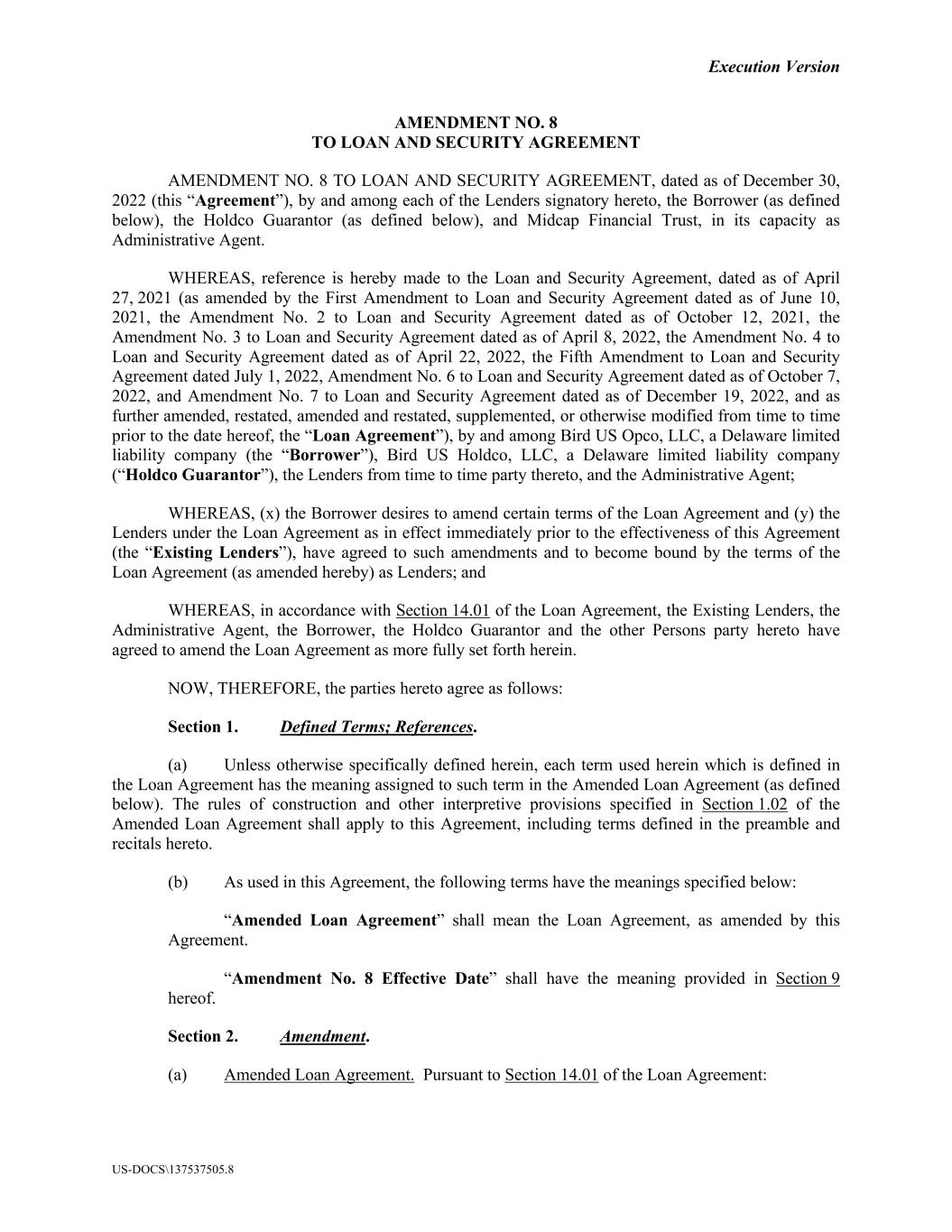 Execution Version US-DOCS\137537505.8 AMENDMENT NO. 8 TO LOAN AND SECURITY AGREEMENT AMENDMENT NO. 8 TO LOAN AND SECURITY AGREEMENT, dated as of December 30, 2022 (this “Agreement”), by and among each of the Lenders signatory hereto, the Borrower (as defined below), the Holdco Guarantor (as defined below), and Midcap Financial Trust, in its capacity as Administrative Agent. WHEREAS, reference is hereby made to the Loan and Security Agreement, dated as of April 27, 2021 (as amended by the First Amendment to Loan and Security Agreement dated as of June 10, 2021, the Amendment No. 2 to Loan and Security Agreement dated as of October 12, 2021, the Amendment No. 3 to Loan and Security Agreement dated as of April 8, 2022, the Amendment No. 4 to Loan and Security Agreement dated as of April 22, 2022, the Fifth Amendment to Loan and Security Agreement dated July 1, 2022, Amendment No. 6 to Loan and Security Agreement dated as of October 7, 2022, and Amendment No. 7 to Loan and Security Agreement dated as of December 19, 2022, and as further amended, restated, amended and restated, supplemented, or otherwise modified from time to time prior to the date hereof, the “Loan Agreement”), by and among Bird US Opco, LLC, a Delaware limited liability company (the “Borrower”), Bird US Holdco, LLC, a Delaware limited liability company (“Holdco Guarantor”), the Lenders from time to time party thereto, and the Administrative Agent; WHEREAS, (x) the Borrower desires to amend certain terms of the Loan Agreement and (y) the Lenders under the Loan Agreement as in effect immediately prior to the effectiveness of this Agreement (the “Existing Lenders”), have agreed to such amendments and to become bound by the terms of the Loan Agreement (as amended hereby) as Lenders; and WHEREAS, in accordance with Section 14.01 of the Loan Agreement, the Existing Lenders, the Administrative Agent, the Borrower, the Holdco Guarantor and the other Persons party hereto have agreed to amend the Loan Agreement as more fully set forth herein. NOW, THEREFORE, the parties hereto agree as follows: Section 1. Defined Terms; References. (a) Unless otherwise specifically defined herein, each term used herein which is defined in the Loan Agreement has the meaning assigned to such term in the Amended Loan Agreement (as defined below). The rules of construction and other interpretive provisions specified in Section 1.02 of the Amended Loan Agreement shall apply to this Agreement, including terms defined in the preamble and recitals hereto. (b) As used in this Agreement, the following terms have the meanings specified below: “Amended Loan Agreement” shall mean the Loan Agreement, as amended by this Agreement. “Amendment No. 8 Effective Date” shall have the meaning provided in Section 9 hereof. Section 2. Amendment. (a) Amended Loan Agreement. Pursuant to Section 14.01 of the Loan Agreement:
