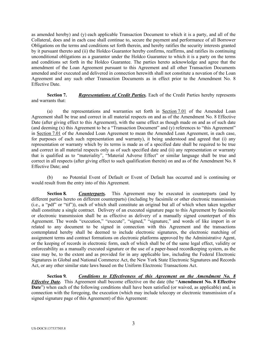 3 US-DOCS\137537505.8 as amended hereby) and (y) each applicable Transaction Document to which it is a party, and all of the Collateral, does and in each case shall continue to, secure the payment and performance of all Borrower Obligations on the terms and conditions set forth therein, and hereby ratifies the security interests granted by it pursuant thereto and (ii) the Holdco Guarantor hereby confirms, reaffirms, and ratifies its continuing unconditional obligations as a guarantor under the Holdco Guarantee to which it is a party on the terms and conditions set forth in the Holdco Guarantee. The parties hereto acknowledge and agree that the amendment of the Loan Agreement pursuant to this Agreement and all other Transaction Documents amended and/or executed and delivered in connection herewith shall not constitute a novation of the Loan Agreement and any such other Transaction Documents as in effect prior to the Amendment No. 8 Effective Date. Section 7. Representations of Credit Parties. Each of the Credit Parties hereby represents and warrants that: (a) the representations and warranties set forth in Section 7.01 of the Amended Loan Agreement shall be true and correct in all material respects on and as of the Amendment No. 8 Effective Date (after giving effect to this Agreement), with the same effect as though made on and as of such date (and deeming (x) this Agreement to be a “Transaction Document” and (y) references to “this Agreement” in Section 7.01 of the Amended Loan Agreement to mean the Amended Loan Agreement, in each case, for purposes of each such representation and warranty), it being understood and agreed that (i) any representation or warranty which by its terms is made as of a specified date shall be required to be true and correct in all material respects only as of such specified date and (ii) any representation or warranty that is qualified as to “materiality”, “Material Adverse Effect” or similar language shall be true and correct in all respects (after giving effect to such qualification therein) on and as of the Amendment No. 8 Effective Date; and (b) no Potential Event of Default or Event of Default has occurred and is continuing or would result from the entry into of this Agreement. Section 8. Counterparts. This Agreement may be executed in counterparts (and by different parties hereto on different counterparts) (including by facsimile or other electronic transmission (i.e., a “pdf” or “tif”)), each of which shall constitute an original but all of which when taken together shall constitute a single contract. Delivery of an executed signature page to this Agreement by facsimile or electronic transmission shall be as effective as delivery of a manually signed counterpart of this Agreement. The words “execution,” “execute”, “signed,” “signature,” and words of like import in or related to any document to be signed in connection with this Agreement and the transactions contemplated hereby shall be deemed to include electronic signatures, the electronic matching of assignment terms and contract formations on electronic platforms approved by the Administrative Agent, or the keeping of records in electronic form, each of which shall be of the same legal effect, validity or enforceability as a manually executed signature or the use of a paper-based recordkeeping system, as the case may be, to the extent and as provided for in any applicable law, including the Federal Electronic Signatures in Global and National Commerce Act, the New York State Electronic Signatures and Records Act, or any other similar state laws based on the Uniform Electronic Transactions Act. Section 9. Conditions to Effectiveness of this Agreement on the Amendment No. 8 Effective Date. This Agreement shall become effective on the date (the “Amendment No. 8 Effective Date”) when each of the following conditions shall have been satisfied (or waived, as applicable) and, in connection with the foregoing, the execution (which may include telecopy or electronic transmission of a signed signature page of this Agreement) of this Agreement:
