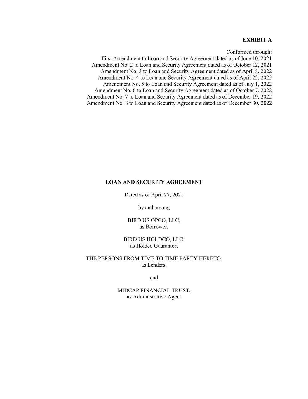 EXHIBIT A Conformed through: First Amendment to Loan and Security Agreement dated as of June 10, 2021 Amendment No. 2 to Loan and Security Agreement dated as of October 12, 2021 Amendment No. 3 to Loan and Security Agreement dated as of April 8, 2022 Amendment No. 4 to Loan and Security Agreement dated as of April 22, 2022 Amendment No. 5 to Loan and Security Agreement dated as of July 1, 2022 Amendment No. 6 to Loan and Security Agreement dated as of October 7, 2022 Amendment No. 7 to Loan and Security Agreement dated as of December 19, 2022 Amendment No. 8 to Loan and Security Agreement dated as of December 30, 2022 LOAN AND SECURITY AGREEMENT Dated as of April 27, 2021 by and among BIRD US OPCO, LLC, as Borrower, BIRD US HOLDCO, LLC, as Holdco Guarantor, THE PERSONS FROM TIME TO TIME PARTY HERETO, as Lenders, and MIDCAP FINANCIAL TRUST, as Administrative Agent
