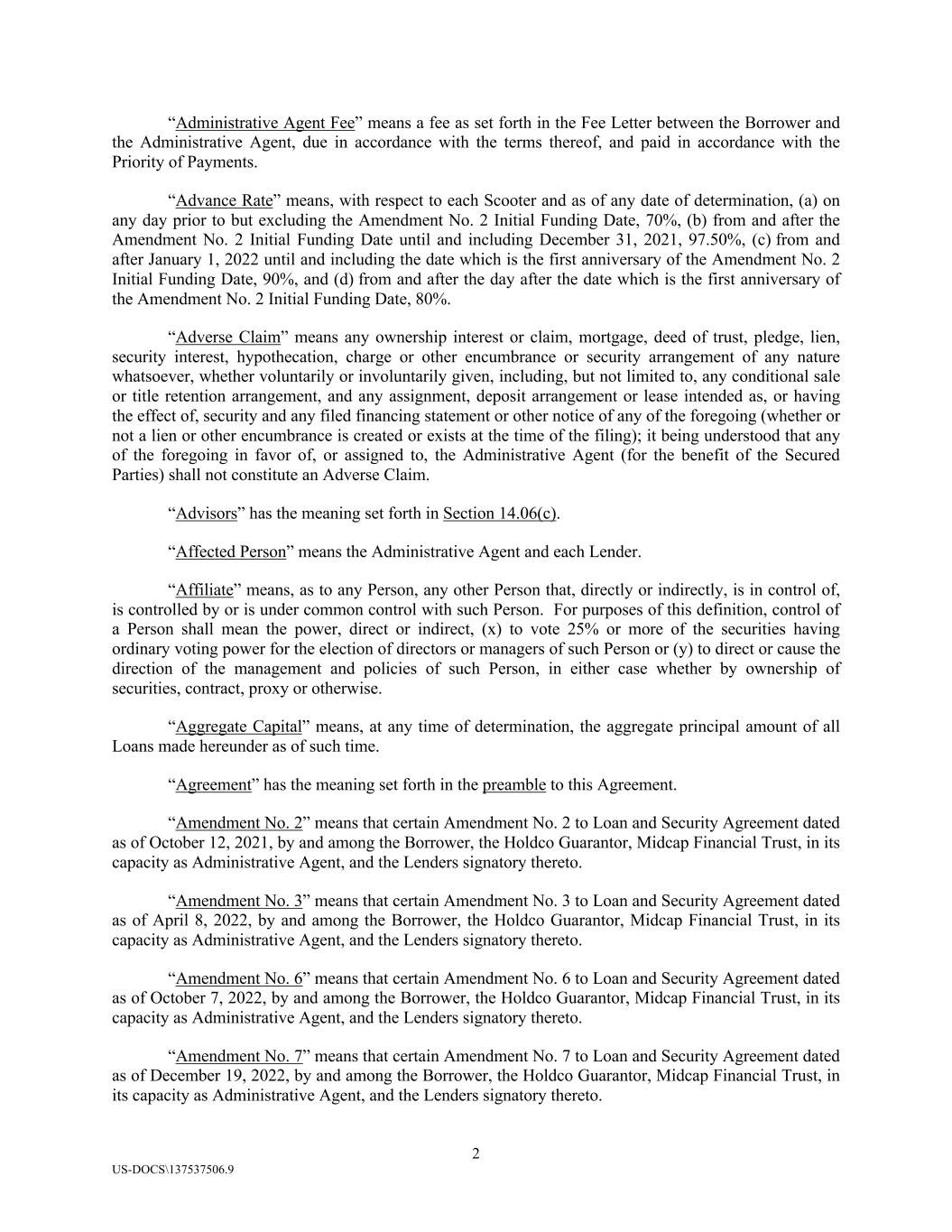 2 US-DOCS\137537506.9 “Administrative Agent Fee” means a fee as set forth in the Fee Letter between the Borrower and the Administrative Agent, due in accordance with the terms thereof, and paid in accordance with the Priority of Payments. “Advance Rate” means, with respect to each Scooter and as of any date of determination, (a) on any day prior to but excluding the Amendment No. 2 Initial Funding Date, 70%, (b) from and after the Amendment No. 2 Initial Funding Date until and including December 31, 2021, 97.50%, (c) from and after January 1, 2022 until and including the date which is the first anniversary of the Amendment No. 2 Initial Funding Date, 90%, and (d) from and after the day after the date which is the first anniversary of the Amendment No. 2 Initial Funding Date, 80%. “Adverse Claim” means any ownership interest or claim, mortgage, deed of trust, pledge, lien, security interest, hypothecation, charge or other encumbrance or security arrangement of any nature whatsoever, whether voluntarily or involuntarily given, including, but not limited to, any conditional sale or title retention arrangement, and any assignment, deposit arrangement or lease intended as, or having the effect of, security and any filed financing statement or other notice of any of the foregoing (whether or not a lien or other encumbrance is created or exists at the time of the filing); it being understood that any of the foregoing in favor of, or assigned to, the Administrative Agent (for the benefit of the Secured Parties) shall not constitute an Adverse Claim. “Advisors” has the meaning set forth in Section 14.06(c). “Affected Person” means the Administrative Agent and each Lender. “Affiliate” means, as to any Person, any other Person that, directly or indirectly, is in control of, is controlled by or is under common control with such Person. For purposes of this definition, control of a Person shall mean the power, direct or indirect, (x) to vote 25% or more of the securities having ordinary voting power for the election of directors or managers of such Person or (y) to direct or cause the direction of the management and policies of such Person, in either case whether by ownership of securities, contract, proxy or otherwise. “Aggregate Capital” means, at any time of determination, the aggregate principal amount of all Loans made hereunder as of such time. “Agreement” has the meaning set forth in the preamble to this Agreement. “Amendment No. 2” means that certain Amendment No. 2 to Loan and Security Agreement dated as of October 12, 2021, by and among the Borrower, the Holdco Guarantor, Midcap Financial Trust, in its capacity as Administrative Agent, and the Lenders signatory thereto. “Amendment No. 3” means that certain Amendment No. 3 to Loan and Security Agreement dated as of April 8, 2022, by and among the Borrower, the Holdco Guarantor, Midcap Financial Trust, in its capacity as Administrative Agent, and the Lenders signatory thereto. “Amendment No. 6” means that certain Amendment No. 6 to Loan and Security Agreement dated as of October 7, 2022, by and among the Borrower, the Holdco Guarantor, Midcap Financial Trust, in its capacity as Administrative Agent, and the Lenders signatory thereto. “Amendment No. 7” means that certain Amendment No. 7 to Loan and Security Agreement dated as of December 19, 2022, by and among the Borrower, the Holdco Guarantor, Midcap Financial Trust, in its capacity as Administrative Agent, and the Lenders signatory thereto.