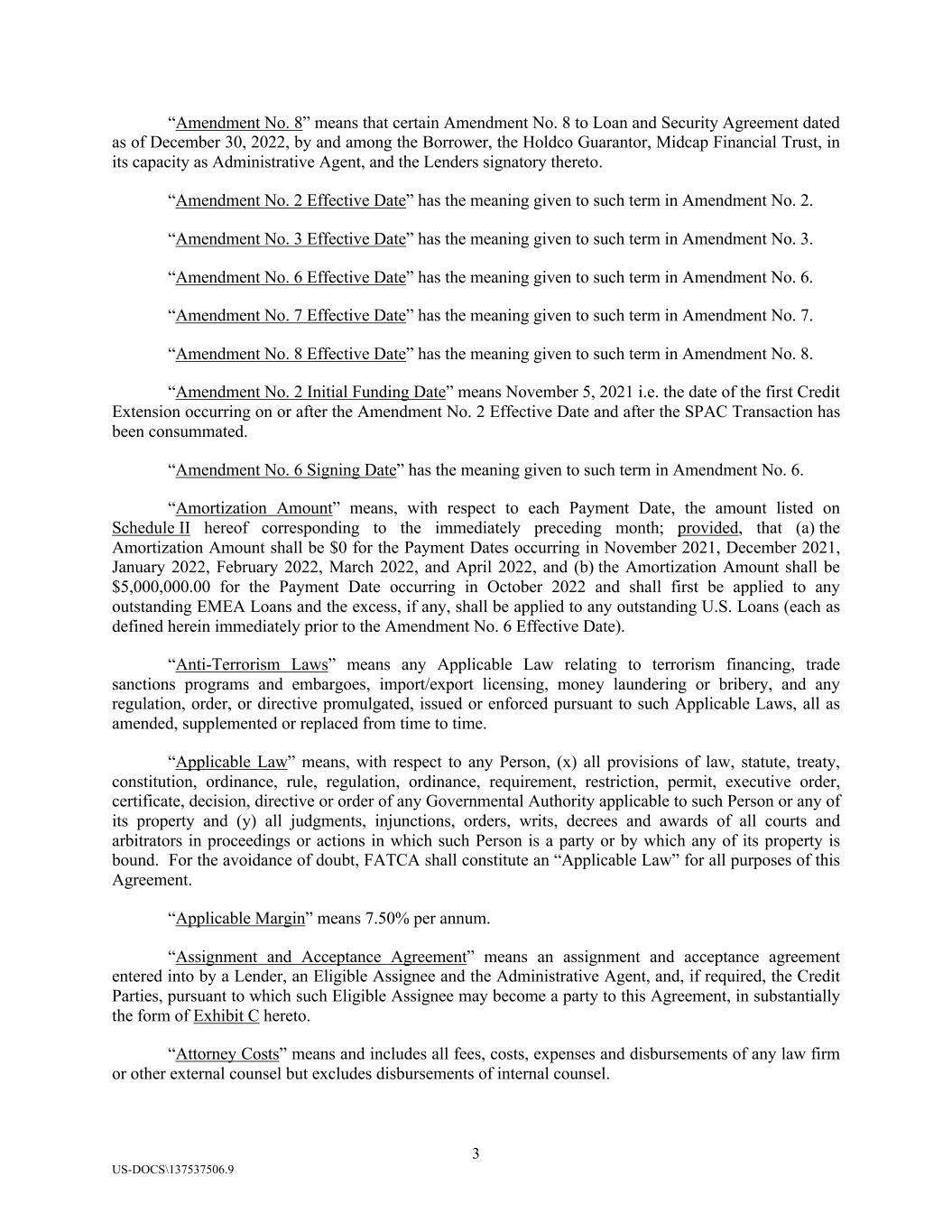 3 US-DOCS\137537506.9 “Amendment No. 8” means that certain Amendment No. 8 to Loan and Security Agreement dated as of December 30, 2022, by and among the Borrower, the Holdco Guarantor, Midcap Financial Trust, in its capacity as Administrative Agent, and the Lenders signatory thereto. “Amendment No. 2 Effective Date” has the meaning given to such term in Amendment No. 2. “Amendment No. 3 Effective Date” has the meaning given to such term in Amendment No. 3. “Amendment No. 6 Effective Date” has the meaning given to such term in Amendment No. 6. “Amendment No. 7 Effective Date” has the meaning given to such term in Amendment No. 7. “Amendment No. 8 Effective Date” has the meaning given to such term in Amendment No. 8. “Amendment No. 2 Initial Funding Date” means November 5, 2021 i.e. the date of the first Credit Extension occurring on or after the Amendment No. 2 Effective Date and after the SPAC Transaction has been consummated. “Amendment No. 6 Signing Date” has the meaning given to such term in Amendment No. 6. “Amortization Amount” means, with respect to each Payment Date, the amount listed on Schedule II hereof corresponding to the immediately preceding month; provided, that (a) the Amortization Amount shall be $0 for the Payment Dates occurring in November 2021, December 2021, January 2022, February 2022, March 2022, and April 2022, and (b) the Amortization Amount shall be $5,000,000.00 for the Payment Date occurring in October 2022 and shall first be applied to any outstanding EMEA Loans and the excess, if any, shall be applied to any outstanding U.S. Loans (each as defined herein immediately prior to the Amendment No. 6 Effective Date). “Anti-Terrorism Laws” means any Applicable Law relating to terrorism financing, trade sanctions programs and embargoes, import/export licensing, money laundering or bribery, and any regulation, order, or directive promulgated, issued or enforced pursuant to such Applicable Laws, all as amended, supplemented or replaced from time to time. “Applicable Law” means, with respect to any Person, (x) all provisions of law, statute, treaty, constitution, ordinance, rule, regulation, ordinance, requirement, restriction, permit, executive order, certificate, decision, directive or order of any Governmental Authority applicable to such Person or any of its property and (y) all judgments, injunctions, orders, writs, decrees and awards of all courts and arbitrators in proceedings or actions in which such Person is a party or by which any of its property is bound. For the avoidance of doubt, FATCA shall constitute an “Applicable Law” for all purposes of this Agreement. “Applicable Margin” means 7.50% per annum. “Assignment and Acceptance Agreement” means an assignment and acceptance agreement entered into by a Lender, an Eligible Assignee and the Administrative Agent, and, if required, the Credit Parties, pursuant to which such Eligible Assignee may become a party to this Agreement, in substantially the form of Exhibit C hereto. “Attorney Costs” means and includes all fees, costs, expenses and disbursements of any law firm or other external counsel but excludes disbursements of internal counsel.