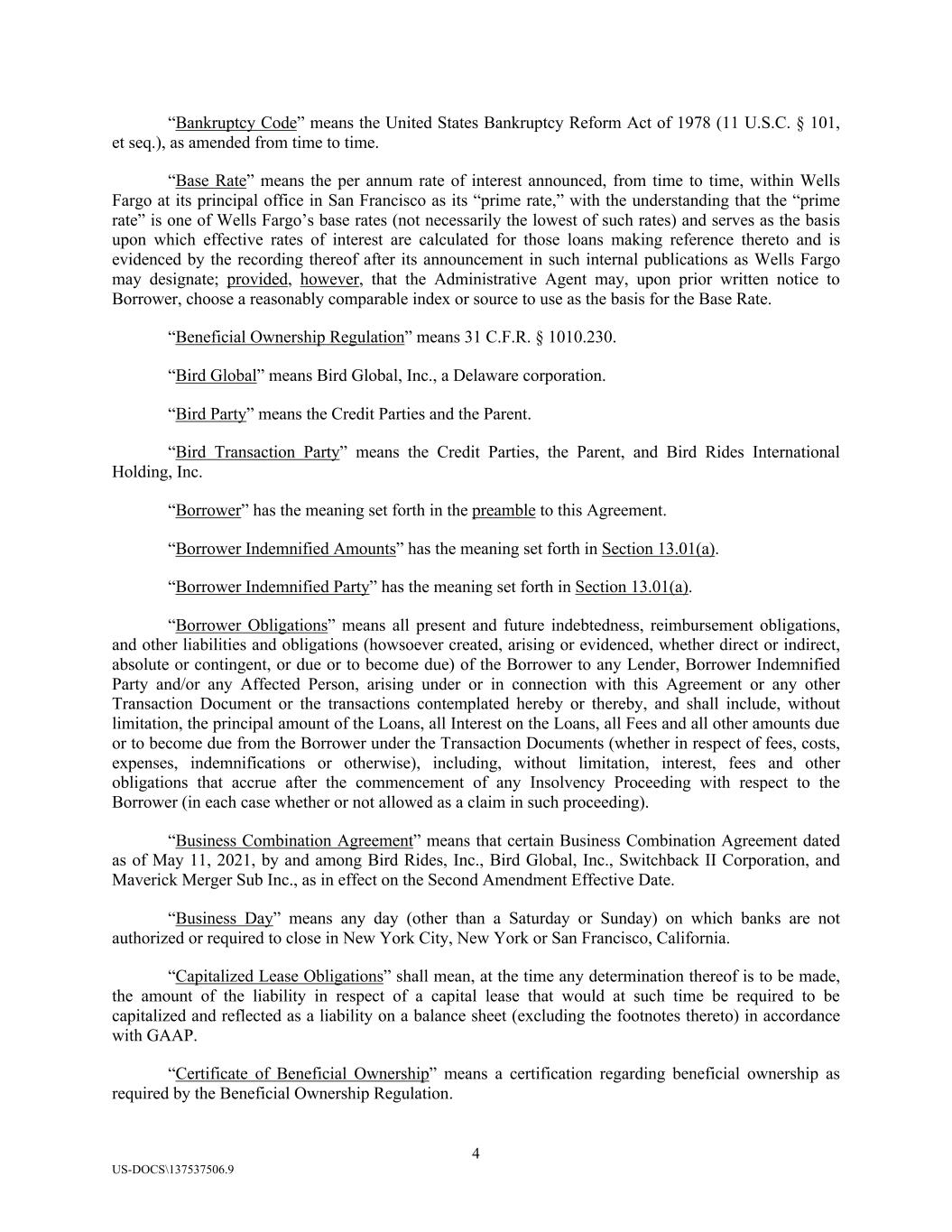 4 US-DOCS\137537506.9 “Bankruptcy Code” means the United States Bankruptcy Reform Act of 1978 (11 U.S.C. § 101, et seq.), as amended from time to time. “Base Rate” means the per annum rate of interest announced, from time to time, within Wells Fargo at its principal office in San Francisco as its “prime rate,” with the understanding that the “prime rate” is one of Wells Fargo’s base rates (not necessarily the lowest of such rates) and serves as the basis upon which effective rates of interest are calculated for those loans making reference thereto and is evidenced by the recording thereof after its announcement in such internal publications as Wells Fargo may designate; provided, however, that the Administrative Agent may, upon prior written notice to Borrower, choose a reasonably comparable index or source to use as the basis for the Base Rate. “Beneficial Ownership Regulation” means 31 C.F.R. § 1010.230. “Bird Global” means Bird Global, Inc., a Delaware corporation. “Bird Party” means the Credit Parties and the Parent. “Bird Transaction Party” means the Credit Parties, the Parent, and Bird Rides International Holding, Inc. “Borrower” has the meaning set forth in the preamble to this Agreement. “Borrower Indemnified Amounts” has the meaning set forth in Section 13.01(a). “Borrower Indemnified Party” has the meaning set forth in Section 13.01(a). “Borrower Obligations” means all present and future indebtedness, reimbursement obligations, and other liabilities and obligations (howsoever created, arising or evidenced, whether direct or indirect, absolute or contingent, or due or to become due) of the Borrower to any Lender, Borrower Indemnified Party and/or any Affected Person, arising under or in connection with this Agreement or any other Transaction Document or the transactions contemplated hereby or thereby, and shall include, without limitation, the principal amount of the Loans, all Interest on the Loans, all Fees and all other amounts due or to become due from the Borrower under the Transaction Documents (whether in respect of fees, costs, expenses, indemnifications or otherwise), including, without limitation, interest, fees and other obligations that accrue after the commencement of any Insolvency Proceeding with respect to the Borrower (in each case whether or not allowed as a claim in such proceeding). “Business Combination Agreement” means that certain Business Combination Agreement dated as of May 11, 2021, by and among Bird Rides, Inc., Bird Global, Inc., Switchback II Corporation, and Maverick Merger Sub Inc., as in effect on the Second Amendment Effective Date. “Business Day” means any day (other than a Saturday or Sunday) on which banks are not authorized or required to close in New York City, New York or San Francisco, California. “Capitalized Lease Obligations” shall mean, at the time any determination thereof is to be made, the amount of the liability in respect of a capital lease that would at such time be required to be capitalized and reflected as a liability on a balance sheet (excluding the footnotes thereto) in accordance with GAAP. “Certificate of Beneficial Ownership” means a certification regarding beneficial ownership as required by the Beneficial Ownership Regulation.