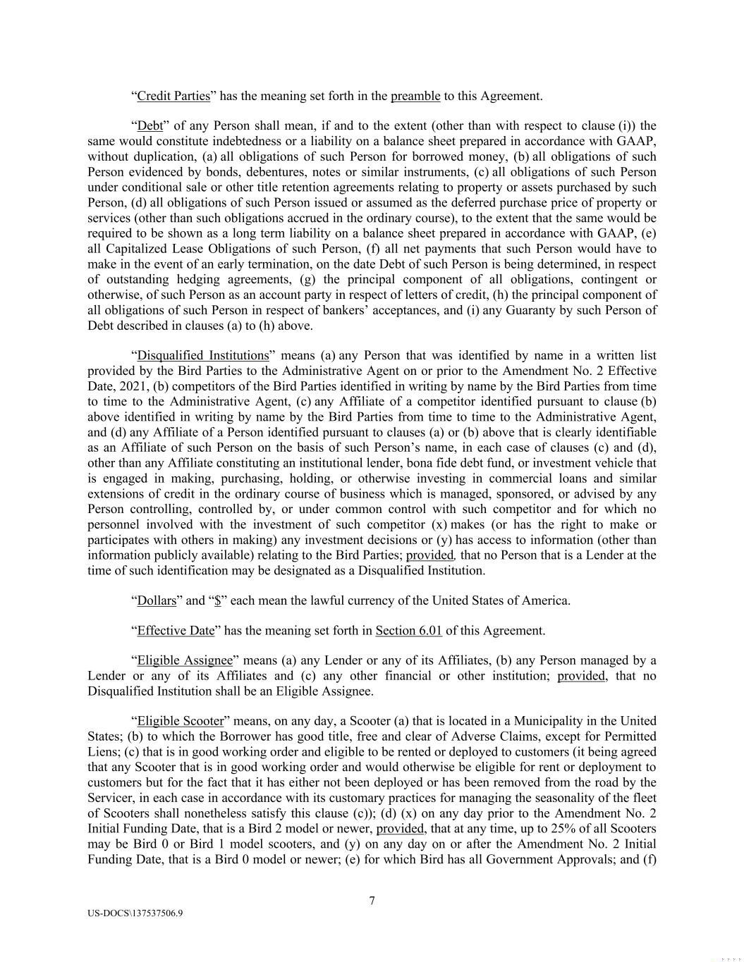 7 US-DOCS\137537506.9 “Credit Parties” has the meaning set forth in the preamble to this Agreement. “Debt” of any Person shall mean, if and to the extent (other than with respect to clause (i)) the same would constitute indebtedness or a liability on a balance sheet prepared in accordance with GAAP, without duplication, (a) all obligations of such Person for borrowed money, (b) all obligations of such Person evidenced by bonds, debentures, notes or similar instruments, (c) all obligations of such Person under conditional sale or other title retention agreements relating to property or assets purchased by such Person, (d) all obligations of such Person issued or assumed as the deferred purchase price of property or services (other than such obligations accrued in the ordinary course), to the extent that the same would be required to be shown as a long term liability on a balance sheet prepared in accordance with GAAP, (e) all Capitalized Lease Obligations of such Person, (f) all net payments that such Person would have to make in the event of an early termination, on the date Debt of such Person is being determined, in respect of outstanding hedging agreements, (g) the principal component of all obligations, contingent or otherwise, of such Person as an account party in respect of letters of credit, (h) the principal component of all obligations of such Person in respect of bankers’ acceptances, and (i) any Guaranty by such Person of Debt described in clauses (a) to (h) above. “Disqualified Institutions” means (a) any Person that was identified by name in a written list provided by the Bird Parties to the Administrative Agent on or prior to the Amendment No. 2 Effective Date, 2021, (b) competitors of the Bird Parties identified in writing by name by the Bird Parties from time to time to the Administrative Agent, (c) any Affiliate of a competitor identified pursuant to clause (b) above identified in writing by name by the Bird Parties from time to time to the Administrative Agent, and (d) any Affiliate of a Person identified pursuant to clauses (a) or (b) above that is clearly identifiable as an Affiliate of such Person on the basis of such Person’s name, in each case of clauses (c) and (d), other than any Affiliate constituting an institutional lender, bona fide debt fund, or investment vehicle that is engaged in making, purchasing, holding, or otherwise investing in commercial loans and similar extensions of credit in the ordinary course of business which is managed, sponsored, or advised by any Person controlling, controlled by, or under common control with such competitor and for which no personnel involved with the investment of such competitor (x) makes (or has the right to make or participates with others in making) any investment decisions or (y) has access to information (other than information publicly available) relating to the Bird Parties; provided, that no Person that is a Lender at the time of such identification may be designated as a Disqualified Institution. “Dollars” and “$” each mean the lawful currency of the United States of America. “Effective Date” has the meaning set forth in Section 6.01 of this Agreement. “Eligible Assignee” means (a) any Lender or any of its Affiliates, (b) any Person managed by a Lender or any of its Affiliates and (c) any other financial or other institution; provided, that no Disqualified Institution shall be an Eligible Assignee. “Eligible Scooter” means, on any day, a Scooter (a) that is located in a Municipality in the United States; (b) to which the Borrower has good title, free and clear of Adverse Claims, except for Permitted Liens; (c) that is in good working order and eligible to be rented or deployed to customers (it being agreed that any Scooter that is in good working order and would otherwise be eligible for rent or deployment to customers but for the fact that it has either not been deployed or has been removed from the road by the Servicer, in each case in accordance with its customary practices for managing the seasonality of the fleet of Scooters shall nonetheless satisfy this clause (c)); (d) (x) on any day prior to the Amendment No. 2 Initial Funding Date, that is a Bird 2 model or newer, provided, that at any time, up to 25% of all Scooters may be Bird 0 or Bird 1 model scooters, and (y) on any day on or after the Amendment No. 2 Initial Funding Date, that is a Bird 0 model or newer; (e) for which Bird has all Government Approvals; and (f)