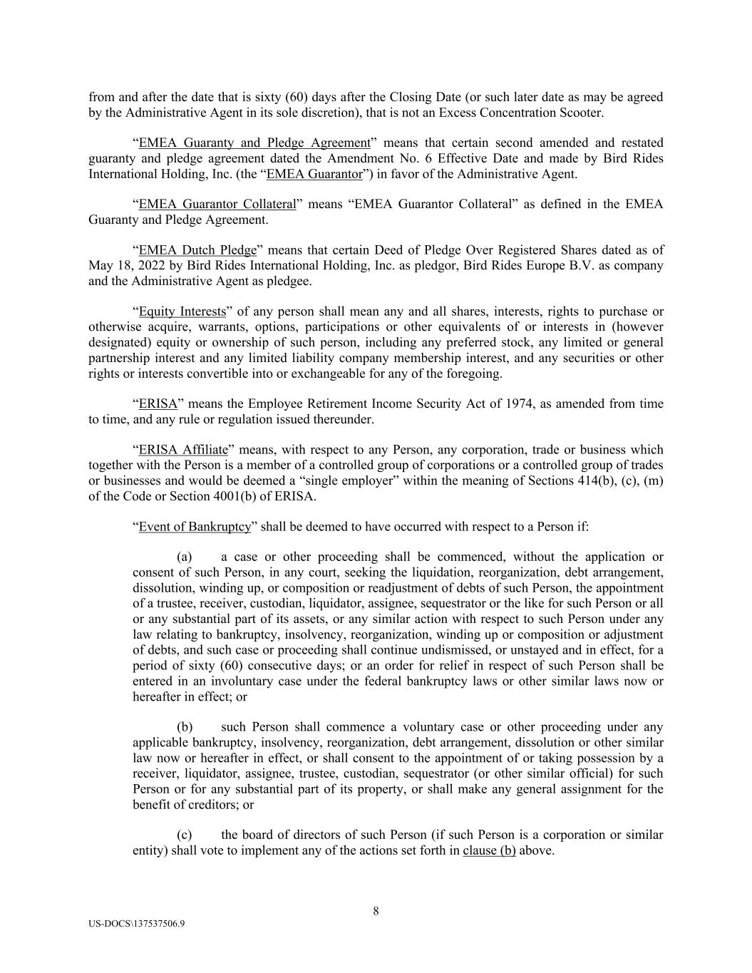 8 US-DOCS\137537506.9 from and after the date that is sixty (60) days after the Closing Date (or such later date as may be agreed by the Administrative Agent in its sole discretion), that is not an Excess Concentration Scooter. “EMEA Guaranty and Pledge Agreement” means that certain second amended and restated guaranty and pledge agreement dated the Amendment No. 6 Effective Date and made by Bird Rides International Holding, Inc. (the “EMEA Guarantor”) in favor of the Administrative Agent. “EMEA Guarantor Collateral” means “EMEA Guarantor Collateral” as defined in the EMEA Guaranty and Pledge Agreement. “EMEA Dutch Pledge” means that certain Deed of Pledge Over Registered Shares dated as of May 18, 2022 by Bird Rides International Holding, Inc. as pledgor, Bird Rides Europe B.V. as company and the Administrative Agent as pledgee. “Equity Interests” of any person shall mean any and all shares, interests, rights to purchase or otherwise acquire, warrants, options, participations or other equivalents of or interests in (however designated) equity or ownership of such person, including any preferred stock, any limited or general partnership interest and any limited liability company membership interest, and any securities or other rights or interests convertible into or exchangeable for any of the foregoing. “ERISA” means the Employee Retirement Income Security Act of 1974, as amended from time to time, and any rule or regulation issued thereunder. “ERISA Affiliate” means, with respect to any Person, any corporation, trade or business which together with the Person is a member of a controlled group of corporations or a controlled group of trades or businesses and would be deemed a “single employer” within the meaning of Sections 414(b), (c), (m) of the Code or Section 4001(b) of ERISA. “Event of Bankruptcy” shall be deemed to have occurred with respect to a Person if: (a) a case or other proceeding shall be commenced, without the application or consent of such Person, in any court, seeking the liquidation, reorganization, debt arrangement, dissolution, winding up, or composition or readjustment of debts of such Person, the appointment of a trustee, receiver, custodian, liquidator, assignee, sequestrator or the like for such Person or all or any substantial part of its assets, or any similar action with respect to such Person under any law relating to bankruptcy, insolvency, reorganization, winding up or composition or adjustment of debts, and such case or proceeding shall continue undismissed, or unstayed and in effect, for a period of sixty (60) consecutive days; or an order for relief in respect of such Person shall be entered in an involuntary case under the federal bankruptcy laws or other similar laws now or hereafter in effect; or (b) such Person shall commence a voluntary case or other proceeding under any applicable bankruptcy, insolvency, reorganization, debt arrangement, dissolution or other similar law now or hereafter in effect, or shall consent to the appointment of or taking possession by a receiver, liquidator, assignee, trustee, custodian, sequestrator (or other similar official) for such Person or for any substantial part of its property, or shall make any general assignment for the benefit of creditors; or (c) the board of directors of such Person (if such Person is a corporation or similar entity) shall vote to implement any of the actions set forth in clause (b) above.