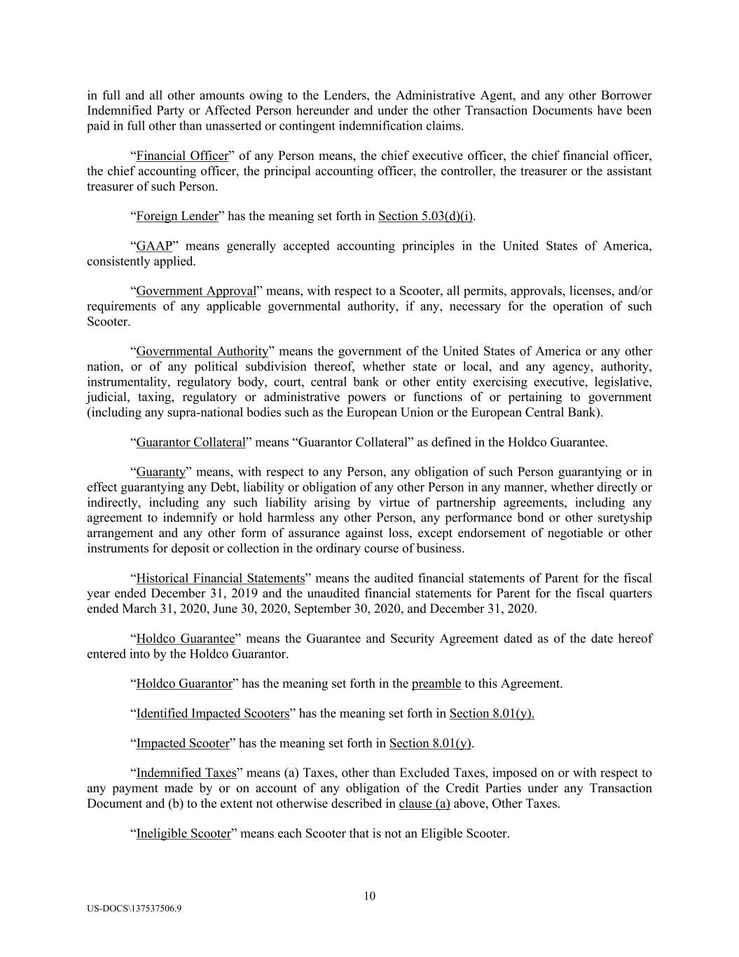 10 US-DOCS\137537506.9 in full and all other amounts owing to the Lenders, the Administrative Agent, and any other Borrower Indemnified Party or Affected Person hereunder and under the other Transaction Documents have been paid in full other than unasserted or contingent indemnification claims. “Financial Officer” of any Person means, the chief executive officer, the chief financial officer, the chief accounting officer, the principal accounting officer, the controller, the treasurer or the assistant treasurer of such Person. “Foreign Lender” has the meaning set forth in Section 5.03(d)(i). “GAAP” means generally accepted accounting principles in the United States of America, consistently applied. “Government Approval” means, with respect to a Scooter, all permits, approvals, licenses, and/or requirements of any applicable governmental authority, if any, necessary for the operation of such Scooter. “Governmental Authority” means the government of the United States of America or any other nation, or of any political subdivision thereof, whether state or local, and any agency, authority, instrumentality, regulatory body, court, central bank or other entity exercising executive, legislative, judicial, taxing, regulatory or administrative powers or functions of or pertaining to government (including any supra-national bodies such as the European Union or the European Central Bank). “Guarantor Collateral” means “Guarantor Collateral” as defined in the Holdco Guarantee. “Guaranty” means, with respect to any Person, any obligation of such Person guarantying or in effect guarantying any Debt, liability or obligation of any other Person in any manner, whether directly or indirectly, including any such liability arising by virtue of partnership agreements, including any agreement to indemnify or hold harmless any other Person, any performance bond or other suretyship arrangement and any other form of assurance against loss, except endorsement of negotiable or other instruments for deposit or collection in the ordinary course of business. “Historical Financial Statements” means the audited financial statements of Parent for the fiscal year ended December 31, 2019 and the unaudited financial statements for Parent for the fiscal quarters ended March 31, 2020, June 30, 2020, September 30, 2020, and December 31, 2020. “Holdco Guarantee” means the Guarantee and Security Agreement dated as of the date hereof entered into by the Holdco Guarantor. “Holdco Guarantor” has the meaning set forth in the preamble to this Agreement. “Identified Impacted Scooters” has the meaning set forth in Section 8.01(y). “Impacted Scooter” has the meaning set forth in Section 8.01(y). “Indemnified Taxes” means (a) Taxes, other than Excluded Taxes, imposed on or with respect to any payment made by or on account of any obligation of the Credit Parties under any Transaction Document and (b) to the extent not otherwise described in clause (a) above, Other Taxes. “Ineligible Scooter” means each Scooter that is not an Eligible Scooter.