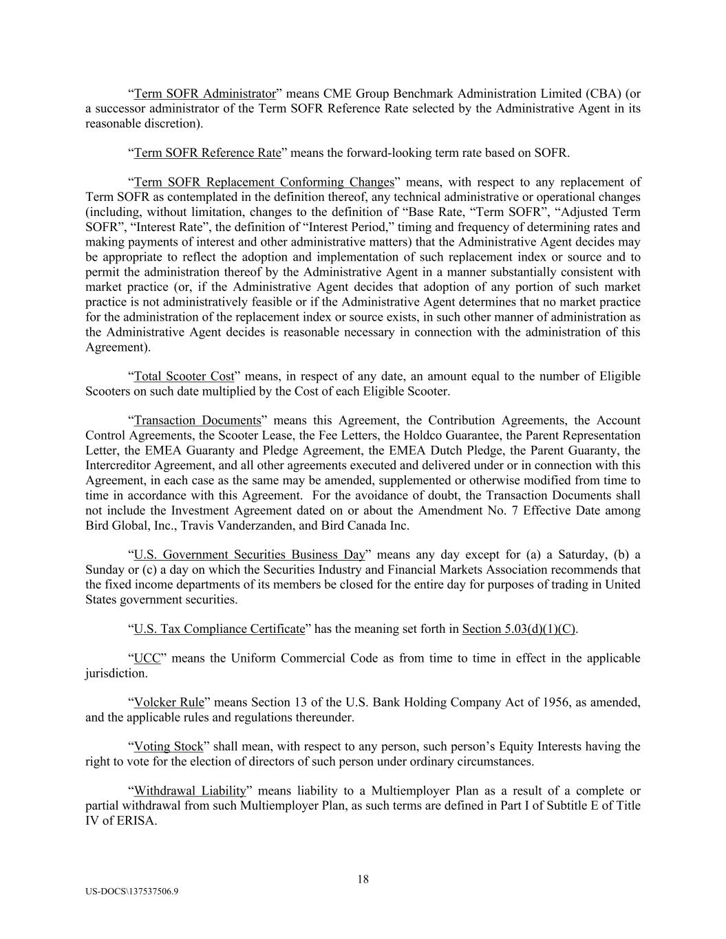 18 US-DOCS\137537506.9 “Term SOFR Administrator” means CME Group Benchmark Administration Limited (CBA) (or a successor administrator of the Term SOFR Reference Rate selected by the Administrative Agent in its reasonable discretion). “Term SOFR Reference Rate” means the forward-looking term rate based on SOFR. “Term SOFR Replacement Conforming Changes” means, with respect to any replacement of Term SOFR as contemplated in the definition thereof, any technical administrative or operational changes (including, without limitation, changes to the definition of “Base Rate, “Term SOFR”, “Adjusted Term SOFR”, “Interest Rate”, the definition of “Interest Period,” timing and frequency of determining rates and making payments of interest and other administrative matters) that the Administrative Agent decides may be appropriate to reflect the adoption and implementation of such replacement index or source and to permit the administration thereof by the Administrative Agent in a manner substantially consistent with market practice (or, if the Administrative Agent decides that adoption of any portion of such market practice is not administratively feasible or if the Administrative Agent determines that no market practice for the administration of the replacement index or source exists, in such other manner of administration as the Administrative Agent decides is reasonable necessary in connection with the administration of this Agreement). “Total Scooter Cost” means, in respect of any date, an amount equal to the number of Eligible Scooters on such date multiplied by the Cost of each Eligible Scooter. “Transaction Documents” means this Agreement, the Contribution Agreements, the Account Control Agreements, the Scooter Lease, the Fee Letters, the Holdco Guarantee, the Parent Representation Letter, the EMEA Guaranty and Pledge Agreement, the EMEA Dutch Pledge, the Parent Guaranty, the Intercreditor Agreement, and all other agreements executed and delivered under or in connection with this Agreement, in each case as the same may be amended, supplemented or otherwise modified from time to time in accordance with this Agreement. For the avoidance of doubt, the Transaction Documents shall not include the Investment Agreement dated on or about the Amendment No. 7 Effective Date among Bird Global, Inc., Travis Vanderzanden, and Bird Canada Inc. “U.S. Government Securities Business Day” means any day except for (a) a Saturday, (b) a Sunday or (c) a day on which the Securities Industry and Financial Markets Association recommends that the fixed income departments of its members be closed for the entire day for purposes of trading in United States government securities. “U.S. Tax Compliance Certificate” has the meaning set forth in Section 5.03(d)(1)(C). “UCC” means the Uniform Commercial Code as from time to time in effect in the applicable jurisdiction. “Volcker Rule” means Section 13 of the U.S. Bank Holding Company Act of 1956, as amended, and the applicable rules and regulations thereunder. “Voting Stock” shall mean, with respect to any person, such person’s Equity Interests having the right to vote for the election of directors of such person under ordinary circumstances. “Withdrawal Liability” means liability to a Multiemployer Plan as a result of a complete or partial withdrawal from such Multiemployer Plan, as such terms are defined in Part I of Subtitle E of Title IV of ERISA.