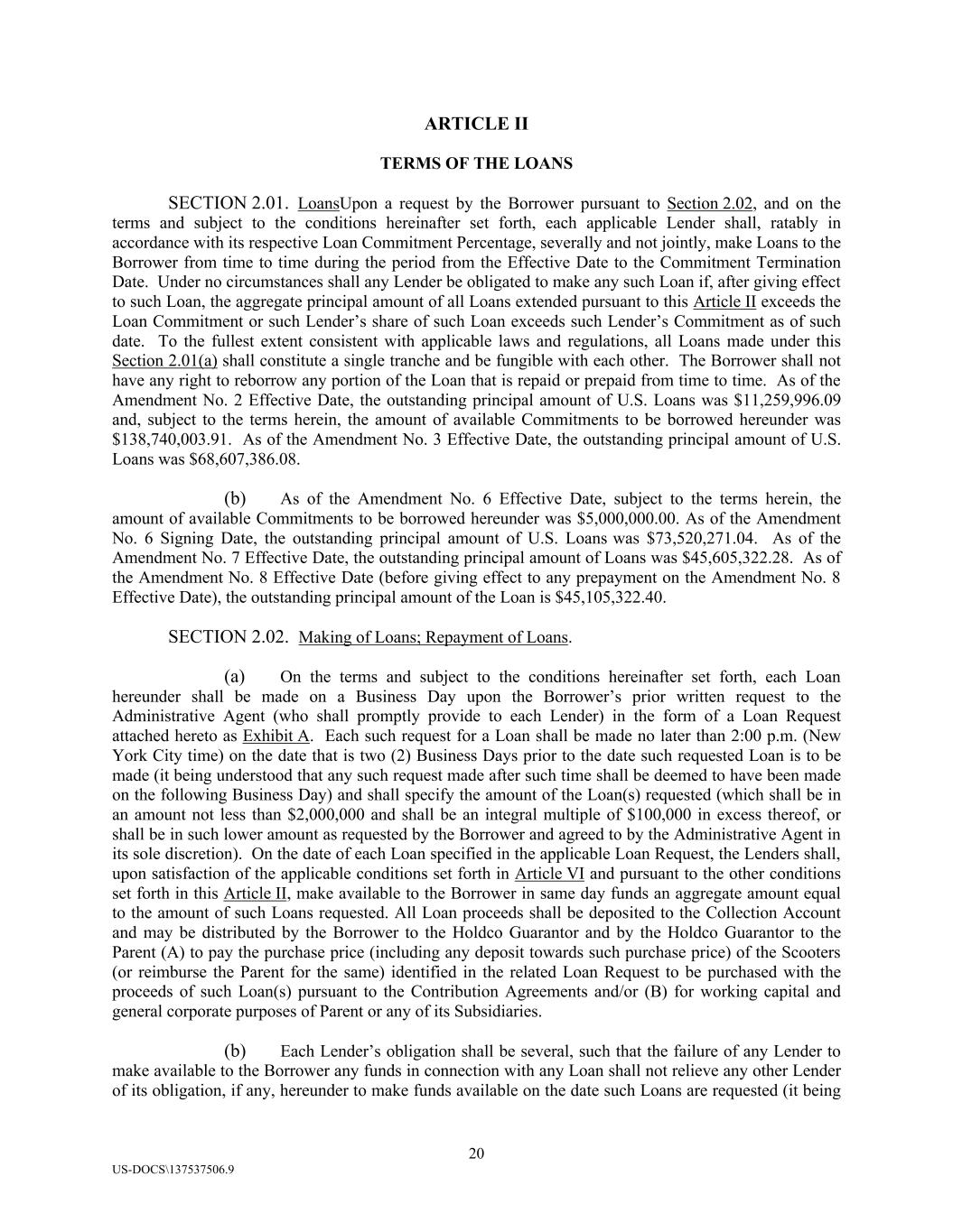 20 US-DOCS\137537506.9 ARTICLE II TERMS OF THE LOANS SECTION 2.01. LoansUpon a request by the Borrower pursuant to Section 2.02, and on the terms and subject to the conditions hereinafter set forth, each applicable Lender shall, ratably in accordance with its respective Loan Commitment Percentage, severally and not jointly, make Loans to the Borrower from time to time during the period from the Effective Date to the Commitment Termination Date. Under no circumstances shall any Lender be obligated to make any such Loan if, after giving effect to such Loan, the aggregate principal amount of all Loans extended pursuant to this Article II exceeds the Loan Commitment or such Lender’s share of such Loan exceeds such Lender’s Commitment as of such date. To the fullest extent consistent with applicable laws and regulations, all Loans made under this Section 2.01(a) shall constitute a single tranche and be fungible with each other. The Borrower shall not have any right to reborrow any portion of the Loan that is repaid or prepaid from time to time. As of the Amendment No. 2 Effective Date, the outstanding principal amount of U.S. Loans was $11,259,996.09 and, subject to the terms herein, the amount of available Commitments to be borrowed hereunder was $138,740,003.91. As of the Amendment No. 3 Effective Date, the outstanding principal amount of U.S. Loans was $68,607,386.08. (b) As of the Amendment No. 6 Effective Date, subject to the terms herein, the amount of available Commitments to be borrowed hereunder was $5,000,000.00. As of the Amendment No. 6 Signing Date, the outstanding principal amount of U.S. Loans was $73,520,271.04. As of the Amendment No. 7 Effective Date, the outstanding principal amount of Loans was $45,605,322.28. As of the Amendment No. 8 Effective Date (before giving effect to any prepayment on the Amendment No. 8 Effective Date), the outstanding principal amount of the Loan is $45,105,322.40. SECTION 2.02. Making of Loans; Repayment of Loans. (a) On the terms and subject to the conditions hereinafter set forth, each Loan hereunder shall be made on a Business Day upon the Borrower’s prior written request to the Administrative Agent (who shall promptly provide to each Lender) in the form of a Loan Request attached hereto as Exhibit A. Each such request for a Loan shall be made no later than 2:00 p.m. (New York City time) on the date that is two (2) Business Days prior to the date such requested Loan is to be made (it being understood that any such request made after such time shall be deemed to have been made on the following Business Day) and shall specify the amount of the Loan(s) requested (which shall be in an amount not less than $2,000,000 and shall be an integral multiple of $100,000 in excess thereof, or shall be in such lower amount as requested by the Borrower and agreed to by the Administrative Agent in its sole discretion). On the date of each Loan specified in the applicable Loan Request, the Lenders shall, upon satisfaction of the applicable conditions set forth in Article VI and pursuant to the other conditions set forth in this Article II, make available to the Borrower in same day funds an aggregate amount equal to the amount of such Loans requested. All Loan proceeds shall be deposited to the Collection Account and may be distributed by the Borrower to the Holdco Guarantor and by the Holdco Guarantor to the Parent (A) to pay the purchase price (including any deposit towards such purchase price) of the Scooters (or reimburse the Parent for the same) identified in the related Loan Request to be purchased with the proceeds of such Loan(s) pursuant to the Contribution Agreements and/or (B) for working capital and general corporate purposes of Parent or any of its Subsidiaries. (b) Each Lender’s obligation shall be several, such that the failure of any Lender to make available to the Borrower any funds in connection with any Loan shall not relieve any other Lender of its obligation, if any, hereunder to make funds available on the date such Loans are requested (it being