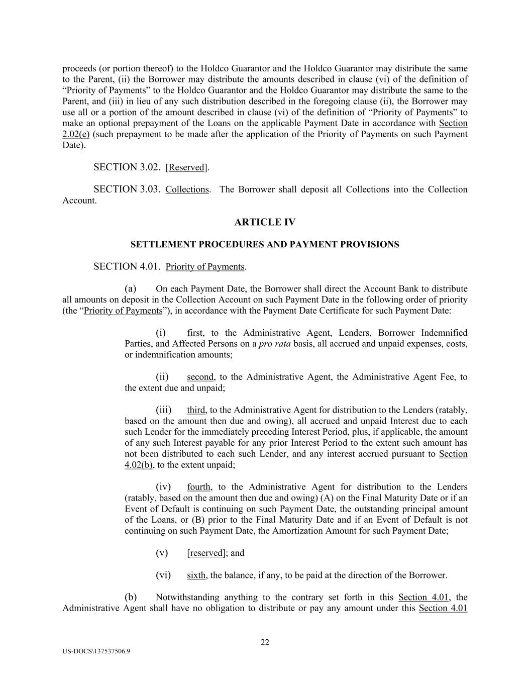 22 US-DOCS\137537506.9 proceeds (or portion thereof) to the Holdco Guarantor and the Holdco Guarantor may distribute the same to the Parent, (ii) the Borrower may distribute the amounts described in clause (vi) of the definition of “Priority of Payments” to the Holdco Guarantor and the Holdco Guarantor may distribute the same to the Parent, and (iii) in lieu of any such distribution described in the foregoing clause (ii), the Borrower may use all or a portion of the amount described in clause (vi) of the definition of “Priority of Payments” to make an optional prepayment of the Loans on the applicable Payment Date in accordance with Section 2.02(e) (such prepayment to be made after the application of the Priority of Payments on such Payment Date). SECTION 3.02. [Reserved]. SECTION 3.03. Collections. The Borrower shall deposit all Collections into the Collection Account. ARTICLE IV SETTLEMENT PROCEDURES AND PAYMENT PROVISIONS SECTION 4.01. Priority of Payments. (a) On each Payment Date, the Borrower shall direct the Account Bank to distribute all amounts on deposit in the Collection Account on such Payment Date in the following order of priority (the “Priority of Payments”), in accordance with the Payment Date Certificate for such Payment Date: (i) first, to the Administrative Agent, Lenders, Borrower Indemnified Parties, and Affected Persons on a pro rata basis, all accrued and unpaid expenses, costs, or indemnification amounts; (ii) second, to the Administrative Agent, the Administrative Agent Fee, to the extent due and unpaid; (iii) third, to the Administrative Agent for distribution to the Lenders (ratably, based on the amount then due and owing), all accrued and unpaid Interest due to each such Lender for the immediately preceding Interest Period, plus, if applicable, the amount of any such Interest payable for any prior Interest Period to the extent such amount has not been distributed to each such Lender, and any interest accrued pursuant to Section 4.02(b), to the extent unpaid; (iv) fourth, to the Administrative Agent for distribution to the Lenders (ratably, based on the amount then due and owing) (A) on the Final Maturity Date or if an Event of Default is continuing on such Payment Date, the outstanding principal amount of the Loans, or (B) prior to the Final Maturity Date and if an Event of Default is not continuing on such Payment Date, the Amortization Amount for such Payment Date; (v) [reserved]; and (vi) sixth, the balance, if any, to be paid at the direction of the Borrower. (b) Notwithstanding anything to the contrary set forth in this Section 4.01, the Administrative Agent shall have no obligation to distribute or pay any amount under this Section 4.01
