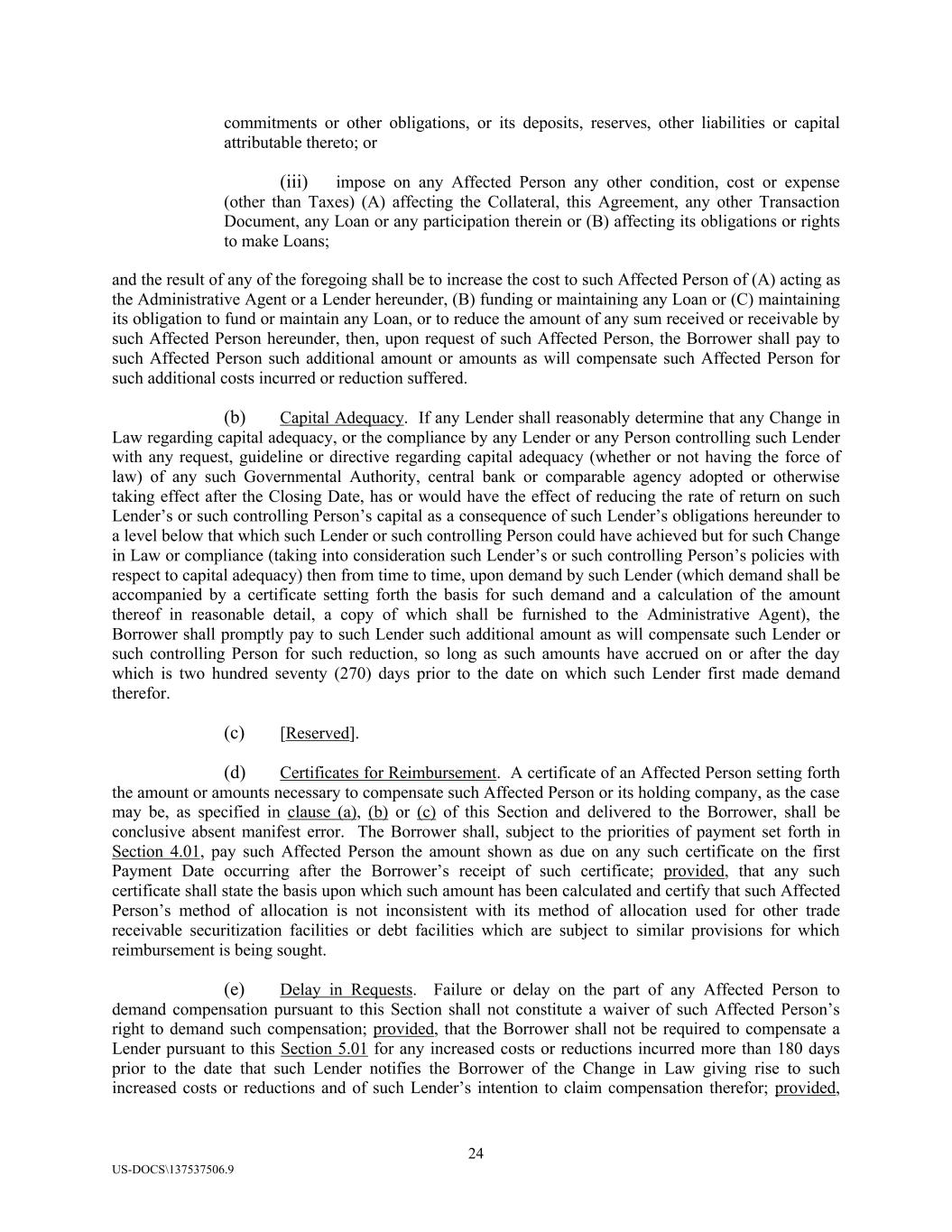 24 US-DOCS\137537506.9 commitments or other obligations, or its deposits, reserves, other liabilities or capital attributable thereto; or (iii) impose on any Affected Person any other condition, cost or expense (other than Taxes) (A) affecting the Collateral, this Agreement, any other Transaction Document, any Loan or any participation therein or (B) affecting its obligations or rights to make Loans; and the result of any of the foregoing shall be to increase the cost to such Affected Person of (A) acting as the Administrative Agent or a Lender hereunder, (B) funding or maintaining any Loan or (C) maintaining its obligation to fund or maintain any Loan, or to reduce the amount of any sum received or receivable by such Affected Person hereunder, then, upon request of such Affected Person, the Borrower shall pay to such Affected Person such additional amount or amounts as will compensate such Affected Person for such additional costs incurred or reduction suffered. (b) Capital Adequacy. If any Lender shall reasonably determine that any Change in Law regarding capital adequacy, or the compliance by any Lender or any Person controlling such Lender with any request, guideline or directive regarding capital adequacy (whether or not having the force of law) of any such Governmental Authority, central bank or comparable agency adopted or otherwise taking effect after the Closing Date, has or would have the effect of reducing the rate of return on such Lender’s or such controlling Person’s capital as a consequence of such Lender’s obligations hereunder to a level below that which such Lender or such controlling Person could have achieved but for such Change in Law or compliance (taking into consideration such Lender’s or such controlling Person’s policies with respect to capital adequacy) then from time to time, upon demand by such Lender (which demand shall be accompanied by a certificate setting forth the basis for such demand and a calculation of the amount thereof in reasonable detail, a copy of which shall be furnished to the Administrative Agent), the Borrower shall promptly pay to such Lender such additional amount as will compensate such Lender or such controlling Person for such reduction, so long as such amounts have accrued on or after the day which is two hundred seventy (270) days prior to the date on which such Lender first made demand therefor. (c) [Reserved]. (d) Certificates for Reimbursement. A certificate of an Affected Person setting forth the amount or amounts necessary to compensate such Affected Person or its holding company, as the case may be, as specified in clause (a), (b) or (c) of this Section and delivered to the Borrower, shall be conclusive absent manifest error. The Borrower shall, subject to the priorities of payment set forth in Section 4.01, pay such Affected Person the amount shown as due on any such certificate on the first Payment Date occurring after the Borrower’s receipt of such certificate; provided, that any such certificate shall state the basis upon which such amount has been calculated and certify that such Affected Person’s method of allocation is not inconsistent with its method of allocation used for other trade receivable securitization facilities or debt facilities which are subject to similar provisions for which reimbursement is being sought. (e) Delay in Requests. Failure or delay on the part of any Affected Person to demand compensation pursuant to this Section shall not constitute a waiver of such Affected Person’s right to demand such compensation; provided, that the Borrower shall not be required to compensate a Lender pursuant to this Section 5.01 for any increased costs or reductions incurred more than 180 days prior to the date that such Lender notifies the Borrower of the Change in Law giving rise to such increased costs or reductions and of such Lender’s intention to claim compensation therefor; provided,