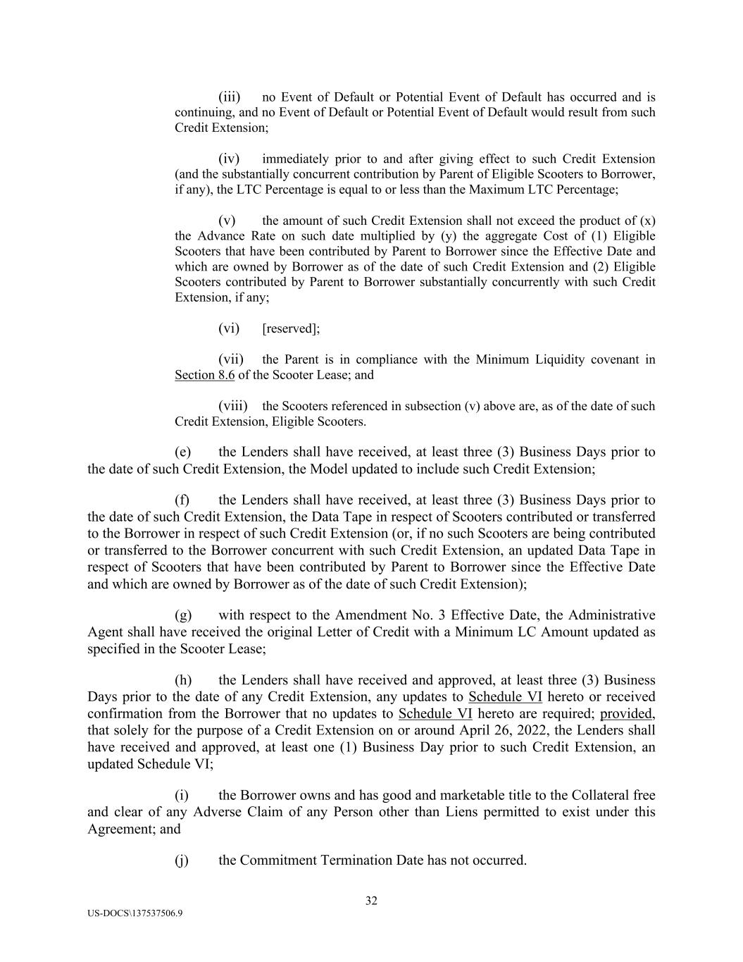 32 US-DOCS\137537506.9 (iii) no Event of Default or Potential Event of Default has occurred and is continuing, and no Event of Default or Potential Event of Default would result from such Credit Extension; (iv) immediately prior to and after giving effect to such Credit Extension (and the substantially concurrent contribution by Parent of Eligible Scooters to Borrower, if any), the LTC Percentage is equal to or less than the Maximum LTC Percentage; (v) the amount of such Credit Extension shall not exceed the product of (x) the Advance Rate on such date multiplied by (y) the aggregate Cost of (1) Eligible Scooters that have been contributed by Parent to Borrower since the Effective Date and which are owned by Borrower as of the date of such Credit Extension and (2) Eligible Scooters contributed by Parent to Borrower substantially concurrently with such Credit Extension, if any; (vi) [reserved]; (vii) the Parent is in compliance with the Minimum Liquidity covenant in Section 8.6 of the Scooter Lease; and (viii) the Scooters referenced in subsection (v) above are, as of the date of such Credit Extension, Eligible Scooters. (e) the Lenders shall have received, at least three (3) Business Days prior to the date of such Credit Extension, the Model updated to include such Credit Extension; (f) the Lenders shall have received, at least three (3) Business Days prior to the date of such Credit Extension, the Data Tape in respect of Scooters contributed or transferred to the Borrower in respect of such Credit Extension (or, if no such Scooters are being contributed or transferred to the Borrower concurrent with such Credit Extension, an updated Data Tape in respect of Scooters that have been contributed by Parent to Borrower since the Effective Date and which are owned by Borrower as of the date of such Credit Extension); (g) with respect to the Amendment No. 3 Effective Date, the Administrative Agent shall have received the original Letter of Credit with a Minimum LC Amount updated as specified in the Scooter Lease; (h) the Lenders shall have received and approved, at least three (3) Business Days prior to the date of any Credit Extension, any updates to Schedule VI hereto or received confirmation from the Borrower that no updates to Schedule VI hereto are required; provided, that solely for the purpose of a Credit Extension on or around April 26, 2022, the Lenders shall have received and approved, at least one (1) Business Day prior to such Credit Extension, an updated Schedule VI; (i) the Borrower owns and has good and marketable title to the Collateral free and clear of any Adverse Claim of any Person other than Liens permitted to exist under this Agreement; and (j) the Commitment Termination Date has not occurred.