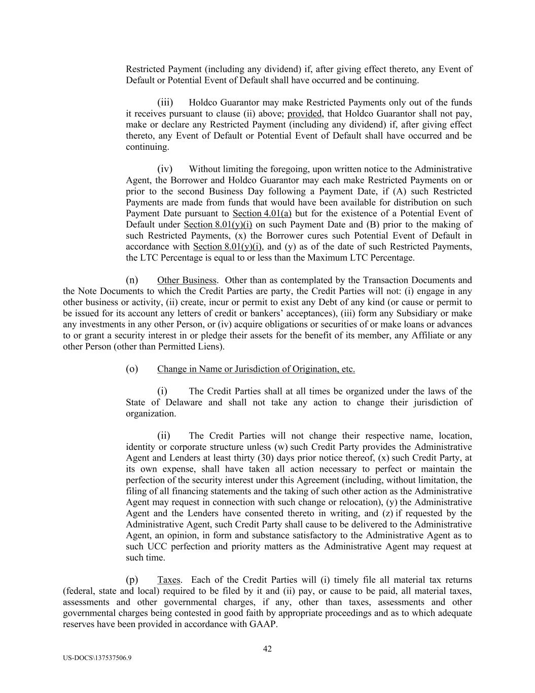 42 US-DOCS\137537506.9 Restricted Payment (including any dividend) if, after giving effect thereto, any Event of Default or Potential Event of Default shall have occurred and be continuing. (iii) Holdco Guarantor may make Restricted Payments only out of the funds it receives pursuant to clause (ii) above; provided, that Holdco Guarantor shall not pay, make or declare any Restricted Payment (including any dividend) if, after giving effect thereto, any Event of Default or Potential Event of Default shall have occurred and be continuing. (iv) Without limiting the foregoing, upon written notice to the Administrative Agent, the Borrower and Holdco Guarantor may each make Restricted Payments on or prior to the second Business Day following a Payment Date, if (A) such Restricted Payments are made from funds that would have been available for distribution on such Payment Date pursuant to Section 4.01(a) but for the existence of a Potential Event of Default under Section 8.01(y)(i) on such Payment Date and (B) prior to the making of such Restricted Payments, (x) the Borrower cures such Potential Event of Default in accordance with Section 8.01(y)(i), and (y) as of the date of such Restricted Payments, the LTC Percentage is equal to or less than the Maximum LTC Percentage. (n) Other Business. Other than as contemplated by the Transaction Documents and the Note Documents to which the Credit Parties are party, the Credit Parties will not: (i) engage in any other business or activity, (ii) create, incur or permit to exist any Debt of any kind (or cause or permit to be issued for its account any letters of credit or bankers’ acceptances), (iii) form any Subsidiary or make any investments in any other Person, or (iv) acquire obligations or securities of or make loans or advances to or grant a security interest in or pledge their assets for the benefit of its member, any Affiliate or any other Person (other than Permitted Liens). (o) Change in Name or Jurisdiction of Origination, etc. (i) The Credit Parties shall at all times be organized under the laws of the State of Delaware and shall not take any action to change their jurisdiction of organization. (ii) The Credit Parties will not change their respective name, location, identity or corporate structure unless (w) such Credit Party provides the Administrative Agent and Lenders at least thirty (30) days prior notice thereof, (x) such Credit Party, at its own expense, shall have taken all action necessary to perfect or maintain the perfection of the security interest under this Agreement (including, without limitation, the filing of all financing statements and the taking of such other action as the Administrative Agent may request in connection with such change or relocation), (y) the Administrative Agent and the Lenders have consented thereto in writing, and (z) if requested by the Administrative Agent, such Credit Party shall cause to be delivered to the Administrative Agent, an opinion, in form and substance satisfactory to the Administrative Agent as to such UCC perfection and priority matters as the Administrative Agent may request at such time. (p) Taxes. Each of the Credit Parties will (i) timely file all material tax returns (federal, state and local) required to be filed by it and (ii) pay, or cause to be paid, all material taxes, assessments and other governmental charges, if any, other than taxes, assessments and other governmental charges being contested in good faith by appropriate proceedings and as to which adequate reserves have been provided in accordance with GAAP.