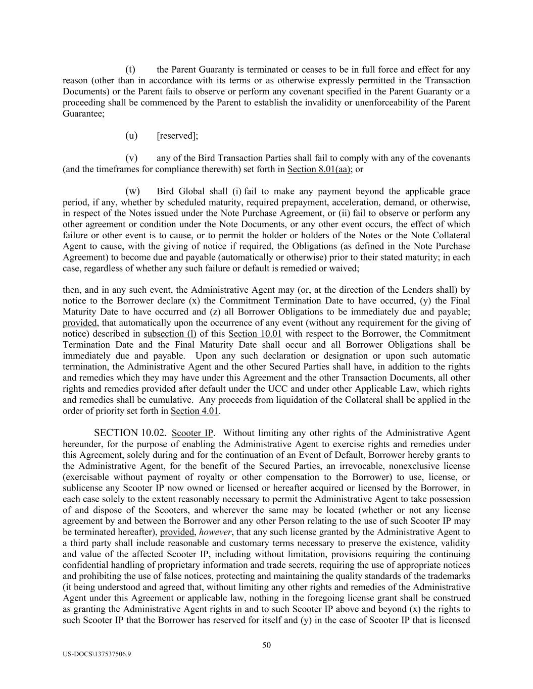 50 US-DOCS\137537506.9 (t) the Parent Guaranty is terminated or ceases to be in full force and effect for any reason (other than in accordance with its terms or as otherwise expressly permitted in the Transaction Documents) or the Parent fails to observe or perform any covenant specified in the Parent Guaranty or a proceeding shall be commenced by the Parent to establish the invalidity or unenforceability of the Parent Guarantee; (u) [reserved]; (v) any of the Bird Transaction Parties shall fail to comply with any of the covenants (and the timeframes for compliance therewith) set forth in Section 8.01(aa); or (w) Bird Global shall (i) fail to make any payment beyond the applicable grace period, if any, whether by scheduled maturity, required prepayment, acceleration, demand, or otherwise, in respect of the Notes issued under the Note Purchase Agreement, or (ii) fail to observe or perform any other agreement or condition under the Note Documents, or any other event occurs, the effect of which failure or other event is to cause, or to permit the holder or holders of the Notes or the Note Collateral Agent to cause, with the giving of notice if required, the Obligations (as defined in the Note Purchase Agreement) to become due and payable (automatically or otherwise) prior to their stated maturity; in each case, regardless of whether any such failure or default is remedied or waived; then, and in any such event, the Administrative Agent may (or, at the direction of the Lenders shall) by notice to the Borrower declare (x) the Commitment Termination Date to have occurred, (y) the Final Maturity Date to have occurred and (z) all Borrower Obligations to be immediately due and payable; provided, that automatically upon the occurrence of any event (without any requirement for the giving of notice) described in subsection (l) of this Section 10.01 with respect to the Borrower, the Commitment Termination Date and the Final Maturity Date shall occur and all Borrower Obligations shall be immediately due and payable. Upon any such declaration or designation or upon such automatic termination, the Administrative Agent and the other Secured Parties shall have, in addition to the rights and remedies which they may have under this Agreement and the other Transaction Documents, all other rights and remedies provided after default under the UCC and under other Applicable Law, which rights and remedies shall be cumulative. Any proceeds from liquidation of the Collateral shall be applied in the order of priority set forth in Section 4.01. SECTION 10.02. Scooter IP. Without limiting any other rights of the Administrative Agent hereunder, for the purpose of enabling the Administrative Agent to exercise rights and remedies under this Agreement, solely during and for the continuation of an Event of Default, Borrower hereby grants to the Administrative Agent, for the benefit of the Secured Parties, an irrevocable, nonexclusive license (exercisable without payment of royalty or other compensation to the Borrower) to use, license, or sublicense any Scooter IP now owned or licensed or hereafter acquired or licensed by the Borrower, in each case solely to the extent reasonably necessary to permit the Administrative Agent to take possession of and dispose of the Scooters, and wherever the same may be located (whether or not any license agreement by and between the Borrower and any other Person relating to the use of such Scooter IP may be terminated hereafter), provided, however, that any such license granted by the Administrative Agent to a third party shall include reasonable and customary terms necessary to preserve the existence, validity and value of the affected Scooter IP, including without limitation, provisions requiring the continuing confidential handling of proprietary information and trade secrets, requiring the use of appropriate notices and prohibiting the use of false notices, protecting and maintaining the quality standards of the trademarks (it being understood and agreed that, without limiting any other rights and remedies of the Administrative Agent under this Agreement or applicable law, nothing in the foregoing license grant shall be construed as granting the Administrative Agent rights in and to such Scooter IP above and beyond (x) the rights to such Scooter IP that the Borrower has reserved for itself and (y) in the case of Scooter IP that is licensed