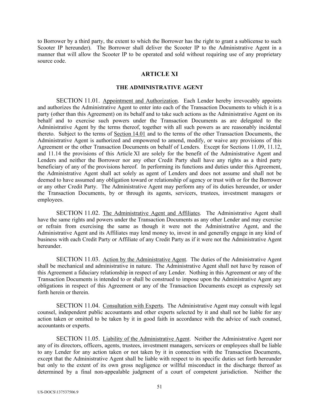 51 US-DOCS\137537506.9 to Borrower by a third party, the extent to which the Borrower has the right to grant a sublicense to such Scooter IP hereunder). The Borrower shall deliver the Scooter IP to the Administrative Agent in a manner that will allow the Scooter IP to be operated and sold without requiring use of any proprietary source code. ARTICLE XI THE ADMINISTRATIVE AGENT SECTION 11.01. Appointment and Authorization. Each Lender hereby irrevocably appoints and authorizes the Administrative Agent to enter into each of the Transaction Documents to which it is a party (other than this Agreement) on its behalf and to take such actions as the Administrative Agent on its behalf and to exercise such powers under the Transaction Documents as are delegated to the Administrative Agent by the terms thereof, together with all such powers as are reasonably incidental thereto. Subject to the terms of Section 14.01 and to the terms of the other Transaction Documents, the Administrative Agent is authorized and empowered to amend, modify, or waive any provisions of this Agreement or the other Transaction Documents on behalf of Lenders. Except for Sections 11.09, 11.12, and 11.14 the provisions of this Article XI are solely for the benefit of the Administrative Agent and Lenders and neither the Borrower nor any other Credit Party shall have any rights as a third party beneficiary of any of the provisions hereof. In performing its functions and duties under this Agreement, the Administrative Agent shall act solely as agent of Lenders and does not assume and shall not be deemed to have assumed any obligation toward or relationship of agency or trust with or for the Borrower or any other Credit Party. The Administrative Agent may perform any of its duties hereunder, or under the Transaction Documents, by or through its agents, servicers, trustees, investment managers or employees. SECTION 11.02. The Administrative Agent and Affiliates. The Administrative Agent shall have the same rights and powers under the Transaction Documents as any other Lender and may exercise or refrain from exercising the same as though it were not the Administrative Agent, and the Administrative Agent and its Affiliates may lend money to, invest in and generally engage in any kind of business with each Credit Party or Affiliate of any Credit Party as if it were not the Administrative Agent hereunder. SECTION 11.03. Action by the Administrative Agent. The duties of the Administrative Agent shall be mechanical and administrative in nature. The Administrative Agent shall not have by reason of this Agreement a fiduciary relationship in respect of any Lender. Nothing in this Agreement or any of the Transaction Documents is intended to or shall be construed to impose upon the Administrative Agent any obligations in respect of this Agreement or any of the Transaction Documents except as expressly set forth herein or therein. SECTION 11.04. Consultation with Experts. The Administrative Agent may consult with legal counsel, independent public accountants and other experts selected by it and shall not be liable for any action taken or omitted to be taken by it in good faith in accordance with the advice of such counsel, accountants or experts. SECTION 11.05. Liability of the Administrative Agent. Neither the Administrative Agent nor any of its directors, officers, agents, trustees, investment managers, servicers or employees shall be liable to any Lender for any action taken or not taken by it in connection with the Transaction Documents, except that the Administrative Agent shall be liable with respect to its specific duties set forth hereunder but only to the extent of its own gross negligence or willful misconduct in the discharge thereof as determined by a final non-appealable judgment of a court of competent jurisdiction. Neither the