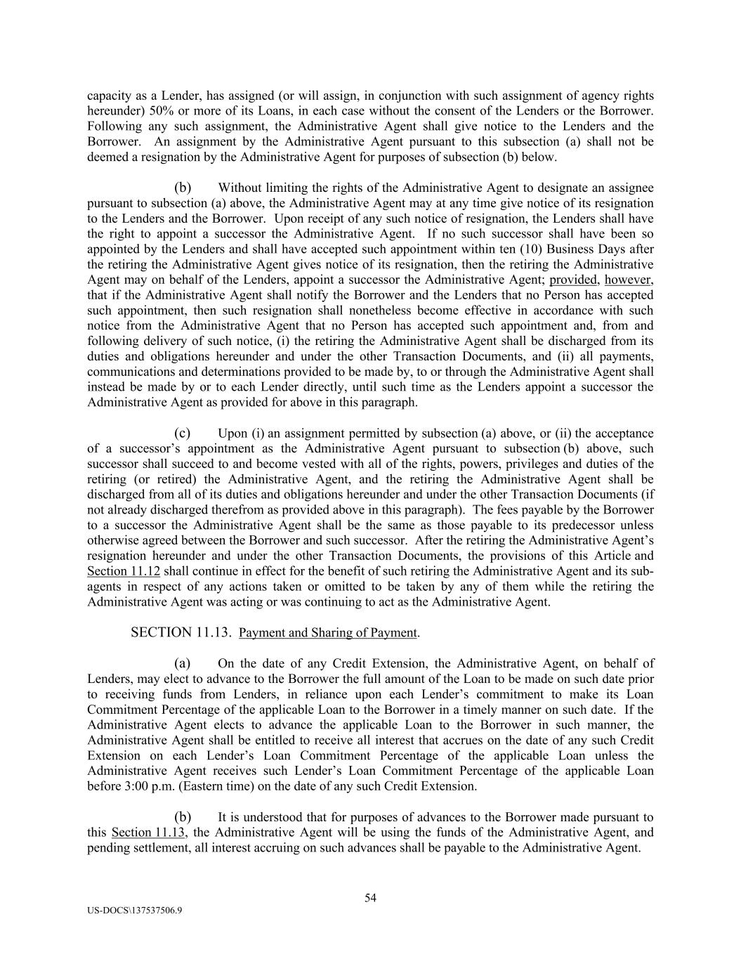 54 US-DOCS\137537506.9 capacity as a Lender, has assigned (or will assign, in conjunction with such assignment of agency rights hereunder) 50% or more of its Loans, in each case without the consent of the Lenders or the Borrower. Following any such assignment, the Administrative Agent shall give notice to the Lenders and the Borrower. An assignment by the Administrative Agent pursuant to this subsection (a) shall not be deemed a resignation by the Administrative Agent for purposes of subsection (b) below. (b) Without limiting the rights of the Administrative Agent to designate an assignee pursuant to subsection (a) above, the Administrative Agent may at any time give notice of its resignation to the Lenders and the Borrower. Upon receipt of any such notice of resignation, the Lenders shall have the right to appoint a successor the Administrative Agent. If no such successor shall have been so appointed by the Lenders and shall have accepted such appointment within ten (10) Business Days after the retiring the Administrative Agent gives notice of its resignation, then the retiring the Administrative Agent may on behalf of the Lenders, appoint a successor the Administrative Agent; provided, however, that if the Administrative Agent shall notify the Borrower and the Lenders that no Person has accepted such appointment, then such resignation shall nonetheless become effective in accordance with such notice from the Administrative Agent that no Person has accepted such appointment and, from and following delivery of such notice, (i) the retiring the Administrative Agent shall be discharged from its duties and obligations hereunder and under the other Transaction Documents, and (ii) all payments, communications and determinations provided to be made by, to or through the Administrative Agent shall instead be made by or to each Lender directly, until such time as the Lenders appoint a successor the Administrative Agent as provided for above in this paragraph. (c) Upon (i) an assignment permitted by subsection (a) above, or (ii) the acceptance of a successor’s appointment as the Administrative Agent pursuant to subsection (b) above, such successor shall succeed to and become vested with all of the rights, powers, privileges and duties of the retiring (or retired) the Administrative Agent, and the retiring the Administrative Agent shall be discharged from all of its duties and obligations hereunder and under the other Transaction Documents (if not already discharged therefrom as provided above in this paragraph). The fees payable by the Borrower to a successor the Administrative Agent shall be the same as those payable to its predecessor unless otherwise agreed between the Borrower and such successor. After the retiring the Administrative Agent’s resignation hereunder and under the other Transaction Documents, the provisions of this Article and Section 11.12 shall continue in effect for the benefit of such retiring the Administrative Agent and its sub- agents in respect of any actions taken or omitted to be taken by any of them while the retiring the Administrative Agent was acting or was continuing to act as the Administrative Agent. SECTION 11.13. Payment and Sharing of Payment. (a) On the date of any Credit Extension, the Administrative Agent, on behalf of Lenders, may elect to advance to the Borrower the full amount of the Loan to be made on such date prior to receiving funds from Lenders, in reliance upon each Lender’s commitment to make its Loan Commitment Percentage of the applicable Loan to the Borrower in a timely manner on such date. If the Administrative Agent elects to advance the applicable Loan to the Borrower in such manner, the Administrative Agent shall be entitled to receive all interest that accrues on the date of any such Credit Extension on each Lender’s Loan Commitment Percentage of the applicable Loan unless the Administrative Agent receives such Lender’s Loan Commitment Percentage of the applicable Loan before 3:00 p.m. (Eastern time) on the date of any such Credit Extension. (b) It is understood that for purposes of advances to the Borrower made pursuant to this Section 11.13, the Administrative Agent will be using the funds of the Administrative Agent, and pending settlement, all interest accruing on such advances shall be payable to the Administrative Agent.