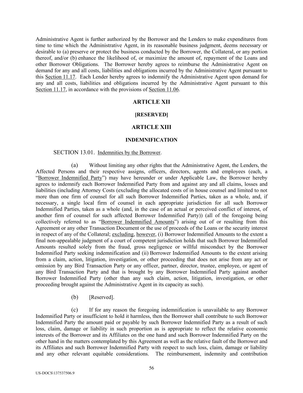 56 US-DOCS\137537506.9 Administrative Agent is further authorized by the Borrower and the Lenders to make expenditures from time to time which the Administrative Agent, in its reasonable business judgment, deems necessary or desirable to (a) preserve or protect the business conducted by the Borrower, the Collateral, or any portion thereof, and/or (b) enhance the likelihood of, or maximize the amount of, repayment of the Loans and other Borrower Obligations. The Borrower hereby agrees to reimburse the Administrative Agent on demand for any and all costs, liabilities and obligations incurred by the Administrative Agent pursuant to this Section 11.17. Each Lender hereby agrees to indemnify the Administrative Agent upon demand for any and all costs, liabilities and obligations incurred by the Administrative Agent pursuant to this Section 11.17, in accordance with the provisions of Section 11.06. ARTICLE XII [RESERVED] ARTICLE XIII INDEMNIFICATION SECTION 13.01. Indemnities by the Borrower. (a) Without limiting any other rights that the Administrative Agent, the Lenders, the Affected Persons and their respective assigns, officers, directors, agents and employees (each, a “Borrower Indemnified Party”) may have hereunder or under Applicable Law, the Borrower hereby agrees to indemnify each Borrower Indemnified Party from and against any and all claims, losses and liabilities (including Attorney Costs (excluding the allocated costs of in house counsel and limited to not more than one firm of counsel for all such Borrower Indemnified Parties, taken as a whole, and, if necessary, a single local firm of counsel in each appropriate jurisdiction for all such Borrower Indemnified Parties, taken as a whole (and, in the case of an actual or perceived conflict of interest, of another firm of counsel for such affected Borrower Indemnified Party)) (all of the foregoing being collectively referred to as “Borrower Indemnified Amounts”) arising out of or resulting from this Agreement or any other Transaction Document or the use of proceeds of the Loans or the security interest in respect of any of the Collateral; excluding, however, (i) Borrower Indemnified Amounts to the extent a final non-appealable judgment of a court of competent jurisdiction holds that such Borrower Indemnified Amounts resulted solely from the fraud, gross negligence or willful misconduct by the Borrower Indemnified Party seeking indemnification and (ii) Borrower Indemnified Amounts to the extent arising from a claim, action, litigation, investigation, or other proceeding that does not arise from any act or omission by any Bird Transaction Party or any officer, partner, director, trustee, employee, or agent of any Bird Transaction Party and that is brought by any Borrower Indemnified Party against another Borrower Indemnified Party (other than any such claim, action, litigation, investigation, or other proceeding brought against the Administrative Agent in its capacity as such). (b) [Reserved]. (c) If for any reason the foregoing indemnification is unavailable to any Borrower Indemnified Party or insufficient to hold it harmless, then the Borrower shall contribute to such Borrower Indemnified Party the amount paid or payable by such Borrower Indemnified Party as a result of such loss, claim, damage or liability in such proportion as is appropriate to reflect the relative economic interests of the Borrower and its Affiliates on the one hand and such Borrower Indemnified Party on the other hand in the matters contemplated by this Agreement as well as the relative fault of the Borrower and its Affiliates and such Borrower Indemnified Party with respect to such loss, claim, damage or liability and any other relevant equitable considerations. The reimbursement, indemnity and contribution