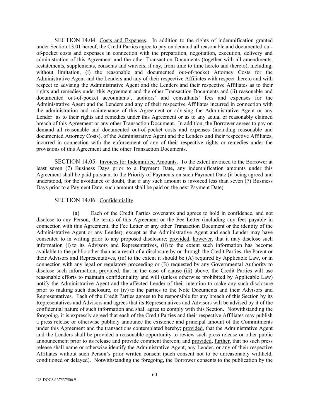 60 US-DOCS\137537506.9 SECTION 14.04. Costs and Expenses. In addition to the rights of indemnification granted under Section 13.01 hereof, the Credit Parties agree to pay on demand all reasonable and documented out- of-pocket costs and expenses in connection with the preparation, negotiation, execution, delivery and administration of this Agreement and the other Transaction Documents (together with all amendments, restatements, supplements, consents and waivers, if any, from time to time hereto and thereto), including, without limitation, (i) the reasonable and documented out-of-pocket Attorney Costs for the Administrative Agent and the Lenders and any of their respective Affiliates with respect thereto and with respect to advising the Administrative Agent and the Lenders and their respective Affiliates as to their rights and remedies under this Agreement and the other Transaction Documents and (ii) reasonable and documented out-of-pocket accountants’, auditors’ and consultants’ fees and expenses for the Administrative Agent and the Lenders and any of their respective Affiliates incurred in connection with the administration and maintenance of this Agreement or advising the Administrative Agent or any Lender as to their rights and remedies under this Agreement or as to any actual or reasonably claimed breach of this Agreement or any other Transaction Document. In addition, the Borrower agrees to pay on demand all reasonable and documented out-of-pocket costs and expenses (including reasonable and documented Attorney Costs), of the Administrative Agent and the Lenders and their respective Affiliates, incurred in connection with the enforcement of any of their respective rights or remedies under the provisions of this Agreement and the other Transaction Documents. SECTION 14.05. Invoices for Indemnified Amounts. To the extent invoiced to the Borrower at least seven (7) Business Days prior to a Payment Date, any indemnification amounts under this Agreement shall be paid pursuant to the Priority of Payments on such Payment Date (it being agreed and understood, for the avoidance of doubt, that if any such amount is invoiced less than seven (7) Business Days prior to a Payment Date, such amount shall be paid on the next Payment Date). SECTION 14.06. Confidentiality. (a) Each of the Credit Parties covenants and agrees to hold in confidence, and not disclose to any Person, the terms of this Agreement or the Fee Letter (including any fees payable in connection with this Agreement, the Fee Letter or any other Transaction Document or the identity of the Administrative Agent or any Lender), except as the Administrative Agent and each Lender may have consented to in writing prior to any proposed disclosure; provided, however, that it may disclose such information (i) to its Advisors and Representatives, (ii) to the extent such information has become available to the public other than as a result of a disclosure by or through the Credit Parties, the Parent or their Advisors and Representatives, (iii) to the extent it should be (A) required by Applicable Law, or in connection with any legal or regulatory proceeding or (B) requested by any Governmental Authority to disclose such information; provided, that in the case of clause (iii) above, the Credit Parties will use reasonable efforts to maintain confidentiality and will (unless otherwise prohibited by Applicable Law) notify the Administrative Agent and the affected Lender of their intention to make any such disclosure prior to making such disclosure, or (iv) to the parties to the Note Documents and their Advisors and Representatives. Each of the Credit Parties agrees to be responsible for any breach of this Section by its Representatives and Advisors and agrees that its Representatives and Advisors will be advised by it of the confidential nature of such information and shall agree to comply with this Section. Notwithstanding the foregoing, it is expressly agreed that each of the Credit Parties and their respective Affiliates may publish a press release or otherwise publicly announce the existence and principal amount of the Commitments under this Agreement and the transactions contemplated hereby; provided, that the Administrative Agent and the Lenders shall be provided a reasonable opportunity to review such press release or other public announcement prior to its release and provide comment thereon; and provided, further, that no such press release shall name or otherwise identify the Administrative Agent, any Lender, or any of their respective Affiliates without such Person’s prior written consent (such consent not to be unreasonably withheld, conditioned or delayed). Notwithstanding the foregoing, the Borrower consents to the publication by the