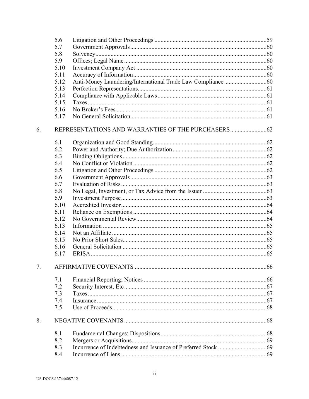 ii US-DOCS\137446087.12 5.6 Litigation and Other Proceedings ..........................................................................59 5.7 Government Approvals ..........................................................................................60 5.8 Solvency .................................................................................................................60 5.9 Offices; Legal Name ..............................................................................................60 5.10 Investment Company Act ......................................................................................60 5.11 Accuracy of Information ........................................................................................60 5.12 Anti-Money Laundering/International Trade Law Compliance ............................60 5.13 Perfection Representations .....................................................................................61 5.14 Compliance with Applicable Laws ........................................................................61 5.15 Taxes ......................................................................................................................61 5.16 No Broker’s Fees ...................................................................................................61 5.17 No General Solicitation ..........................................................................................61 6. REPRESENTATIONS AND WARRANTIES OF THE PURCHASERS ........................62 6.1 Organization and Good Standing ...........................................................................62 6.2 Power and Authority; Due Authorization ..............................................................62 6.3 Binding Obligations ...............................................................................................62 6.4 No Conflict or Violation ........................................................................................62 6.5 Litigation and Other Proceedings ..........................................................................62 6.6 Government Approvals ..........................................................................................63 6.7 Evaluation of Risks ................................................................................................63 6.8 No Legal, Investment, or Tax Advice from the Issuer ..........................................63 6.9 Investment Purpose ................................................................................................63 6.10 Accredited Investor ................................................................................................64 6.11 Reliance on Exemptions ........................................................................................64 6.12 No Governmental Review ......................................................................................64 6.13 Information ............................................................................................................65 6.14 Not an Affiliate ......................................................................................................65 6.15 No Prior Short Sales...............................................................................................65 6.16 General Solicitation ...............................................................................................65 6.17 ERISA ....................................................................................................................65 7. AFFIRMATIVE COVENANTS .......................................................................................66 7.1 Financial Reporting; Notices .................................................................................66 7.2 Security Interest, Etc ..............................................................................................67 7.3 Taxes ......................................................................................................................67 7.4 Insurance ................................................................................................................67 7.5 Use of Proceeds ......................................................................................................68 8. NEGATIVE COVENANTS ..............................................................................................68 8.1 Fundamental Changes; Dispositions ......................................................................68 8.2 Mergers or Acquisitions .........................................................................................69 8.3 Incurrence of Indebtedness and Issuance of Preferred Stock ................................69 8.4 Incurrence of Liens ................................................................................................69