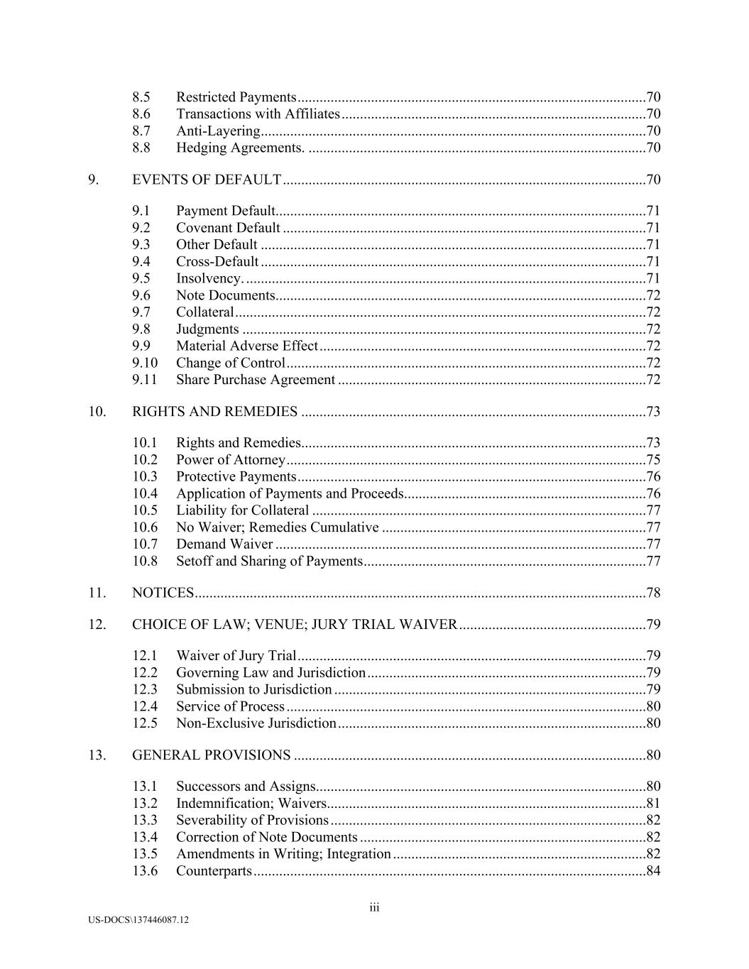 iii US-DOCS\137446087.12 8.5 Restricted Payments ...............................................................................................70 8.6 Transactions with Affiliates ...................................................................................70 8.7 Anti-Layering .........................................................................................................70 8.8 Hedging Agreements. ............................................................................................70 9. EVENTS OF DEFAULT ...................................................................................................70 9.1 Payment Default .....................................................................................................71 9.2 Covenant Default ...................................................................................................71 9.3 Other Default .........................................................................................................71 9.4 Cross-Default .........................................................................................................71 9.5 Insolvency. .............................................................................................................71 9.6 Note Documents .....................................................................................................72 9.7 Collateral ................................................................................................................72 9.8 Judgments ..............................................................................................................72 9.9 Material Adverse Effect .........................................................................................72 9.10 Change of Control ..................................................................................................72 9.11 Share Purchase Agreement ....................................................................................72 10. RIGHTS AND REMEDIES ..............................................................................................73 10.1 Rights and Remedies ..............................................................................................73 10.2 Power of Attorney ..................................................................................................75 10.3 Protective Payments ...............................................................................................76 10.4 Application of Payments and Proceeds ..................................................................76 10.5 Liability for Collateral ...........................................................................................77 10.6 No Waiver; Remedies Cumulative ........................................................................77 10.7 Demand Waiver .....................................................................................................77 10.8 Setoff and Sharing of Payments .............................................................................77 11. NOTICES ...........................................................................................................................78 12. CHOICE OF LAW; VENUE; JURY TRIAL WAIVER ...................................................79 12.1 Waiver of Jury Trial ...............................................................................................79 12.2 Governing Law and Jurisdiction ............................................................................79 12.3 Submission to Jurisdiction .....................................................................................79 12.4 Service of Process ..................................................................................................80 12.5 Non-Exclusive Jurisdiction ....................................................................................80 13. GENERAL PROVISIONS ................................................................................................80 13.1 Successors and Assigns ..........................................................................................80 13.2 Indemnification; Waivers .......................................................................................81 13.3 Severability of Provisions ......................................................................................82 13.4 Correction of Note Documents ..............................................................................82 13.5 Amendments in Writing; Integration .....................................................................82 13.6 Counterparts ...........................................................................................................84