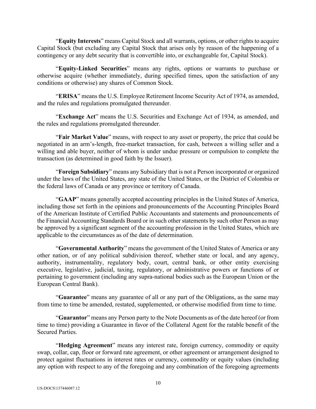 10 US-DOCS\137446087.12 “Equity Interests” means Capital Stock and all warrants, options, or other rights to acquire Capital Stock (but excluding any Capital Stock that arises only by reason of the happening of a contingency or any debt security that is convertible into, or exchangeable for, Capital Stock). “Equity-Linked Securities” means any rights, options or warrants to purchase or otherwise acquire (whether immediately, during specified times, upon the satisfaction of any conditions or otherwise) any shares of Common Stock. “ERISA” means the U.S. Employee Retirement Income Security Act of 1974, as amended, and the rules and regulations promulgated thereunder. “Exchange Act” means the U.S. Securities and Exchange Act of 1934, as amended, and the rules and regulations promulgated thereunder. “Fair Market Value” means, with respect to any asset or property, the price that could be negotiated in an arm’s-length, free-market transaction, for cash, between a willing seller and a willing and able buyer, neither of whom is under undue pressure or compulsion to complete the transaction (as determined in good faith by the Issuer). “Foreign Subsidiary” means any Subsidiary that is not a Person incorporated or organized under the laws of the United States, any state of the United States, or the District of Colombia or the federal laws of Canada or any province or territory of Canada. “GAAP” means generally accepted accounting principles in the United States of America, including those set forth in the opinions and pronouncements of the Accounting Principles Board of the American Institute of Certified Public Accountants and statements and pronouncements of the Financial Accounting Standards Board or in such other statements by such other Person as may be approved by a significant segment of the accounting profession in the United States, which are applicable to the circumstances as of the date of determination. “Governmental Authority” means the government of the United States of America or any other nation, or of any political subdivision thereof, whether state or local, and any agency, authority, instrumentality, regulatory body, court, central bank, or other entity exercising executive, legislative, judicial, taxing, regulatory, or administrative powers or functions of or pertaining to government (including any supra-national bodies such as the European Union or the European Central Bank). “Guarantee” means any guarantee of all or any part of the Obligations, as the same may from time to time be amended, restated, supplemented, or otherwise modified from time to time. “Guarantor” means any Person party to the Note Documents as of the date hereof (or from time to time) providing a Guarantee in favor of the Collateral Agent for the ratable benefit of the Secured Parties. “Hedging Agreement” means any interest rate, foreign currency, commodity or equity swap, collar, cap, floor or forward rate agreement, or other agreement or arrangement designed to protect against fluctuations in interest rates or currency, commodity or equity values (including any option with respect to any of the foregoing and any combination of the foregoing agreements