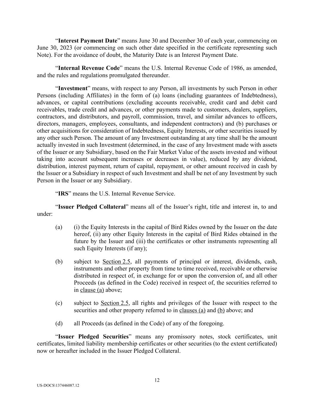 12 US-DOCS\137446087.12 “Interest Payment Date” means June 30 and December 30 of each year, commencing on June 30, 2023 (or commencing on such other date specified in the certificate representing such Note). For the avoidance of doubt, the Maturity Date is an Interest Payment Date. “Internal Revenue Code” means the U.S. Internal Revenue Code of 1986, as amended, and the rules and regulations promulgated thereunder. “Investment” means, with respect to any Person, all investments by such Person in other Persons (including Affiliates) in the form of (a) loans (including guarantees of Indebtedness), advances, or capital contributions (excluding accounts receivable, credit card and debit card receivables, trade credit and advances, or other payments made to customers, dealers, suppliers, contractors, and distributors, and payroll, commission, travel, and similar advances to officers, directors, managers, employees, consultants, and independent contractors) and (b) purchases or other acquisitions for consideration of Indebtedness, Equity Interests, or other securities issued by any other such Person. The amount of any Investment outstanding at any time shall be the amount actually invested in such Investment (determined, in the case of any Investment made with assets of the Issuer or any Subsidiary, based on the Fair Market Value of the assets invested and without taking into account subsequent increases or decreases in value), reduced by any dividend, distribution, interest payment, return of capital, repayment, or other amount received in cash by the Issuer or a Subsidiary in respect of such Investment and shall be net of any Investment by such Person in the Issuer or any Subsidiary. “IRS” means the U.S. Internal Revenue Service. “Issuer Pledged Collateral” means all of the Issuer’s right, title and interest in, to and under: (a) (i) the Equity Interests in the capital of Bird Rides owned by the Issuer on the date hereof, (ii) any other Equity Interests in the capital of Bird Rides obtained in the future by the Issuer and (iii) the certificates or other instruments representing all such Equity Interests (if any); (b) subject to Section 2.5, all payments of principal or interest, dividends, cash, instruments and other property from time to time received, receivable or otherwise distributed in respect of, in exchange for or upon the conversion of, and all other Proceeds (as defined in the Code) received in respect of, the securities referred to in clause (a) above; (c) subject to Section 2.5, all rights and privileges of the Issuer with respect to the securities and other property referred to in clauses (a) and (b) above; and (d) all Proceeds (as defined in the Code) of any of the foregoing. “Issuer Pledged Securities” means any promissory notes, stock certificates, unit certificates, limited liability membership certificates or other securities (to the extent certificated) now or hereafter included in the Issuer Pledged Collateral.