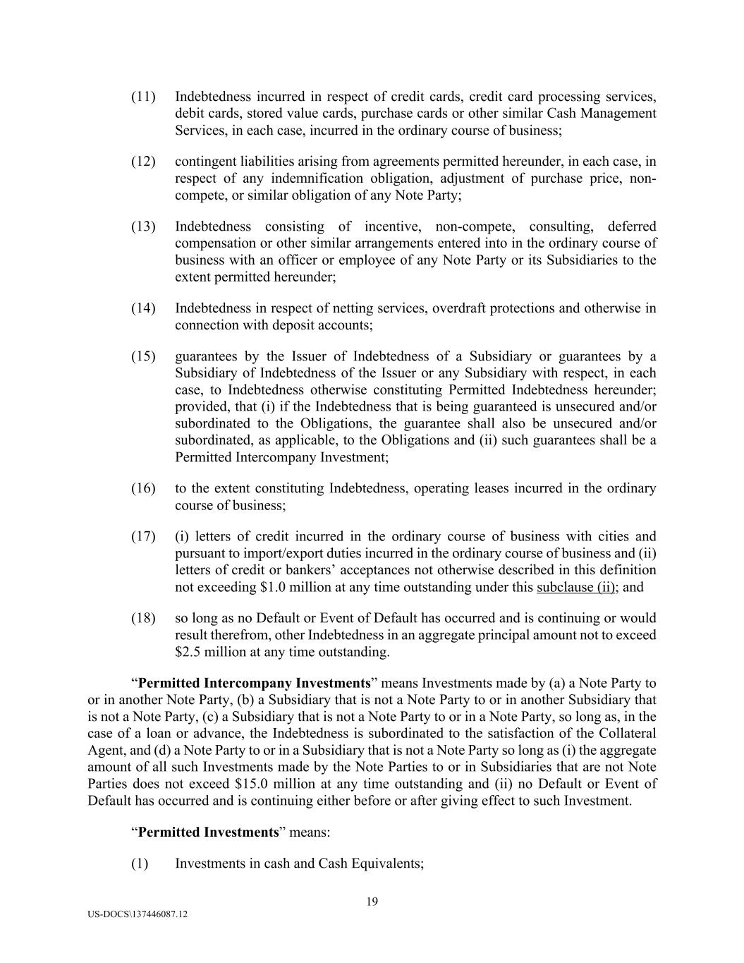 19 US-DOCS\137446087.12 (11) Indebtedness incurred in respect of credit cards, credit card processing services, debit cards, stored value cards, purchase cards or other similar Cash Management Services, in each case, incurred in the ordinary course of business; (12) contingent liabilities arising from agreements permitted hereunder, in each case, in respect of any indemnification obligation, adjustment of purchase price, non- compete, or similar obligation of any Note Party; (13) Indebtedness consisting of incentive, non-compete, consulting, deferred compensation or other similar arrangements entered into in the ordinary course of business with an officer or employee of any Note Party or its Subsidiaries to the extent permitted hereunder; (14) Indebtedness in respect of netting services, overdraft protections and otherwise in connection with deposit accounts; (15) guarantees by the Issuer of Indebtedness of a Subsidiary or guarantees by a Subsidiary of Indebtedness of the Issuer or any Subsidiary with respect, in each case, to Indebtedness otherwise constituting Permitted Indebtedness hereunder; provided, that (i) if the Indebtedness that is being guaranteed is unsecured and/or subordinated to the Obligations, the guarantee shall also be unsecured and/or subordinated, as applicable, to the Obligations and (ii) such guarantees shall be a Permitted Intercompany Investment; (16) to the extent constituting Indebtedness, operating leases incurred in the ordinary course of business; (17) (i) letters of credit incurred in the ordinary course of business with cities and pursuant to import/export duties incurred in the ordinary course of business and (ii) letters of credit or bankers’ acceptances not otherwise described in this definition not exceeding $1.0 million at any time outstanding under this subclause (ii); and (18) so long as no Default or Event of Default has occurred and is continuing or would result therefrom, other Indebtedness in an aggregate principal amount not to exceed $2.5 million at any time outstanding. “Permitted Intercompany Investments” means Investments made by (a) a Note Party to or in another Note Party, (b) a Subsidiary that is not a Note Party to or in another Subsidiary that is not a Note Party, (c) a Subsidiary that is not a Note Party to or in a Note Party, so long as, in the case of a loan or advance, the Indebtedness is subordinated to the satisfaction of the Collateral Agent, and (d) a Note Party to or in a Subsidiary that is not a Note Party so long as (i) the aggregate amount of all such Investments made by the Note Parties to or in Subsidiaries that are not Note Parties does not exceed $15.0 million at any time outstanding and (ii) no Default or Event of Default has occurred and is continuing either before or after giving effect to such Investment. “Permitted Investments” means: (1) Investments in cash and Cash Equivalents;
