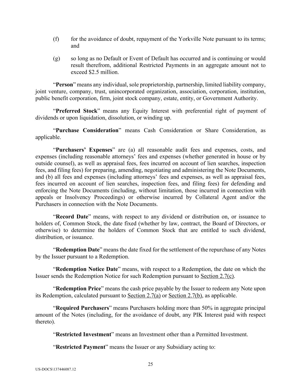 25 US-DOCS\137446087.12 (f) for the avoidance of doubt, repayment of the Yorkville Note pursuant to its terms; and (g) so long as no Default or Event of Default has occurred and is continuing or would result therefrom, additional Restricted Payments in an aggregate amount not to exceed $2.5 million. “Person” means any individual, sole proprietorship, partnership, limited liability company, joint venture, company, trust, unincorporated organization, association, corporation, institution, public benefit corporation, firm, joint stock company, estate, entity, or Government Authority. “Preferred Stock” means any Equity Interest with preferential right of payment of dividends or upon liquidation, dissolution, or winding up. “Purchase Consideration” means Cash Consideration or Share Consideration, as applicable. “Purchasers’ Expenses” are (a) all reasonable audit fees and expenses, costs, and expenses (including reasonable attorneys’ fees and expenses (whether generated in house or by outside counsel), as well as appraisal fees, fees incurred on account of lien searches, inspection fees, and filing fees) for preparing, amending, negotiating and administering the Note Documents, and (b) all fees and expenses (including attorneys’ fees and expenses, as well as appraisal fees, fees incurred on account of lien searches, inspection fees, and filing fees) for defending and enforcing the Note Documents (including, without limitation, those incurred in connection with appeals or Insolvency Proceedings) or otherwise incurred by Collateral Agent and/or the Purchasers in connection with the Note Documents. “Record Date” means, with respect to any dividend or distribution on, or issuance to holders of, Common Stock, the date fixed (whether by law, contract, the Board of Directors, or otherwise) to determine the holders of Common Stock that are entitled to such dividend, distribution, or issuance. “Redemption Date” means the date fixed for the settlement of the repurchase of any Notes by the Issuer pursuant to a Redemption. “Redemption Notice Date” means, with respect to a Redemption, the date on which the Issuer sends the Redemption Notice for such Redemption pursuant to Section 2.7(c). “Redemption Price” means the cash price payable by the Issuer to redeem any Note upon its Redemption, calculated pursuant to Section 2.7(a) or Section 2.7(b), as applicable. “Required Purchasers” means Purchasers holding more than 50% in aggregate principal amount of the Notes (including, for the avoidance of doubt, any PIK Interest paid with respect thereto). “Restricted Investment” means an Investment other than a Permitted Investment. “Restricted Payment” means the Issuer or any Subsidiary acting to: