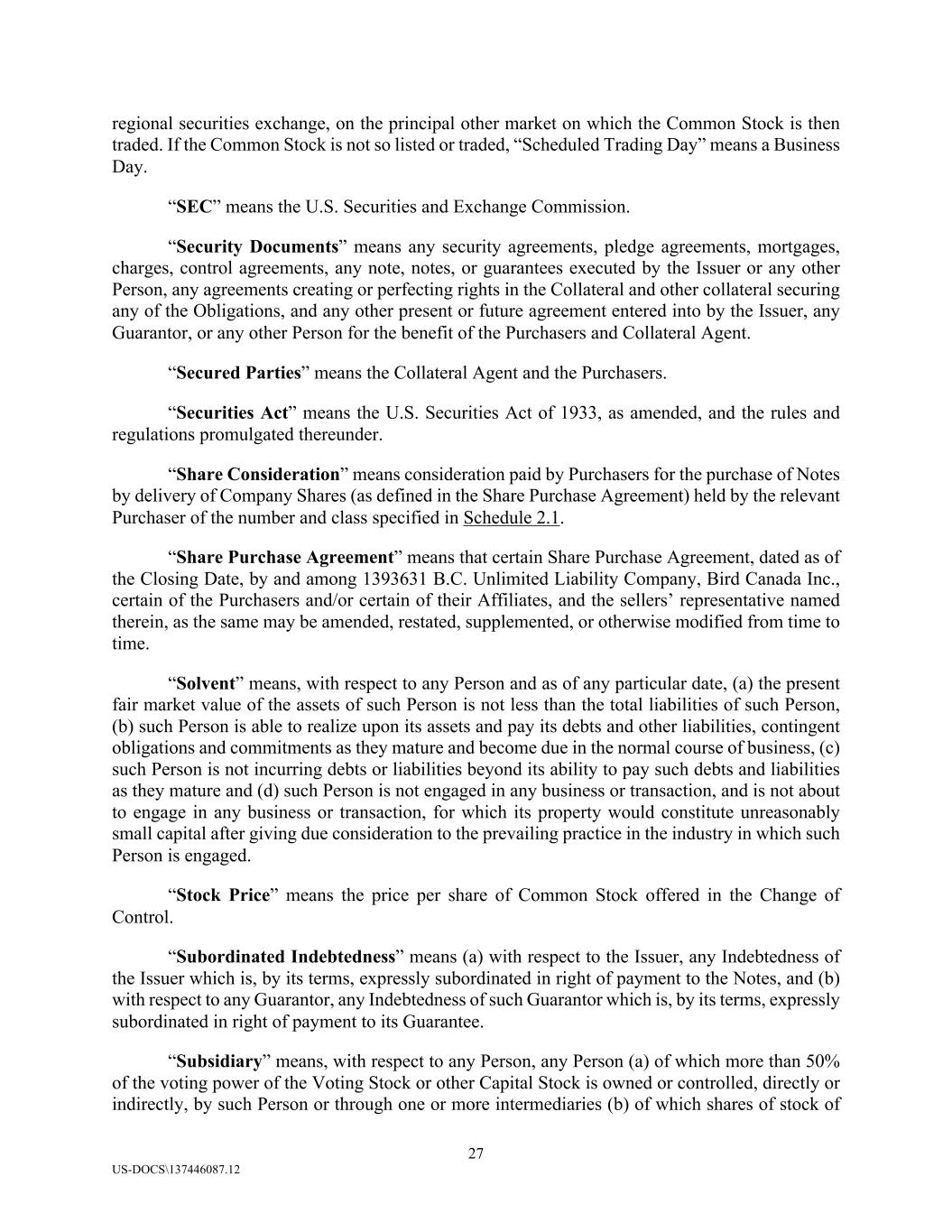 27 US-DOCS\137446087.12 regional securities exchange, on the principal other market on which the Common Stock is then traded. If the Common Stock is not so listed or traded, “Scheduled Trading Day” means a Business Day. “SEC” means the U.S. Securities and Exchange Commission. “Security Documents” means any security agreements, pledge agreements, mortgages, charges, control agreements, any note, notes, or guarantees executed by the Issuer or any other Person, any agreements creating or perfecting rights in the Collateral and other collateral securing any of the Obligations, and any other present or future agreement entered into by the Issuer, any Guarantor, or any other Person for the benefit of the Purchasers and Collateral Agent. “Secured Parties” means the Collateral Agent and the Purchasers. “Securities Act” means the U.S. Securities Act of 1933, as amended, and the rules and regulations promulgated thereunder. “Share Consideration” means consideration paid by Purchasers for the purchase of Notes by delivery of Company Shares (as defined in the Share Purchase Agreement) held by the relevant Purchaser of the number and class specified in Schedule 2.1. “Share Purchase Agreement” means that certain Share Purchase Agreement, dated as of the Closing Date, by and among 1393631 B.C. Unlimited Liability Company, Bird Canada Inc., certain of the Purchasers and/or certain of their Affiliates, and the sellers’ representative named therein, as the same may be amended, restated, supplemented, or otherwise modified from time to time. “Solvent” means, with respect to any Person and as of any particular date, (a) the present fair market value of the assets of such Person is not less than the total liabilities of such Person, (b) such Person is able to realize upon its assets and pay its debts and other liabilities, contingent obligations and commitments as they mature and become due in the normal course of business, (c) such Person is not incurring debts or liabilities beyond its ability to pay such debts and liabilities as they mature and (d) such Person is not engaged in any business or transaction, and is not about to engage in any business or transaction, for which its property would constitute unreasonably small capital after giving due consideration to the prevailing practice in the industry in which such Person is engaged. “Stock Price” means the price per share of Common Stock offered in the Change of Control. “Subordinated Indebtedness” means (a) with respect to the Issuer, any Indebtedness of the Issuer which is, by its terms, expressly subordinated in right of payment to the Notes, and (b) with respect to any Guarantor, any Indebtedness of such Guarantor which is, by its terms, expressly subordinated in right of payment to its Guarantee. “Subsidiary” means, with respect to any Person, any Person (a) of which more than 50% of the voting power of the Voting Stock or other Capital Stock is owned or controlled, directly or indirectly, by such Person or through one or more intermediaries (b) of which shares of stock of