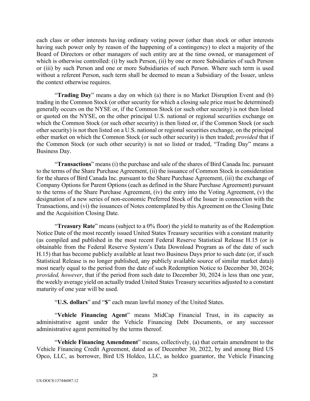 28 US-DOCS\137446087.12 each class or other interests having ordinary voting power (other than stock or other interests having such power only by reason of the happening of a contingency) to elect a majority of the Board of Directors or other managers of such entity are at the time owned, or management of which is otherwise controlled: (i) by such Person, (ii) by one or more Subsidiaries of such Person or (iii) by such Person and one or more Subsidiaries of such Person. Where such term is used without a referent Person, such term shall be deemed to mean a Subsidiary of the Issuer, unless the context otherwise requires. “Trading Day” means a day on which (a) there is no Market Disruption Event and (b) trading in the Common Stock (or other security for which a closing sale price must be determined) generally occurs on the NYSE or, if the Common Stock (or such other security) is not then listed or quoted on the NYSE, on the other principal U.S. national or regional securities exchange on which the Common Stock (or such other security) is then listed or, if the Common Stock (or such other security) is not then listed on a U.S. national or regional securities exchange, on the principal other market on which the Common Stock (or such other security) is then traded; provided that if the Common Stock (or such other security) is not so listed or traded, “Trading Day” means a Business Day. “Transactions” means (i) the purchase and sale of the shares of Bird Canada Inc. pursuant to the terms of the Share Purchase Agreement, (ii) the issuance of Common Stock in consideration for the shares of Bird Canada Inc. pursuant to the Share Purchase Agreement, (iii) the exchange of Company Options for Parent Options (each as defined in the Share Purchase Agreement) pursuant to the terms of the Share Purchase Agreement, (iv) the entry into the Voting Agreement, (v) the designation of a new series of non-economic Preferred Stock of the Issuer in connection with the Transactions, and (vi) the issuances of Notes contemplated by this Agreement on the Closing Date and the Acquisition Closing Date. “Treasury Rate” means (subject to a 0% floor) the yield to maturity as of the Redemption Notice Date of the most recently issued United States Treasury securities with a constant maturity (as compiled and published in the most recent Federal Reserve Statistical Release H.15 (or is obtainable from the Federal Reserve System’s Data Download Program as of the date of such H.15) that has become publicly available at least two Business Days prior to such date (or, if such Statistical Release is no longer published, any publicly available source of similar market data)) most nearly equal to the period from the date of such Redemption Notice to December 30, 2024; provided, however, that if the period from such date to December 30, 2024 is less than one year, the weekly average yield on actually traded United States Treasury securities adjusted to a constant maturity of one year will be used. “U.S. dollars” and “$” each mean lawful money of the United States. “Vehicle Financing Agent” means MidCap Financial Trust, in its capacity as administrative agent under the Vehicle Financing Debt Documents, or any successor administrative agent permitted by the terms thereof. “Vehicle Financing Amendment” means, collectively, (a) that certain amendment to the Vehicle Financing Credit Agreement, dated as of December 30, 2022, by and among Bird US Opco, LLC, as borrower, Bird US Holdco, LLC, as holdco guarantor, the Vehicle Financing