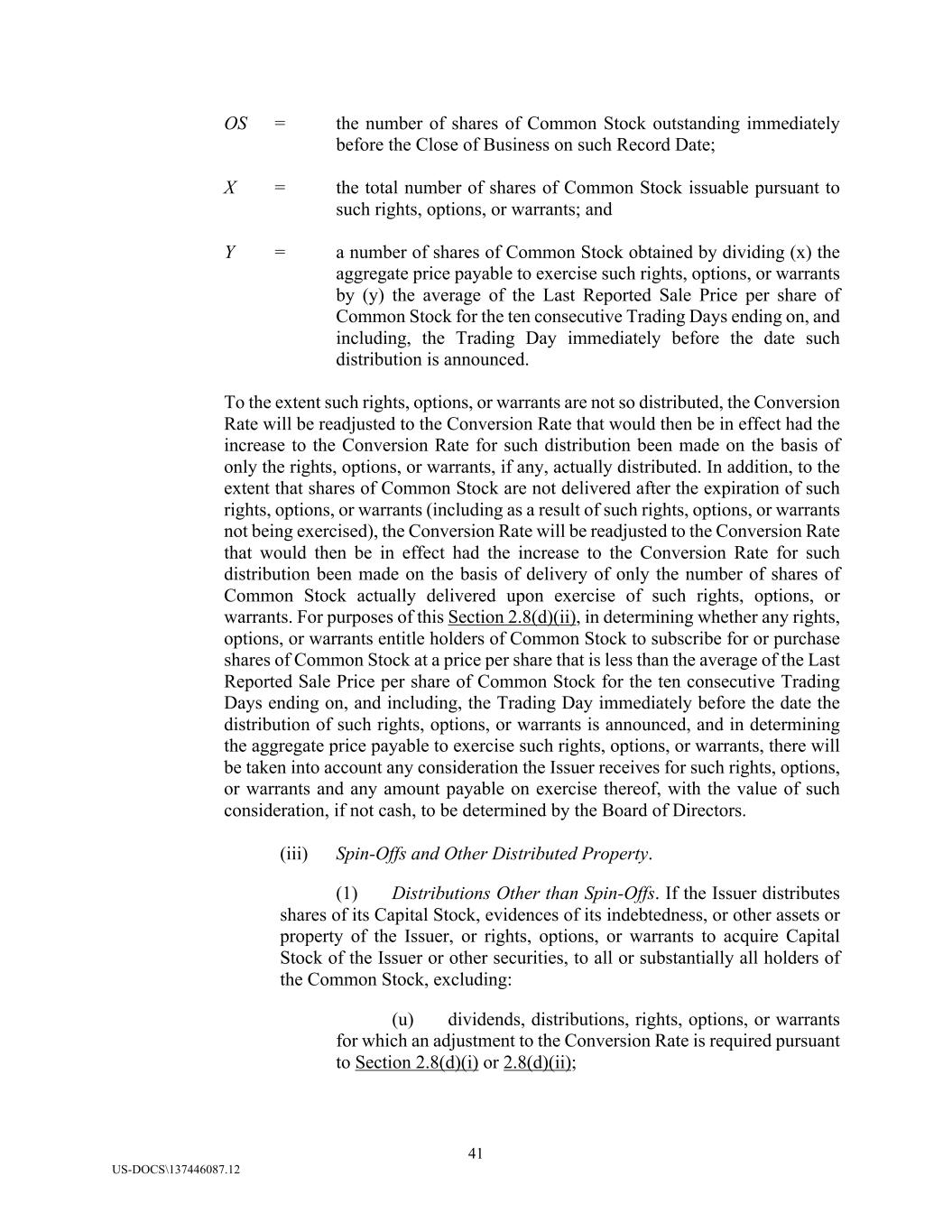 41 US-DOCS\137446087.12 OS = the number of shares of Common Stock outstanding immediately before the Close of Business on such Record Date; X = the total number of shares of Common Stock issuable pursuant to such rights, options, or warrants; and Y = a number of shares of Common Stock obtained by dividing (x) the aggregate price payable to exercise such rights, options, or warrants by (y) the average of the Last Reported Sale Price per share of Common Stock for the ten consecutive Trading Days ending on, and including, the Trading Day immediately before the date such distribution is announced. To the extent such rights, options, or warrants are not so distributed, the Conversion Rate will be readjusted to the Conversion Rate that would then be in effect had the increase to the Conversion Rate for such distribution been made on the basis of only the rights, options, or warrants, if any, actually distributed. In addition, to the extent that shares of Common Stock are not delivered after the expiration of such rights, options, or warrants (including as a result of such rights, options, or warrants not being exercised), the Conversion Rate will be readjusted to the Conversion Rate that would then be in effect had the increase to the Conversion Rate for such distribution been made on the basis of delivery of only the number of shares of Common Stock actually delivered upon exercise of such rights, options, or warrants. For purposes of this Section 2.8(d)(ii), in determining whether any rights, options, or warrants entitle holders of Common Stock to subscribe for or purchase shares of Common Stock at a price per share that is less than the average of the Last Reported Sale Price per share of Common Stock for the ten consecutive Trading Days ending on, and including, the Trading Day immediately before the date the distribution of such rights, options, or warrants is announced, and in determining the aggregate price payable to exercise such rights, options, or warrants, there will be taken into account any consideration the Issuer receives for such rights, options, or warrants and any amount payable on exercise thereof, with the value of such consideration, if not cash, to be determined by the Board of Directors. (iii) Spin-Offs and Other Distributed Property. (1) Distributions Other than Spin-Offs. If the Issuer distributes shares of its Capital Stock, evidences of its indebtedness, or other assets or property of the Issuer, or rights, options, or warrants to acquire Capital Stock of the Issuer or other securities, to all or substantially all holders of the Common Stock, excluding: (u) dividends, distributions, rights, options, or warrants for which an adjustment to the Conversion Rate is required pursuant to Section 2.8(d)(i) or 2.8(d)(ii);