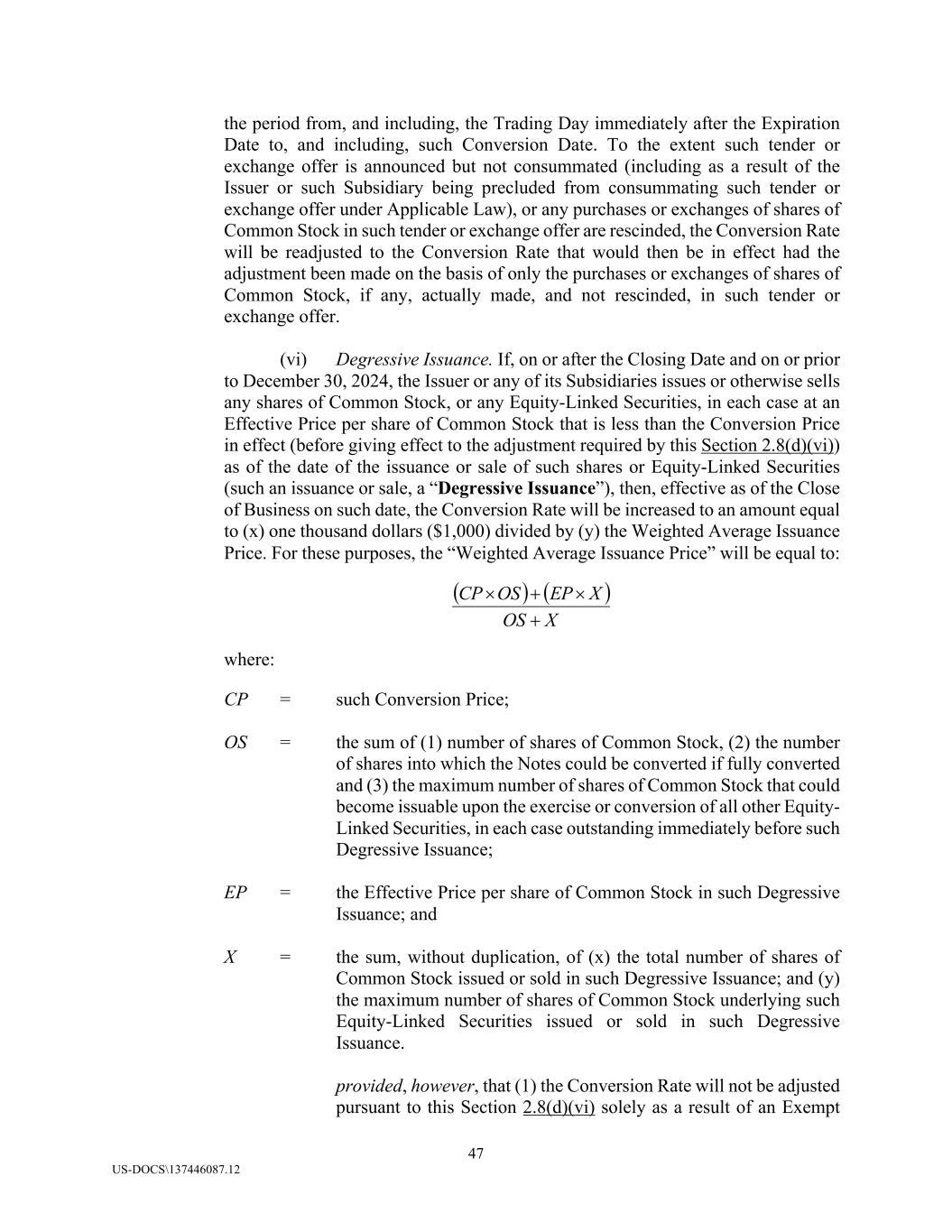 39 US-DOCS\137446087.12 (iii) The Issuer will deliver the shares of Common Stock due upon the conversion of any Note to the Purchaser on or before the second Business Day immediately after the Conversion Date for such conversion. (iv) At all times when any Notes are outstanding, the Issuer will reserve, out of its authorized but unissued and unreserved shares of Common Stock, a number of shares of Common Stock sufficient to permit the conversion of all then- outstanding Notes, assuming the Conversion Rate is increased by the maximum amount pursuant to which the Conversion Rate may be increased pursuant to Section 2.9. (v) Each Conversion Share delivered upon conversion of any Note will be duly and validly issued, fully paid, non-assessable, free from preemptive rights, and free of any Lien (except to the extent of any Lien created by the action or inaction of the Purchaser holding such Note or the Person to whom such Conversion Share will be delivered). If the Common Stock is then listed on any securities exchange, or quoted on any inter-dealer quotation system, then the Issuer will cause each Conversion Share, when delivered upon conversion of any Note, to be admitted for listing on such exchange or quotation on such system. (vi) Upon conversion, a Purchaser shall not receive any separate cash payment for accrued and unpaid interest, if any. The Issuer’s delivery of the Conversion Shares shall be deemed to satisfy in full its obligation to pay the principal amount of the Note and accrued and unpaid interest, if any, to, but excluding, the relevant Conversion Date. As a result, accrued and unpaid interest, if any (other than, for the avoidance of doubt, PIK Interest), to, and including, the relevant Conversion Date shall be deemed to be paid in full rather than cancelled, extinguished, or forfeited. (d) Adjustments to the Conversion Rate. The Conversion Rate will be adjusted from time to time as follows (for the avoidance of doubt, the Transactions shall not be deemed to result in any adjustment to the Conversion Rate): (i) Stock Dividends, Splits, and Combinations. If the Issuer issues solely shares of Common Stock as a dividend or distribution on all or substantially all shares of the Common Stock, or if the Issuer effects a stock split or a stock combination of the Common Stock (in each case, excluding an issuance solely pursuant to a Common Stock Change Event, as to which Section 2.10 will apply), then the Conversion Rate will be adjusted based on the following formula: where: CR0 = the Conversion Rate in effect immediately before the Close of Business on the Record Date for such dividend or distribution, or 0 1 01 OS OSCRCR ´=