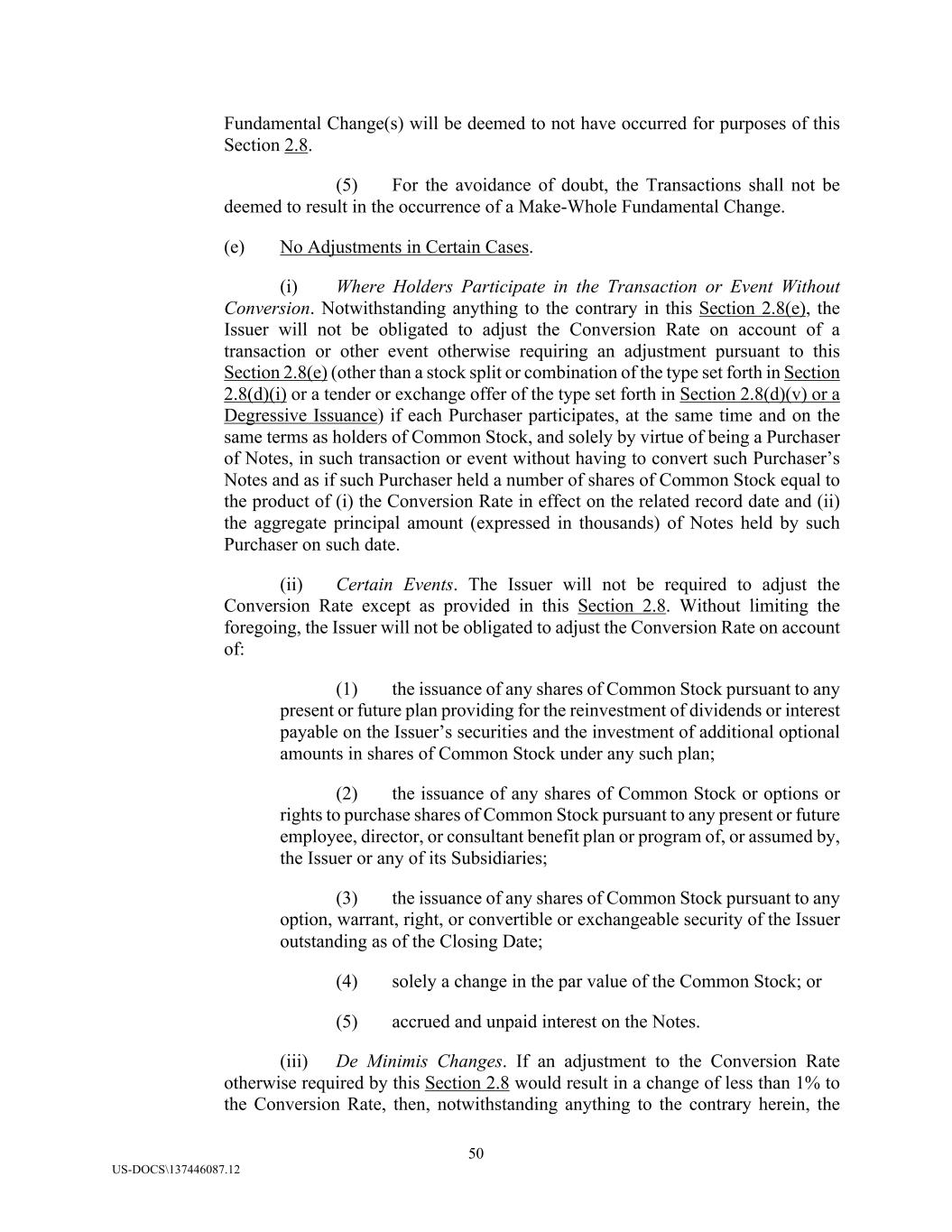 50 US-DOCS\137446087.12 Fundamental Change(s) will be deemed to not have occurred for purposes of this Section 2.8. (5) For the avoidance of doubt, the Transactions shall not be deemed to result in the occurrence of a Make-Whole Fundamental Change. (e) No Adjustments in Certain Cases. (i) Where Holders Participate in the Transaction or Event Without Conversion. Notwithstanding anything to the contrary in this Section 2.8(e), the Issuer will not be obligated to adjust the Conversion Rate on account of a transaction or other event otherwise requiring an adjustment pursuant to this Section 2.8(e) (other than a stock split or combination of the type set forth in Section 2.8(d)(i) or a tender or exchange offer of the type set forth in Section 2.8(d)(v) or a Degressive Issuance) if each Purchaser participates, at the same time and on the same terms as holders of Common Stock, and solely by virtue of being a Purchaser of Notes, in such transaction or event without having to convert such Purchaser’s Notes and as if such Purchaser held a number of shares of Common Stock equal to the product of (i) the Conversion Rate in effect on the related record date and (ii) the aggregate principal amount (expressed in thousands) of Notes held by such Purchaser on such date. (ii) Certain Events. The Issuer will not be required to adjust the Conversion Rate except as provided in this Section 2.8. Without limiting the foregoing, the Issuer will not be obligated to adjust the Conversion Rate on account of: (1) the issuance of any shares of Common Stock pursuant to any present or future plan providing for the reinvestment of dividends or interest payable on the Issuer’s securities and the investment of additional optional amounts in shares of Common Stock under any such plan; (2) the issuance of any shares of Common Stock or options or rights to purchase shares of Common Stock pursuant to any present or future employee, director, or consultant benefit plan or program of, or assumed by, the Issuer or any of its Subsidiaries; (3) the issuance of any shares of Common Stock pursuant to any option, warrant, right, or convertible or exchangeable security of the Issuer outstanding as of the Closing Date; (4) solely a change in the par value of the Common Stock; or (5) accrued and unpaid interest on the Notes. (iii) De Minimis Changes. If an adjustment to the Conversion Rate otherwise required by this Section 2.8 would result in a change of less than 1% to the Conversion Rate, then, notwithstanding anything to the contrary herein, the
