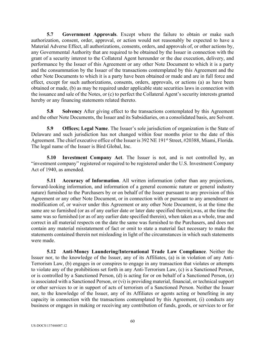 60 US-DOCS\137446087.12 5.7 Government Approvals. Except where the failure to obtain or make such authorization, consent, order, approval, or action would not reasonably be expected to have a Material Adverse Effect, all authorizations, consents, orders, and approvals of, or other actions by, any Governmental Authority that are required to be obtained by the Issuer in connection with the grant of a security interest to the Collateral Agent hereunder or the due execution, delivery, and performance by the Issuer of this Agreement or any other Note Document to which it is a party and the consummation by the Issuer of the transactions contemplated by this Agreement and the other Note Documents to which it is a party have been obtained or made and are in full force and effect, except for such authorizations, consents, orders, approvals, or actions (a) as have been obtained or made, (b) as may be required under applicable state securities laws in connection with the issuance and sale of the Notes, or (c) to perfect the Collateral Agent’s security interests granted hereby or any financing statements related thereto. 5.8 Solvency After giving effect to the transactions contemplated by this Agreement and the other Note Documents, the Issuer and its Subsidiaries, on a consolidated basis, are Solvent. 5.9 Offices; Legal Name. The Issuer’s sole jurisdiction of organization is the State of Delaware and such jurisdiction has not changed within four months prior to the date of this Agreement. The chief executive office of the Issuer is 392 NE 191st Street, #20388, Miami, Florida. The legal name of the Issuer is Bird Global, Inc. 5.10 Investment Company Act. The Issuer is not, and is not controlled by, an “investment company” registered or required to be registered under the U.S. Investment Company Act of 1940, as amended. 5.11 Accuracy of Information. All written information (other than any projections, forward-looking information, and information of a general economic nature or general industry nature) furnished to the Purchasers by or on behalf of the Issuer pursuant to any provision of this Agreement or any other Note Document, or in connection with or pursuant to any amendment or modification of, or waiver under this Agreement or any other Note Document, is at the time the same are so furnished (or as of any earlier date or later date specified therein),was, at the time the same was so furnished (or as of any earlier date specified therein), when taken as a whole, true and correct in all material respects on the date the same was furnished to the Purchasers, and does not contain any material misstatement of fact or omit to state a material fact necessary to make the statements contained therein not misleading in light of the circumstances in which such statements were made. 5.12 Anti-Money Laundering/International Trade Law Compliance. Neither the Issuer nor, to the knowledge of the Issuer, any of its Affiliates, (a) is in violation of any Anti- Terrorism Law, (b) engages in or conspires to engage in any transaction that violates or attempts to violate any of the prohibitions set forth in any Anti-Terrorism Law, (c) is a Sanctioned Person, or is controlled by a Sanctioned Person, (d) is acting for or on behalf of a Sanctioned Person, (e) is associated with a Sanctioned Person, or (vi) is providing material, financial, or technical support or other services to or in support of acts of terrorism of a Sanctioned Person. Neither the Issuer nor, to the knowledge of the Issuer, any of its Affiliates or agents acting or benefiting in any capacity in connection with the transactions contemplated by this Agreement, (i) conducts any business or engages in making or receiving any contribution of funds, goods, or services to or for
