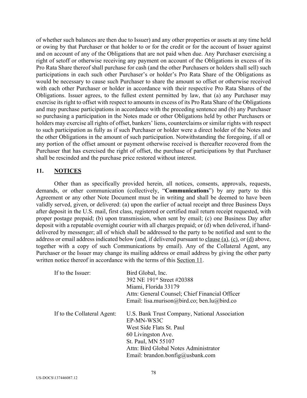 78 US-DOCS\137446087.12 of whether such balances are then due to Issuer) and any other properties or assets at any time held or owing by that Purchaser or that holder to or for the credit or for the account of Issuer against and on account of any of the Obligations that are not paid when due. Any Purchaser exercising a right of setoff or otherwise receiving any payment on account of the Obligations in excess of its Pro Rata Share thereof shall purchase for cash (and the other Purchasers or holders shall sell) such participations in each such other Purchaser’s or holder’s Pro Rata Share of the Obligations as would be necessary to cause such Purchaser to share the amount so offset or otherwise received with each other Purchaser or holder in accordance with their respective Pro Rata Shares of the Obligations. Issuer agrees, to the fullest extent permitted by law, that (a) any Purchaser may exercise its right to offset with respect to amounts in excess of its Pro Rata Share of the Obligations and may purchase participations in accordance with the preceding sentence and (b) any Purchaser so purchasing a participation in the Notes made or other Obligations held by other Purchasers or holders may exercise all rights of offset, bankers’ liens, counterclaims or similar rights with respect to such participation as fully as if such Purchaser or holder were a direct holder of the Notes and the other Obligations in the amount of such participation. Notwithstanding the foregoing, if all or any portion of the offset amount or payment otherwise received is thereafter recovered from the Purchaser that has exercised the right of offset, the purchase of participations by that Purchaser shall be rescinded and the purchase price restored without interest. 11. NOTICES Other than as specifically provided herein, all notices, consents, approvals, requests, demands, or other communication (collectively, “Communications”) by any party to this Agreement or any other Note Document must be in writing and shall be deemed to have been validly served, given, or delivered: (a) upon the earlier of actual receipt and three Business Days after deposit in the U.S. mail, first class, registered or certified mail return receipt requested, with proper postage prepaid; (b) upon transmission, when sent by email; (c) one Business Day after deposit with a reputable overnight courier with all charges prepaid; or (d) when delivered, if hand- delivered by messenger; all of which shall be addressed to the party to be notified and sent to the address or email address indicated below (and, if delivered pursuant to clause (a), (c), or (d) above, together with a copy of such Communications by email). Any of the Collateral Agent, any Purchaser or the Issuer may change its mailing address or email address by giving the other party written notice thereof in accordance with the terms of this Section 11. If to the Issuer: Bird Global, Inc. 392 NE 191st Street #20388 Miami, Florida 33179 Attn: General Counsel; Chief Financial Officer Email: lisa.murison@bird.co; ben.lu@bird.co If to the Collateral Agent: U.S. Bank Trust Company, National Association EP-MN-WS3C West Side Flats St. Paul 60 Livingston Ave. St. Paul, MN 55107 Attn: Bird Global Notes Administrator Email: brandon.bonfig@usbank.com