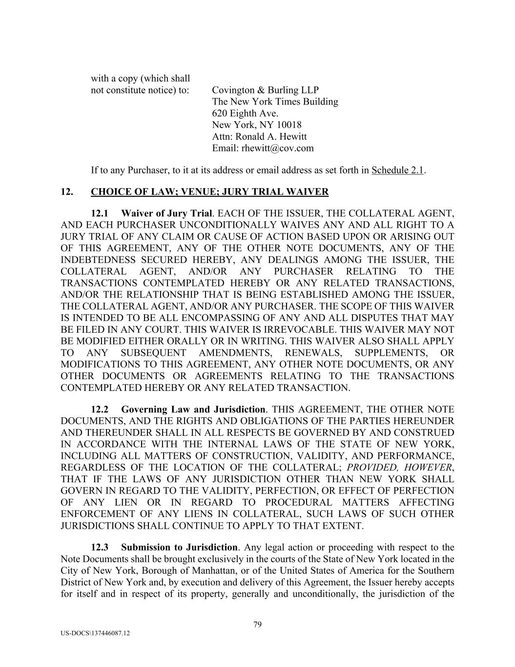 79 US-DOCS\137446087.12 with a copy (which shall not constitute notice) to: Covington & Burling LLP The New York Times Building 620 Eighth Ave. New York, NY 10018 Attn: Ronald A. Hewitt Email: rhewitt@cov.com If to any Purchaser, to it at its address or email address as set forth in Schedule 2.1. 12. CHOICE OF LAW; VENUE; JURY TRIAL WAIVER 12.1 Waiver of Jury Trial. EACH OF THE ISSUER, THE COLLATERAL AGENT, AND EACH PURCHASER UNCONDITIONALLY WAIVES ANY AND ALL RIGHT TO A JURY TRIAL OF ANY CLAIM OR CAUSE OF ACTION BASED UPON OR ARISING OUT OF THIS AGREEMENT, ANY OF THE OTHER NOTE DOCUMENTS, ANY OF THE INDEBTEDNESS SECURED HEREBY, ANY DEALINGS AMONG THE ISSUER, THE COLLATERAL AGENT, AND/OR ANY PURCHASER RELATING TO THE TRANSACTIONS CONTEMPLATED HEREBY OR ANY RELATED TRANSACTIONS, AND/OR THE RELATIONSHIP THAT IS BEING ESTABLISHED AMONG THE ISSUER, THE COLLATERAL AGENT, AND/OR ANY PURCHASER. THE SCOPE OF THIS WAIVER IS INTENDED TO BE ALL ENCOMPASSING OF ANY AND ALL DISPUTES THAT MAY BE FILED IN ANY COURT. THIS WAIVER IS IRREVOCABLE. THIS WAIVER MAY NOT BE MODIFIED EITHER ORALLY OR IN WRITING. THIS WAIVER ALSO SHALL APPLY TO ANY SUBSEQUENT AMENDMENTS, RENEWALS, SUPPLEMENTS, OR MODIFICATIONS TO THIS AGREEMENT, ANY OTHER NOTE DOCUMENTS, OR ANY OTHER DOCUMENTS OR AGREEMENTS RELATING TO THE TRANSACTIONS CONTEMPLATED HEREBY OR ANY RELATED TRANSACTION. 12.2 Governing Law and Jurisdiction. THIS AGREEMENT, THE OTHER NOTE DOCUMENTS, AND THE RIGHTS AND OBLIGATIONS OF THE PARTIES HEREUNDER AND THEREUNDER SHALL IN ALL RESPECTS BE GOVERNED BY AND CONSTRUED IN ACCORDANCE WITH THE INTERNAL LAWS OF THE STATE OF NEW YORK, INCLUDING ALL MATTERS OF CONSTRUCTION, VALIDITY, AND PERFORMANCE, REGARDLESS OF THE LOCATION OF THE COLLATERAL; PROVIDED, HOWEVER, THAT IF THE LAWS OF ANY JURISDICTION OTHER THAN NEW YORK SHALL GOVERN IN REGARD TO THE VALIDITY, PERFECTION, OR EFFECT OF PERFECTION OF ANY LIEN OR IN REGARD TO PROCEDURAL MATTERS AFFECTING ENFORCEMENT OF ANY LIENS IN COLLATERAL, SUCH LAWS OF SUCH OTHER JURISDICTIONS SHALL CONTINUE TO APPLY TO THAT EXTENT. 12.3 Submission to Jurisdiction. Any legal action or proceeding with respect to the Note Documents shall be brought exclusively in the courts of the State of New York located in the City of New York, Borough of Manhattan, or of the United States of America for the Southern District of New York and, by execution and delivery of this Agreement, the Issuer hereby accepts for itself and in respect of its property, generally and unconditionally, the jurisdiction of the