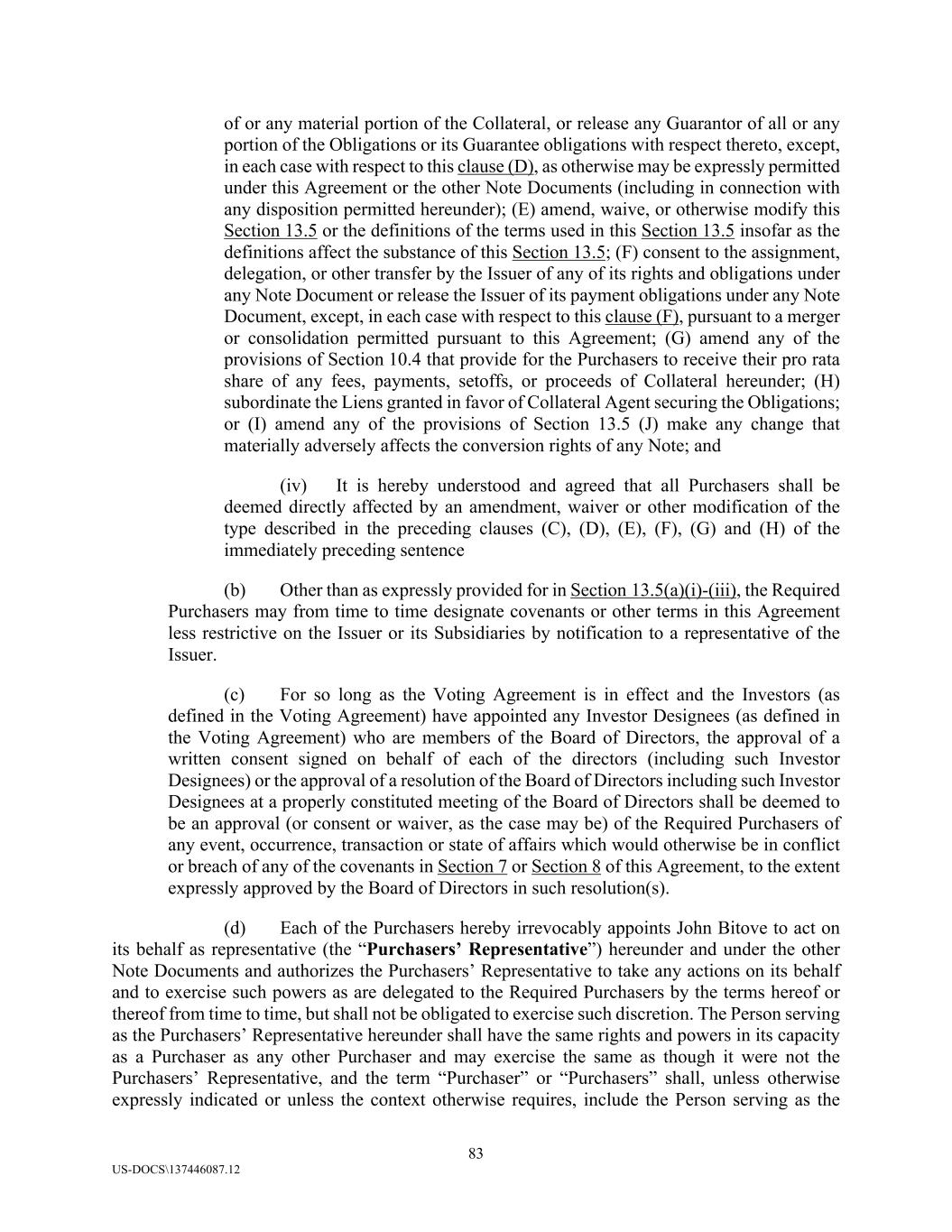 83 US-DOCS\137446087.12 of or any material portion of the Collateral, or release any Guarantor of all or any portion of the Obligations or its Guarantee obligations with respect thereto, except, in each case with respect to this clause (D), as otherwise may be expressly permitted under this Agreement or the other Note Documents (including in connection with any disposition permitted hereunder); (E) amend, waive, or otherwise modify this Section 13.5 or the definitions of the terms used in this Section 13.5 insofar as the definitions affect the substance of this Section 13.5; (F) consent to the assignment, delegation, or other transfer by the Issuer of any of its rights and obligations under any Note Document or release the Issuer of its payment obligations under any Note Document, except, in each case with respect to this clause (F), pursuant to a merger or consolidation permitted pursuant to this Agreement; (G) amend any of the provisions of Section 10.4 that provide for the Purchasers to receive their pro rata share of any fees, payments, setoffs, or proceeds of Collateral hereunder; (H) subordinate the Liens granted in favor of Collateral Agent securing the Obligations; or (I) amend any of the provisions of Section 13.5 (J) make any change that materially adversely affects the conversion rights of any Note; and (iv) It is hereby understood and agreed that all Purchasers shall be deemed directly affected by an amendment, waiver or other modification of the type described in the preceding clauses (C), (D), (E), (F), (G) and (H) of the immediately preceding sentence (b) Other than as expressly provided for in Section 13.5(a)(i)-(iii), the Required Purchasers may from time to time designate covenants or other terms in this Agreement less restrictive on the Issuer or its Subsidiaries by notification to a representative of the Issuer. (c) For so long as the Voting Agreement is in effect and the Investors (as defined in the Voting Agreement) have appointed any Investor Designees (as defined in the Voting Agreement) who are members of the Board of Directors, the approval of a written consent signed on behalf of each of the directors (including such Investor Designees) or the approval of a resolution of the Board of Directors including such Investor Designees at a properly constituted meeting of the Board of Directors shall be deemed to be an approval (or consent or waiver, as the case may be) of the Required Purchasers of any event, occurrence, transaction or state of affairs which would otherwise be in conflict or breach of any of the covenants in Section 7 or Section 8 of this Agreement, to the extent expressly approved by the Board of Directors in such resolution(s). (d) Each of the Purchasers hereby irrevocably appoints John Bitove to act on its behalf as representative (the “Purchasers’ Representative”) hereunder and under the other Note Documents and authorizes the Purchasers’ Representative to take any actions on its behalf and to exercise such powers as are delegated to the Required Purchasers by the terms hereof or thereof from time to time, but shall not be obligated to exercise such discretion. The Person serving as the Purchasers’ Representative hereunder shall have the same rights and powers in its capacity as a Purchaser as any other Purchaser and may exercise the same as though it were not the Purchasers’ Representative, and the term “Purchaser” or “Purchasers” shall, unless otherwise expressly indicated or unless the context otherwise requires, include the Person serving as the