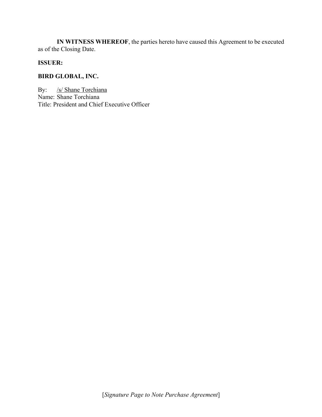 [Signature Page to Note Purchase Agreement] IN WITNESS WHEREOF, the parties hereto have caused this Agreement to be executed as of the Closing Date. ISSUER: BIRD GLOBAL, INC. By: /s/ Shane Torchiana Name: Shane Torchiana Title: President and Chief Executive Officer