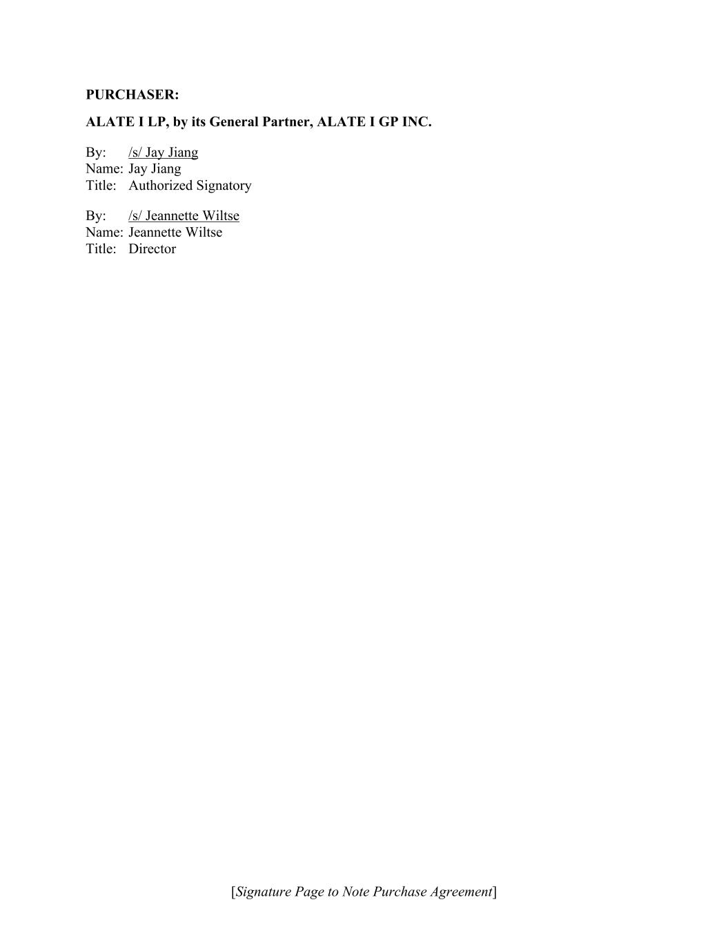 [Signature Page to Note Purchase Agreement] PURCHASER: ALATE I LP, by its General Partner, ALATE I GP INC. By: /s/ Jay Jiang Name: Jay Jiang Title: Authorized Signatory By: /s/ Jeannette Wiltse Name: Jeannette Wiltse Title: Director