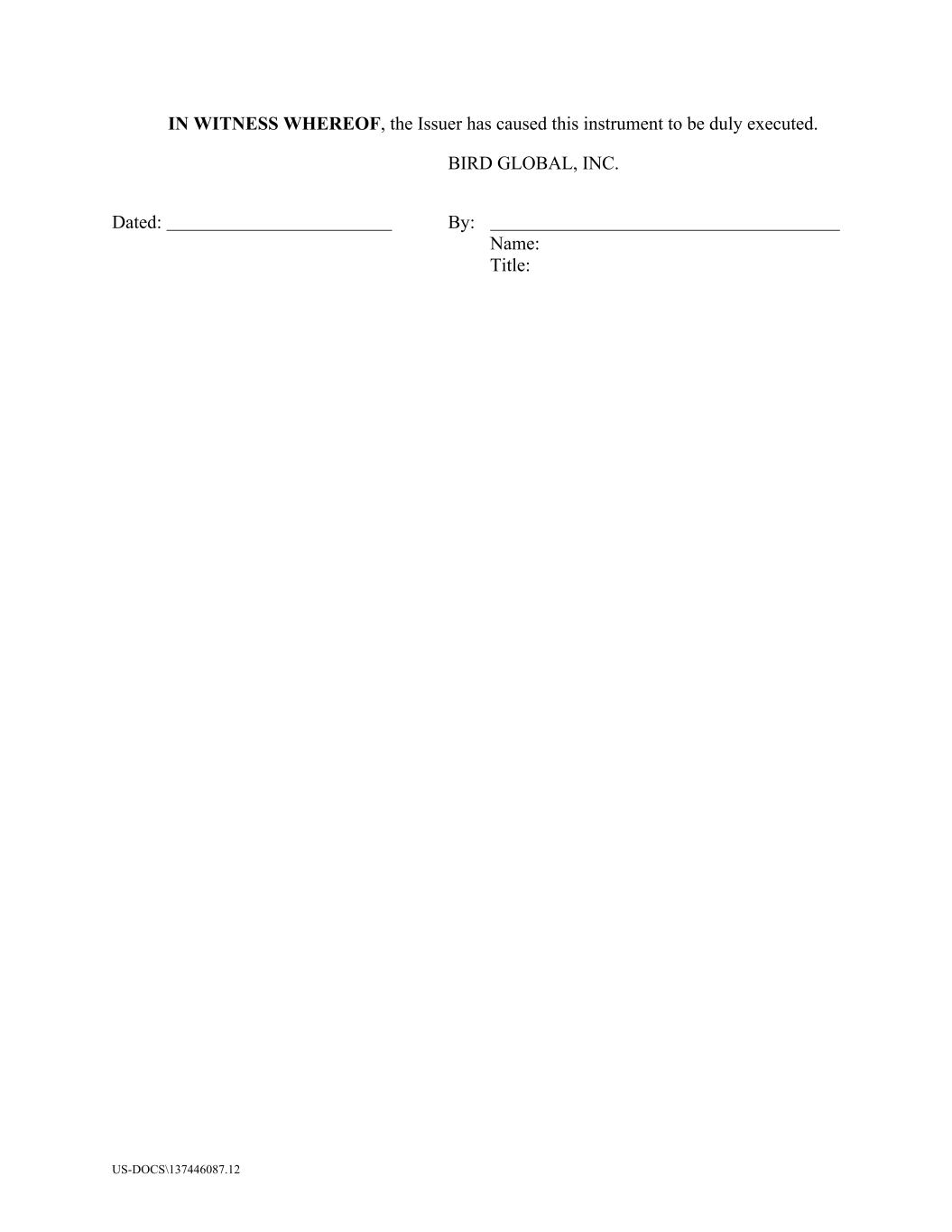 US-DOCS\137446087.12 IN WITNESS WHEREOF, the Issuer has caused this instrument to be duly executed. BIRD GLOBAL, INC. Dated: By: Name: Title:
