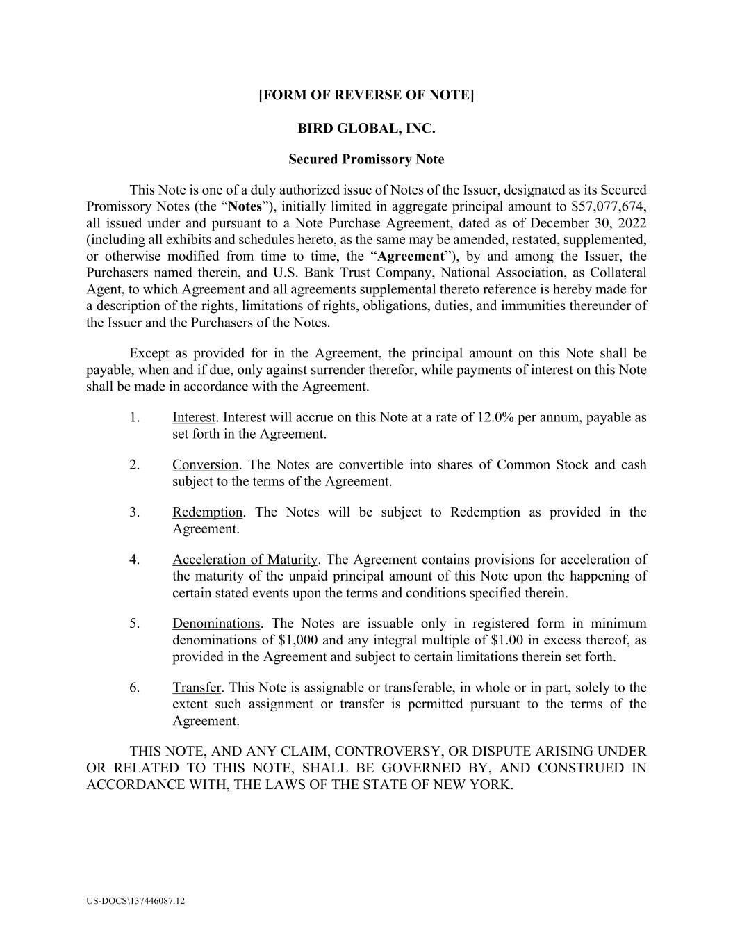 US-DOCS\137446087.12 [FORM OF REVERSE OF NOTE] BIRD GLOBAL, INC. Secured Promissory Note This Note is one of a duly authorized issue of Notes of the Issuer, designated as its Secured Promissory Notes (the “Notes”), initially limited in aggregate principal amount to $57,077,674, all issued under and pursuant to a Note Purchase Agreement, dated as of December 30, 2022 (including all exhibits and schedules hereto, as the same may be amended, restated, supplemented, or otherwise modified from time to time, the “Agreement”), by and among the Issuer, the Purchasers named therein, and U.S. Bank Trust Company, National Association, as Collateral Agent, to which Agreement and all agreements supplemental thereto reference is hereby made for a description of the rights, limitations of rights, obligations, duties, and immunities thereunder of the Issuer and the Purchasers of the Notes. Except as provided for in the Agreement, the principal amount on this Note shall be payable, when and if due, only against surrender therefor, while payments of interest on this Note shall be made in accordance with the Agreement. 1. Interest. Interest will accrue on this Note at a rate of 12.0% per annum, payable as set forth in the Agreement. 2. Conversion. The Notes are convertible into shares of Common Stock and cash subject to the terms of the Agreement. 3. Redemption. The Notes will be subject to Redemption as provided in the Agreement. 4. Acceleration of Maturity. The Agreement contains provisions for acceleration of the maturity of the unpaid principal amount of this Note upon the happening of certain stated events upon the terms and conditions specified therein. 5. Denominations. The Notes are issuable only in registered form in minimum denominations of $1,000 and any integral multiple of $1.00 in excess thereof, as provided in the Agreement and subject to certain limitations therein set forth. 6. Transfer. This Note is assignable or transferable, in whole or in part, solely to the extent such assignment or transfer is permitted pursuant to the terms of the Agreement. THIS NOTE, AND ANY CLAIM, CONTROVERSY, OR DISPUTE ARISING UNDER OR RELATED TO THIS NOTE, SHALL BE GOVERNED BY, AND CONSTRUED IN ACCORDANCE WITH, THE LAWS OF THE STATE OF NEW YORK.