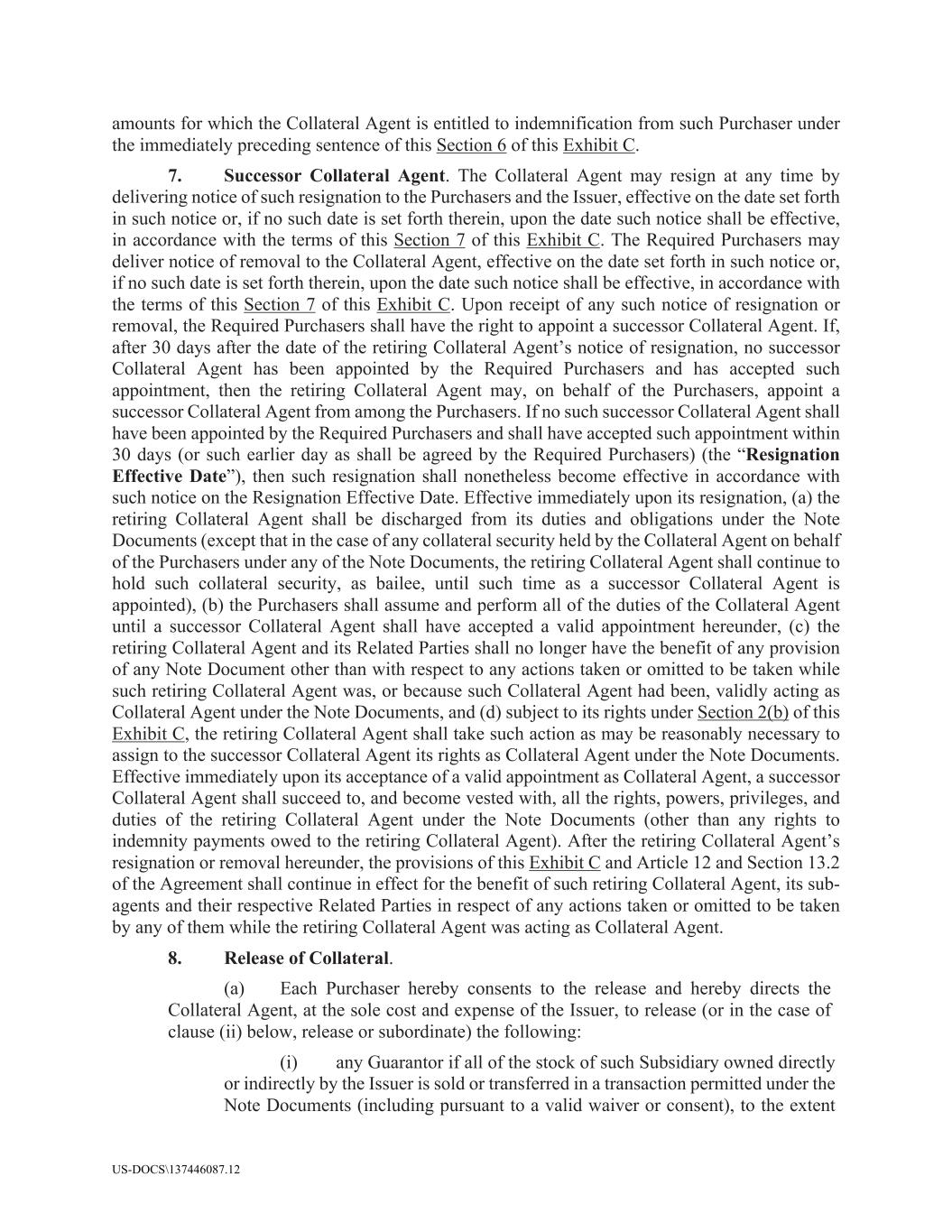 US-DOCS\137446087.12 amounts for which the Collateral Agent is entitled to indemnification from such Purchaser under the immediately preceding sentence of this Section 6 of this Exhibit C. 7. Successor Collateral Agent. The Collateral Agent may resign at any time by delivering notice of such resignation to the Purchasers and the Issuer, effective on the date set forth in such notice or, if no such date is set forth therein, upon the date such notice shall be effective, in accordance with the terms of this Section 7 of this Exhibit C. The Required Purchasers may deliver notice of removal to the Collateral Agent, effective on the date set forth in such notice or, if no such date is set forth therein, upon the date such notice shall be effective, in accordance with the terms of this Section 7 of this Exhibit C. Upon receipt of any such notice of resignation or removal, the Required Purchasers shall have the right to appoint a successor Collateral Agent. If, after 30 days after the date of the retiring Collateral Agent’s notice of resignation, no successor Collateral Agent has been appointed by the Required Purchasers and has accepted such appointment, then the retiring Collateral Agent may, on behalf of the Purchasers, appoint a successor Collateral Agent from among the Purchasers. If no such successor Collateral Agent shall have been appointed by the Required Purchasers and shall have accepted such appointment within 30 days (or such earlier day as shall be agreed by the Required Purchasers) (the “Resignation Effective Date”), then such resignation shall nonetheless become effective in accordance with such notice on the Resignation Effective Date. Effective immediately upon its resignation, (a) the retiring Collateral Agent shall be discharged from its duties and obligations under the Note Documents (except that in the case of any collateral security held by the Collateral Agent on behalf of the Purchasers under any of the Note Documents, the retiring Collateral Agent shall continue to hold such collateral security, as bailee, until such time as a successor Collateral Agent is appointed), (b) the Purchasers shall assume and perform all of the duties of the Collateral Agent until a successor Collateral Agent shall have accepted a valid appointment hereunder, (c) the retiring Collateral Agent and its Related Parties shall no longer have the benefit of any provision of any Note Document other than with respect to any actions taken or omitted to be taken while such retiring Collateral Agent was, or because such Collateral Agent had been, validly acting as Collateral Agent under the Note Documents, and (d) subject to its rights under Section 2(b) of this Exhibit C, the retiring Collateral Agent shall take such action as may be reasonably necessary to assign to the successor Collateral Agent its rights as Collateral Agent under the Note Documents. Effective immediately upon its acceptance of a valid appointment as Collateral Agent, a successor Collateral Agent shall succeed to, and become vested with, all the rights, powers, privileges, and duties of the retiring Collateral Agent under the Note Documents (other than any rights to indemnity payments owed to the retiring Collateral Agent). After the retiring Collateral Agent’s resignation or removal hereunder, the provisions of this Exhibit C and Article 12 and Section 13.2 of the Agreement shall continue in effect for the benefit of such retiring Collateral Agent, its sub- agents and their respective Related Parties in respect of any actions taken or omitted to be taken by any of them while the retiring Collateral Agent was acting as Collateral Agent. 8. Release of Collateral. (a) Each Purchaser hereby consents to the release and hereby directs the Collateral Agent, at the sole cost and expense of the Issuer, to release (or in the case of clause (ii) below, release or subordinate) the following: (i) any Guarantor if all of the stock of such Subsidiary owned directly or indirectly by the Issuer is sold or transferred in a transaction permitted under the Note Documents (including pursuant to a valid waiver or consent), to the extent