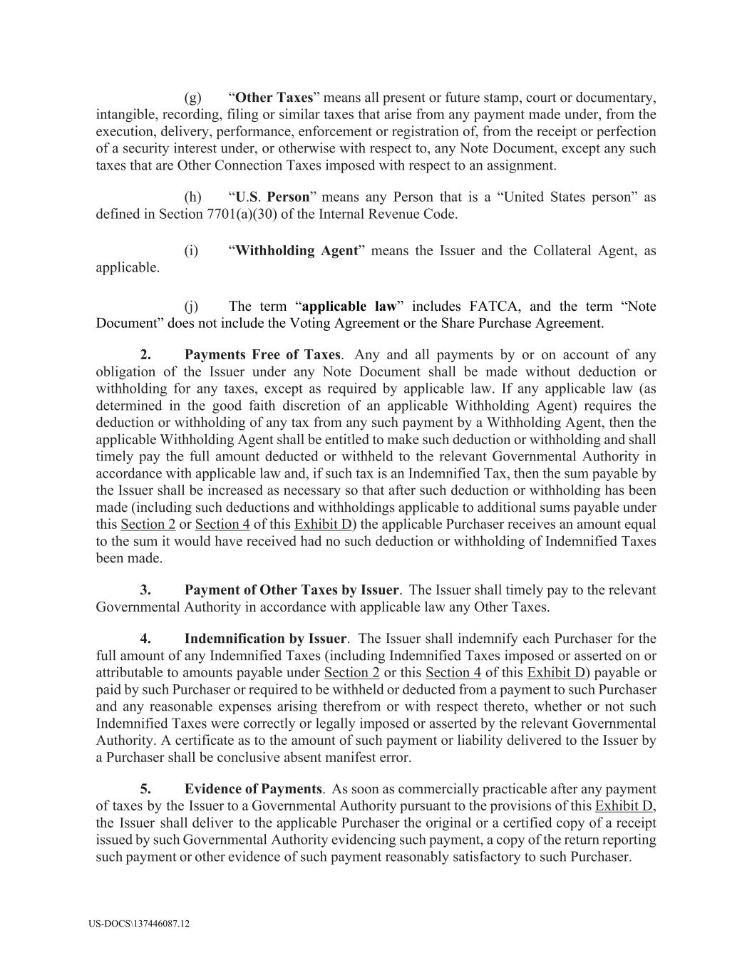 US-DOCS\137446087.12 (g) “Other Taxes” means all present or future stamp, court or documentary, intangible, recording, filing or similar taxes that arise from any payment made under, from the execution, delivery, performance, enforcement or registration of, from the receipt or perfection of a security interest under, or otherwise with respect to, any Note Document, except any such taxes that are Other Connection Taxes imposed with respect to an assignment. (h) “U.S. Person” means any Person that is a “United States person” as defined in Section 7701(a)(30) of the Internal Revenue Code. (i) “Withholding Agent” means the Issuer and the Collateral Agent, as applicable. (j) The term “applicable law” includes FATCA, and the term “Note Document” does not include the Voting Agreement or the Share Purchase Agreement. 2. Payments Free of Taxes. Any and all payments by or on account of any obligation of the Issuer under any Note Document shall be made without deduction or withholding for any taxes, except as required by applicable law. If any applicable law (as determined in the good faith discretion of an applicable Withholding Agent) requires the deduction or withholding of any tax from any such payment by a Withholding Agent, then the applicable Withholding Agent shall be entitled to make such deduction or withholding and shall timely pay the full amount deducted or withheld to the relevant Governmental Authority in accordance with applicable law and, if such tax is an Indemnified Tax, then the sum payable by the Issuer shall be increased as necessary so that after such deduction or withholding has been made (including such deductions and withholdings applicable to additional sums payable under this Section 2 or Section 4 of this Exhibit D) the applicable Purchaser receives an amount equal to the sum it would have received had no such deduction or withholding of Indemnified Taxes been made. 3. Payment of Other Taxes by Issuer. The Issuer shall timely pay to the relevant Governmental Authority in accordance with applicable law any Other Taxes. 4. Indemnification by Issuer. The Issuer shall indemnify each Purchaser for the full amount of any Indemnified Taxes (including Indemnified Taxes imposed or asserted on or attributable to amounts payable under Section 2 or this Section 4 of this Exhibit D) payable or paid by such Purchaser or required to be withheld or deducted from a payment to such Purchaser and any reasonable expenses arising therefrom or with respect thereto, whether or not such Indemnified Taxes were correctly or legally imposed or asserted by the relevant Governmental Authority. A certificate as to the amount of such payment or liability delivered to the Issuer by a Purchaser shall be conclusive absent manifest error. 5. Evidence of Payments. As soon as commercially practicable after any payment of taxes by the Issuer to a Governmental Authority pursuant to the provisions of this Exhibit D, the Issuer shall deliver to the applicable Purchaser the original or a certified copy of a receipt issued by such Governmental Authority evidencing such payment, a copy of the return reporting such payment or other evidence of such payment reasonably satisfactory to such Purchaser.