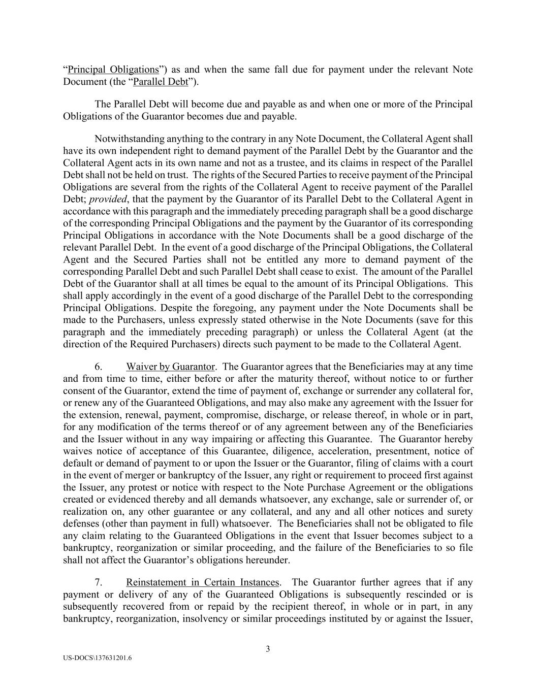 3 US-DOCS\137631201.6 “Principal Obligations”) as and when the same fall due for payment under the relevant Note Document (the “Parallel Debt”). The Parallel Debt will become due and payable as and when one or more of the Principal Obligations of the Guarantor becomes due and payable. Notwithstanding anything to the contrary in any Note Document, the Collateral Agent shall have its own independent right to demand payment of the Parallel Debt by the Guarantor and the Collateral Agent acts in its own name and not as a trustee, and its claims in respect of the Parallel Debt shall not be held on trust. The rights of the Secured Parties to receive payment of the Principal Obligations are several from the rights of the Collateral Agent to receive payment of the Parallel Debt; provided, that the payment by the Guarantor of its Parallel Debt to the Collateral Agent in accordance with this paragraph and the immediately preceding paragraph shall be a good discharge of the corresponding Principal Obligations and the payment by the Guarantor of its corresponding Principal Obligations in accordance with the Note Documents shall be a good discharge of the relevant Parallel Debt. In the event of a good discharge of the Principal Obligations, the Collateral Agent and the Secured Parties shall not be entitled any more to demand payment of the corresponding Parallel Debt and such Parallel Debt shall cease to exist. The amount of the Parallel Debt of the Guarantor shall at all times be equal to the amount of its Principal Obligations. This shall apply accordingly in the event of a good discharge of the Parallel Debt to the corresponding Principal Obligations. Despite the foregoing, any payment under the Note Documents shall be made to the Purchasers, unless expressly stated otherwise in the Note Documents (save for this paragraph and the immediately preceding paragraph) or unless the Collateral Agent (at the direction of the Required Purchasers) directs such payment to be made to the Collateral Agent. 6. Waiver by Guarantor. The Guarantor agrees that the Beneficiaries may at any time and from time to time, either before or after the maturity thereof, without notice to or further consent of the Guarantor, extend the time of payment of, exchange or surrender any collateral for, or renew any of the Guaranteed Obligations, and may also make any agreement with the Issuer for the extension, renewal, payment, compromise, discharge, or release thereof, in whole or in part, for any modification of the terms thereof or of any agreement between any of the Beneficiaries and the Issuer without in any way impairing or affecting this Guarantee. The Guarantor hereby waives notice of acceptance of this Guarantee, diligence, acceleration, presentment, notice of default or demand of payment to or upon the Issuer or the Guarantor, filing of claims with a court in the event of merger or bankruptcy of the Issuer, any right or requirement to proceed first against the Issuer, any protest or notice with respect to the Note Purchase Agreement or the obligations created or evidenced thereby and all demands whatsoever, any exchange, sale or surrender of, or realization on, any other guarantee or any collateral, and any and all other notices and surety defenses (other than payment in full) whatsoever. The Beneficiaries shall not be obligated to file any claim relating to the Guaranteed Obligations in the event that Issuer becomes subject to a bankruptcy, reorganization or similar proceeding, and the failure of the Beneficiaries to so file shall not affect the Guarantor’s obligations hereunder. 7. Reinstatement in Certain Instances. The Guarantor further agrees that if any payment or delivery of any of the Guaranteed Obligations is subsequently rescinded or is subsequently recovered from or repaid by the recipient thereof, in whole or in part, in any bankruptcy, reorganization, insolvency or similar proceedings instituted by or against the Issuer,