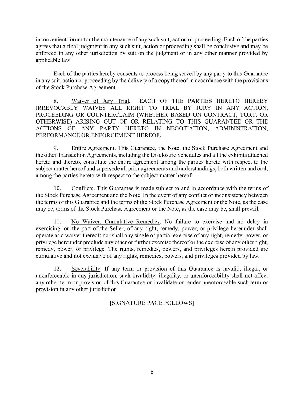 6 inconvenient forum for the maintenance of any such suit, action or proceeding. Each of the parties agrees that a final judgment in any such suit, action or proceeding shall be conclusive and may be enforced in any other jurisdiction by suit on the judgment or in any other manner provided by applicable law. Each of the parties hereby consents to process being served by any party to this Guarantee in any suit, action or proceeding by the delivery of a copy thereof in accordance with the provisions of the Stock Purchase Agreement. 8. Waiver of Jury Trial. EACH OF THE PARTIES HERETO HEREBY IRREVOCABLY WAIVES ALL RIGHT TO TRIAL BY JURY IN ANY ACTION, PROCEEDING OR COUNTERCLAIM (WHETHER BASED ON CONTRACT, TORT, OR OTHERWISE) ARISING OUT OF OR RELATING TO THIS GUARANTEE OR THE ACTIONS OF ANY PARTY HERETO IN NEGOTIATION, ADMINISTRATION, PERFORMANCE OR ENFORCEMENT HEREOF. 9. Entire Agreement. This Guarantee, the Note, the Stock Purchase Agreement and the other Transaction Agreements, including the Disclosure Schedules and all the exhibits attached hereto and thereto, constitute the entire agreement among the parties hereto with respect to the subject matter hereof and supersede all prior agreements and understandings, both written and oral, among the parties hereto with respect to the subject matter hereof. 10. Conflicts. This Guarantee is made subject to and in accordance with the terms of the Stock Purchase Agreement and the Note. In the event of any conflict or inconsistency between the terms of this Guarantee and the terms of the Stock Purchase Agreement or the Note, as the case may be, terms of the Stock Purchase Agreement or the Note, as the case may be, shall prevail. 11. No Waiver; Cumulative Remedies. No failure to exercise and no delay in exercising, on the part of the Seller, of any right, remedy, power, or privilege hereunder shall operate as a waiver thereof; nor shall any single or partial exercise of any right, remedy, power, or privilege hereunder preclude any other or further exercise thereof or the exercise of any other right, remedy, power, or privilege. The rights, remedies, powers, and privileges herein provided are cumulative and not exclusive of any rights, remedies, powers, and privileges provided by law. 12. Severability. If any term or provision of this Guarantee is invalid, illegal, or unenforceable in any jurisdiction, such invalidity, illegality, or unenforceability shall not affect any other term or provision of this Guarantee or invalidate or render unenforceable such term or provision in any other jurisdiction. [SIGNATURE PAGE FOLLOWS]