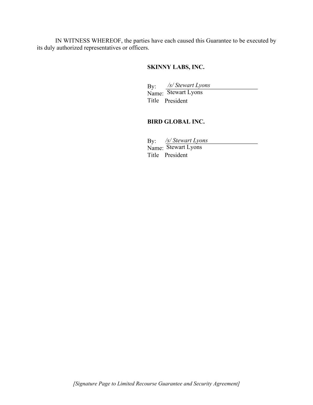 [Signature Page to Limited Recourse Guarantee and Security Agreement] IN WITNESS WHEREOF, the parties have each caused this Guarantee to be executed by its duly authorized representatives or officers. SKINNY LABS, INC. By: Name: Title BIRD GLOBAL INC. By: Name: Title Stewart Lyons President Stewart Lyons President /s/ Stewart Lyons /s/ Stewart Lyons
