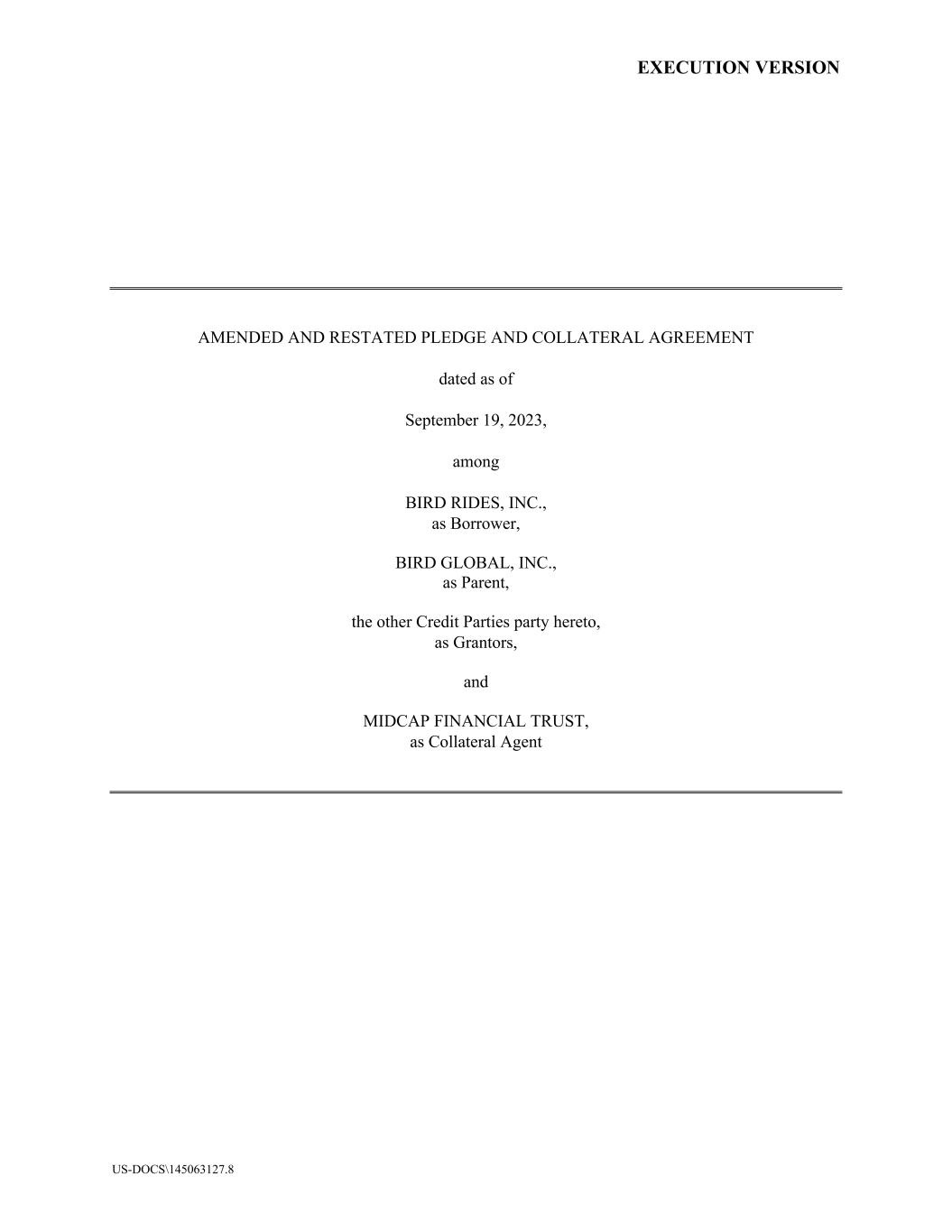 US-DOCS\145063127.8 AMENDED AND RESTATED PLEDGE AND COLLATERAL AGREEMENT dated as of September 19, 2023 (as amended, restated, supplemented or otherwise modified from time to time, this “Agreement”) among Bird Rides, Inc., a Delaware corporation (“Borrower”), Bird Global, Inc. (“Parent”), certain Affiliates of the Borrower party hereto (collectively, together with the Borrower and Parent, the “Grantors”), and MidCap Financial Trust, as Administrative Agent and as collateral agent on behalf of the Secured Parties (in such capacity, the “Collateral Agent”). Reference is made to (i) that certain Loan and Security Agreement dated as of April 27, 2021 (as amended, amended and restated, supplemented or modified from time to time, the “Existing Credit Agreement”) among Bird US Opco, LLC as borrower, Bird US Holdco, LLC, as holdco guarantor, and MidCap Financial Trust, as Administrative Agent (in such capacity, the “Administrative Agent”), (ii) that certain Guarantee, dated as of April 27, 2021 (as amended, amended and restated, supplemented or modified from time to time, the “Existing Collateral Agreement”) among Bird US Holdco, LLC (in such capacity, the “Existing Grantor”) and the Collateral Agent. WHEREAS, the parties to the Existing Credit Agreement have agreed to amend, restate, supersede and replace the Existing Credit Agreement in its entirety and in connection therewith have entered into that certain Amended and Restated Loan Agreement (as the same may be amended, restated, supplemented or otherwise modified from time to time, the “Credit Agreement”), dated as of the date hereof, by and among the Borrower, Parent, the other Credit Parties from time to time party thereto, the Lenders (as defined therein), the Administrative Agent and the other parties party thereto, which Credit Agreement provides for extensions of credit and other financial accommodations by the Lenders to the Borrower subject to the terms and conditions set forth in the Credit Agreement; WHEREAS, each Grantor party hereto is an Affiliate of the Borrower and has guaranteed the obligations of the Borrower under the Credit Agreement pursuant to the Amended and Restated Guaranty dated as of the date hereof (as amended, supplemented or modified from time to time, the “Guaranty”); and WHEREAS, each Grantor will derive substantial benefits from the extension of credit to the Borrower pursuant to the Credit Agreement and is willing to execute and deliver this Agreement in order to induce the Lenders to enter into that certain Credit Agreement and to extend such credit as contemplated thereunder. Furthermore, the Existing Grantor wishes to amend, restate, supersede and replace the terms of the Existing Collateral Agreement in their entirety by the terms and provisions of this Agreement. It is the intent of the parties hereto that this Agreement not constitute a novation of the obligations and liabilities of the parties under the Existing Collateral Agreement or the Existing Credit Agreement, but that this Agreement amend and restate in its entirety the Existing Collateral Agreement and re-evidence the obligations and liabilities of the Existing Grantor outstanding thereunder, which shall be set forth in accordance with the terms hereof. NOW, THEREFORE, the parties hereto agree as follows: ARTICLE I Definitions SECTION 1.01. Defined Terms. (a) Each capitalized term used but not defined herein shall have the meaning assigned thereto in the Credit Agreement; provided that each term defined in the New York UCC (as defined herein) and not defined in this Agreement or the Credit Agreement shall have the meaning specified in the New York UCC. The term “instrument” shall have the meaning specified in Article 9 of the New York UCC.